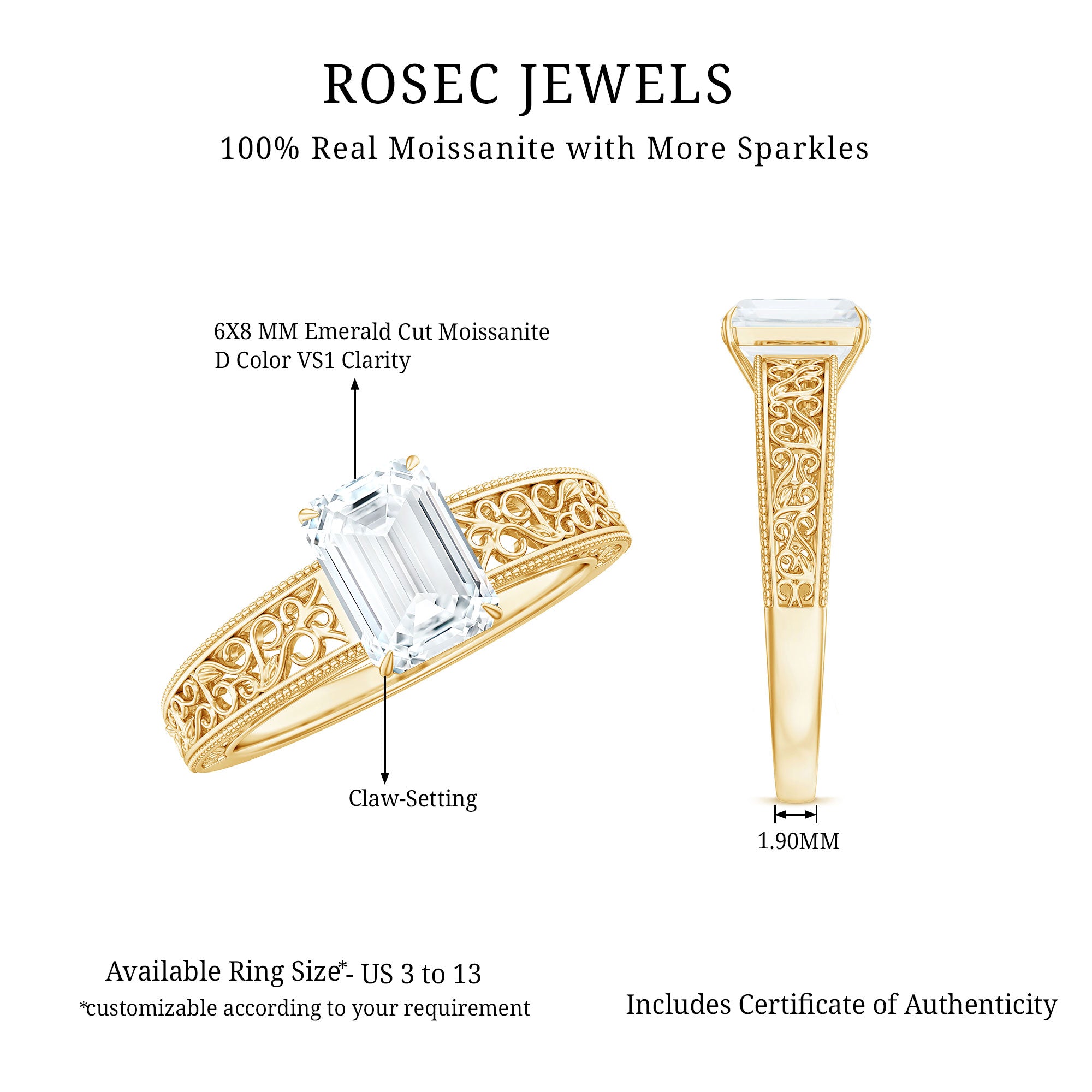 Turn heads with this exquisite Emerald Cut Moissanite Ring – where timeless elegance meets captivating brilliance. Celebrate your forever with this 6X8 MM emerald cut moissanite solitaire engagement ring, showcasing a remarkable 1.87 carat total weight with D color and VS1 clarity quality. Designed for women who appreciate sophisticated detail, this filigree engagement ring is adorned with intricate vintage-style scrollwork and beaded milgrain embellishments that echo the charm of antique jewelry engagement ring. The clarity and sparkle of the certified moissanite ring radiate luxury and finesse, set securely in a classic claw setting for maximum brilliance and security. Whether youre drawn to emerald cut antique engagement ring or looking for a blend of tradition and refinement, this piece is an emblem of lasting love. The polished craftsmanship delivers unmatched quality, making this moissanite engagement ring an ideal symbol of your most meaningful promise. Embracing the allure of vintage inspired engagement ring, this design combines heritage appeal with modern sophistication. Perfectly crafted for engagement proposals, this emerald cut solitaire ring symbolizes a new chapter of everlasting love. A proud addition to any collection of womens moissanite rings, it stands out among moissanite diamond ring as a true testament to enduring beauty and personal style. Rosec Jewels assures you to get peoples heads turned with our sparkling jewelry pieces which are authentically certified just for your peace of mind.