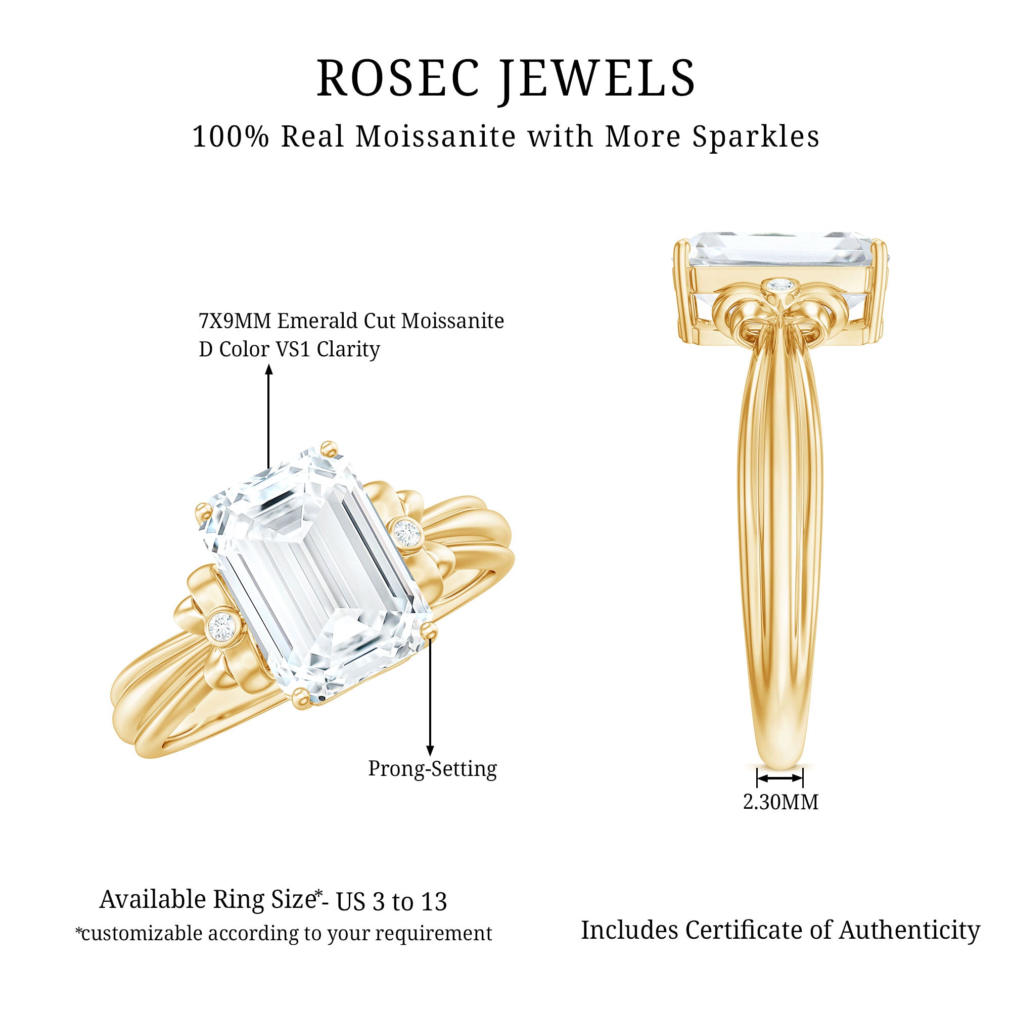 Every unforgettable love story deserves a ring that reflects its beauty, and this stunning Moissanite Engagement Ring does just that with a graceful twist of charm and sparkle. At its center sits a radiant 7X9 MM emerald cut moissanite, celebrated for its fiery brilliance and crystal clarity, offering all the glamour of a diamond with a more sustainable, ethical touch. What sets this Emerald Cut Engagement Ring apart is its cute bow-inspired design. On each side of the center stone, delicate bows adorned with petite accent stones add a playful yet elegant touch, making the entire piece feel whimsical and refined. This Designer Engagement Ring glows with an understated luxury, perfect for the woman who appreciates both timeless design and modern flair. Crafted to celebrate love in all its forms, this 2 Carat Moissanite Ring is as thoughtful as it is beautiful. Available in sizes 3 to 13 (US standard) and presented in a charming, ready-to-gift box, it is an effortless choice for proposals, anniversaries, or unforgettable moments. A shimmer of promise, a touch of grace, and a bow that ties it all together - this Emerald Cut Moissanite Solitaire Ring is more than jewelry; its a symbol of the bond you’ll cherish forever.