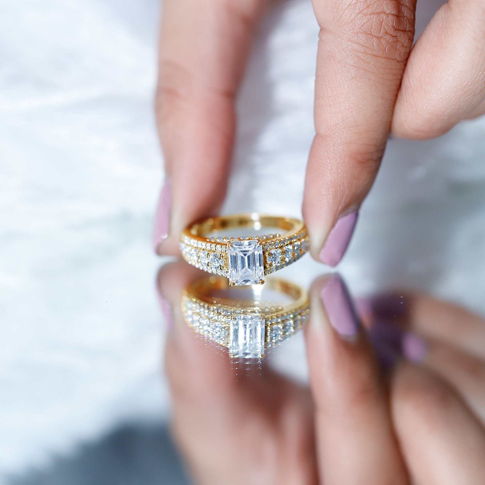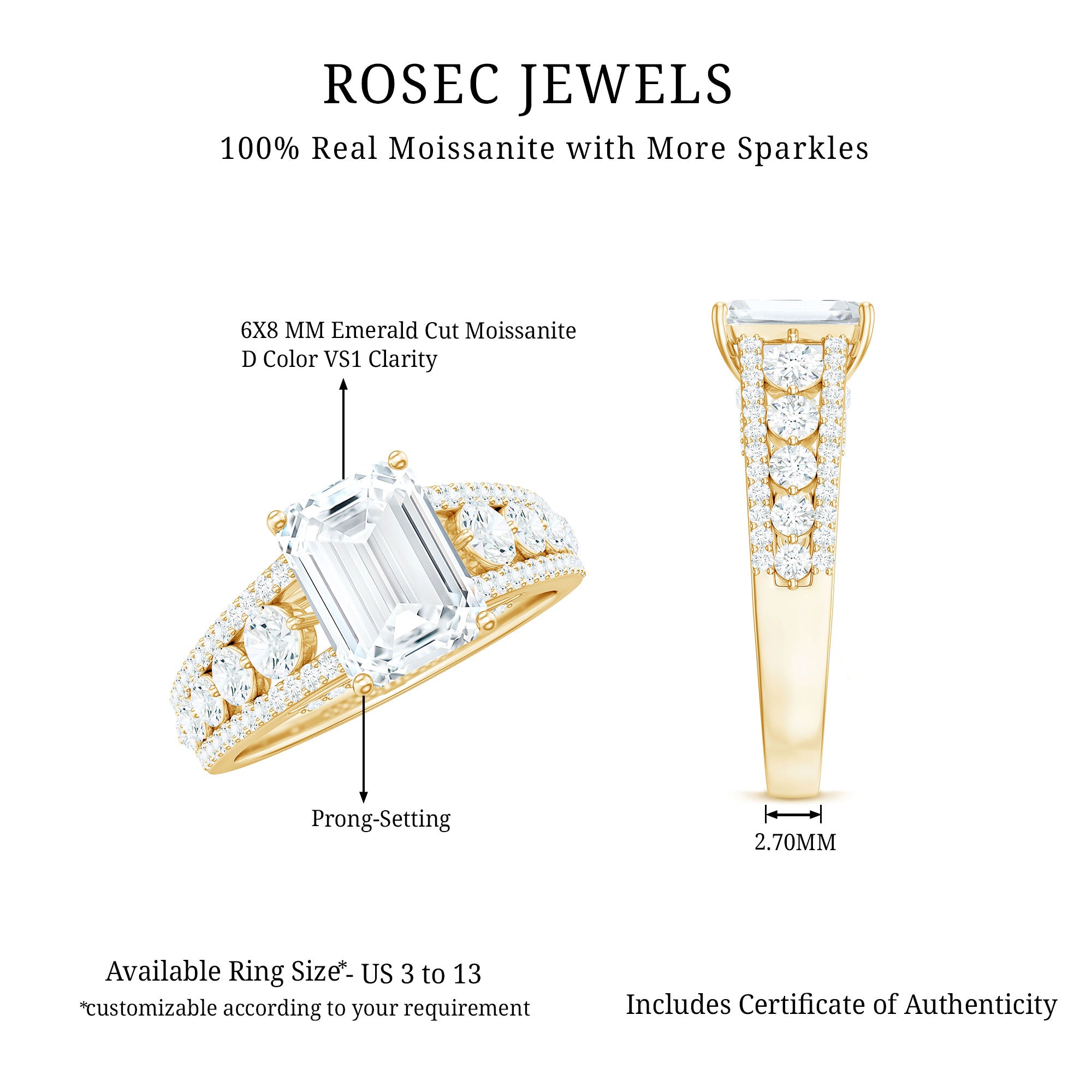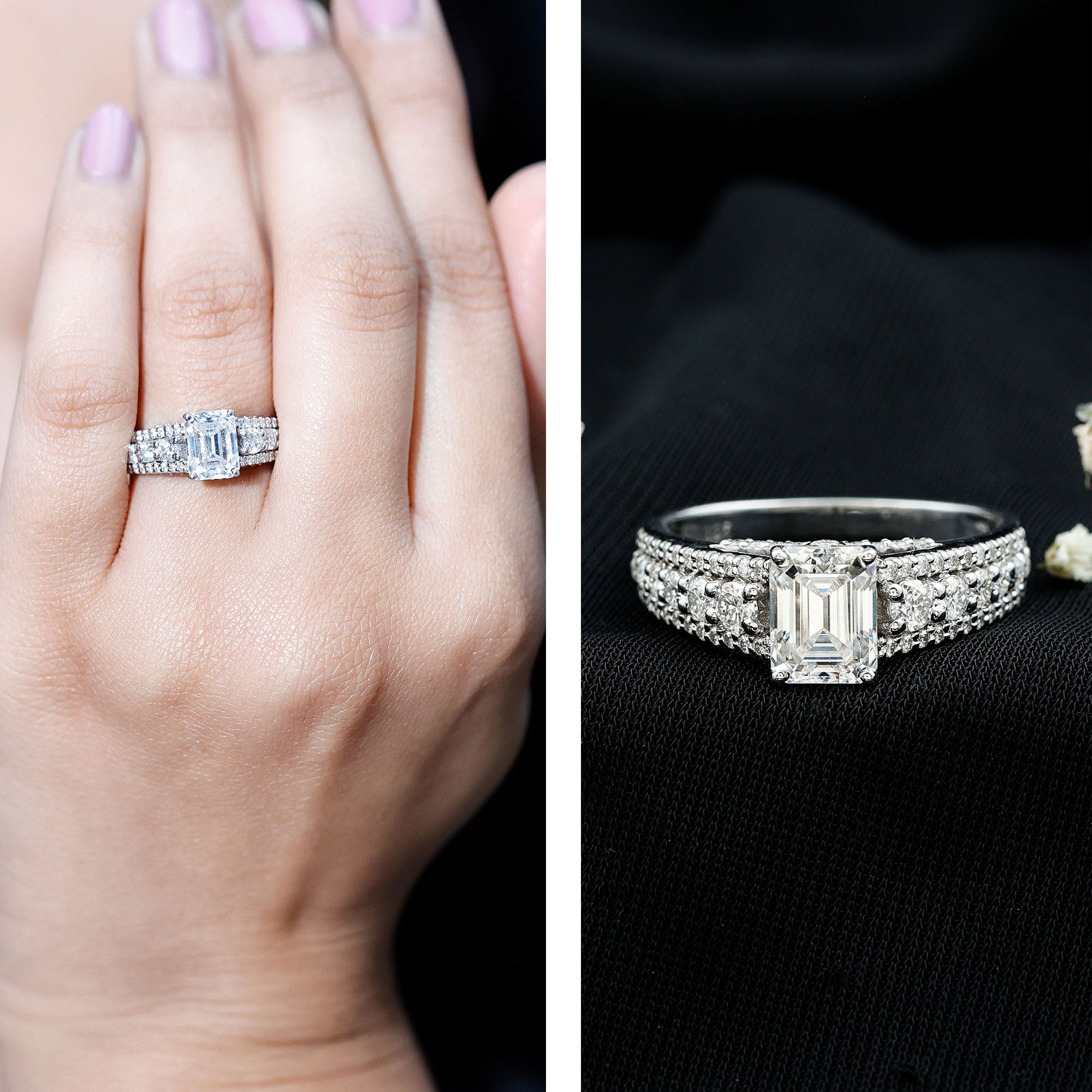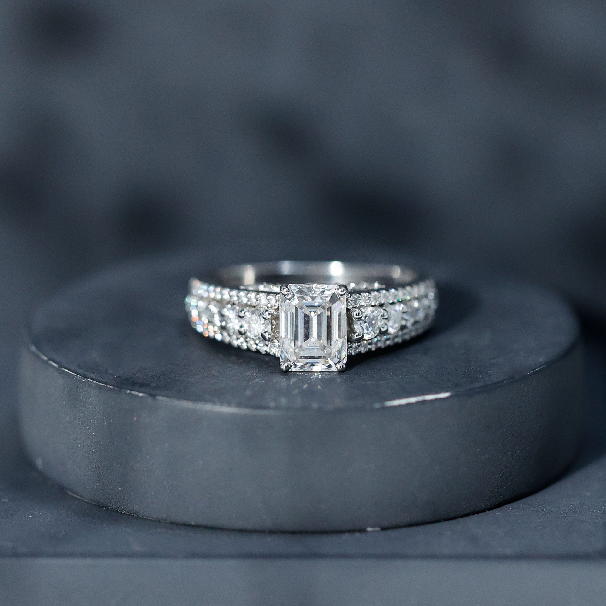 Turn your promise into a forever sparkle with this Emerald Cut Moissanite Ring. Make your special moment unforgettable with this breathtaking emerald cut engagement ring, designed to reflect the depth of your love and the brilliance of your future together. Featuring a premium 6X8 mm D-VS1 quality certified moissanite, this solitaire engagement ring delivers exceptional fire and clarity that rivals any traditional diamond—at a value that makes smart luxury possible. With a total weight of 3.31 carats, this ring combines a stunning emerald center with perfectly set round moissanite accents along the band, creating a visual masterpiece in a single, dazzling glance. Whether youre choosing a lifelong treasure for your proposal or upgrading to a symbol that better reflects your journey, this moissanite engagement ring offers elegance, durability, and unmatched brilliance. The expertly crafted 4-prong setting ensures lasting security, while the split shank lined with sparkling stones adds depth and dimension—making this a true showpiece among womens moissanite rings. A perfect choice for those seeking moissanite engagement rings or a distinctive emerald cut moissanite ring, this design celebrates beauty with meaning. The thoughtful craftsmanship, combined with the ethical sparkle of moissanite, brings you timeless sophistication without compromise. Elevate her “yes” moment with a ring that’s more than just jewelry—it’s a promise, a celebration, and a lifetime of memories wrapped in one stunning piece. If youre searching for a ring that blends romance, prestige, and smart value, look no further—this moissanite ring for women is the perfect beginning to your forever story