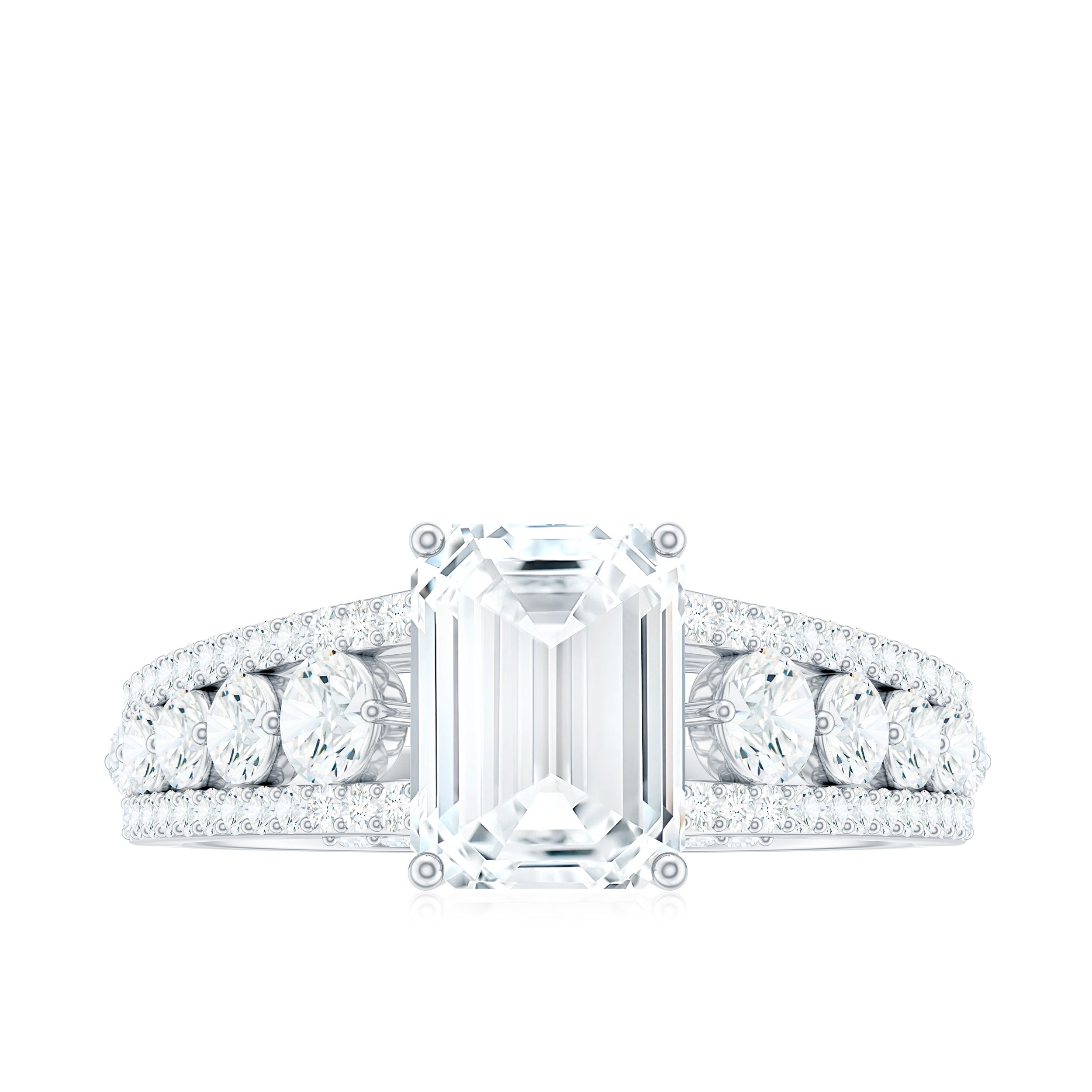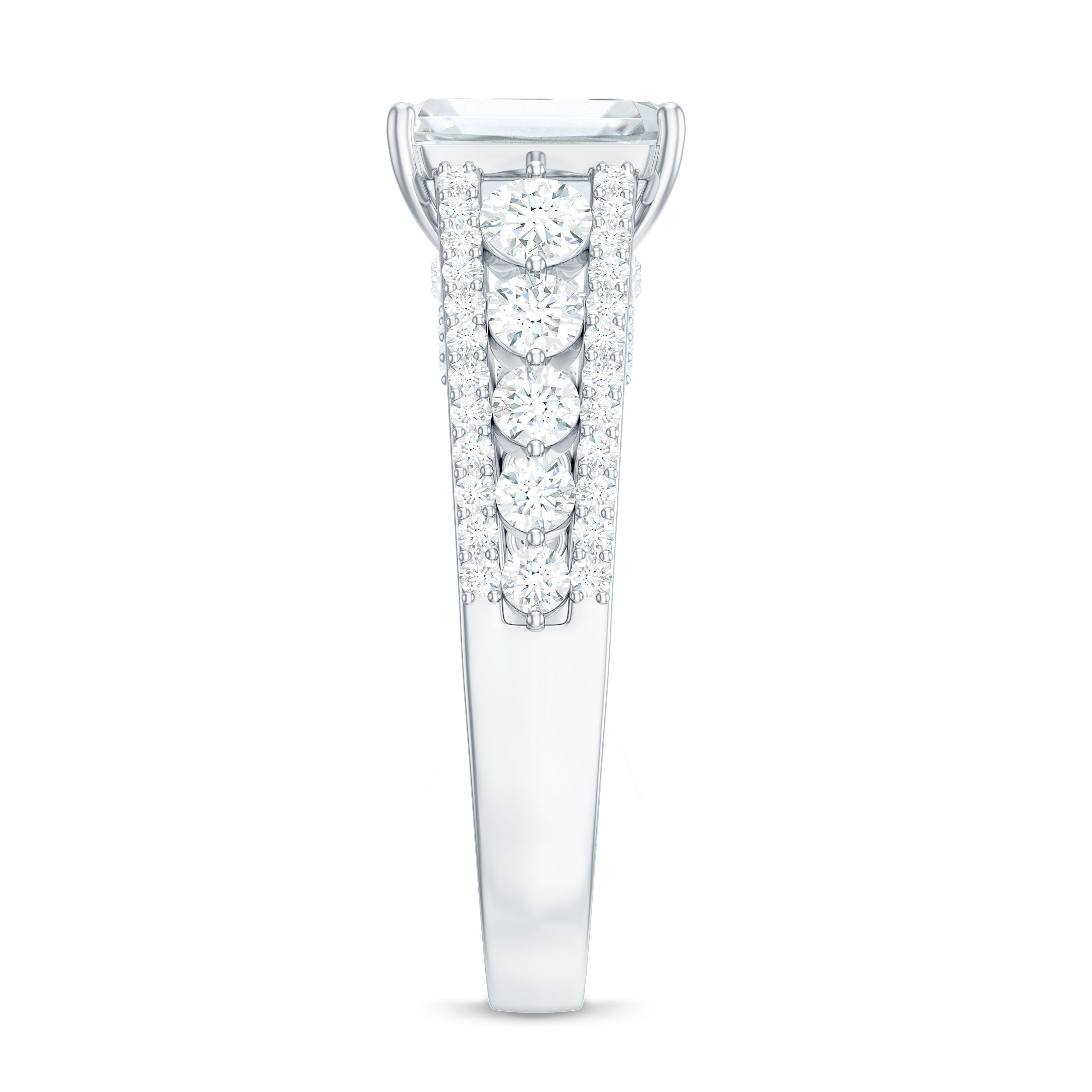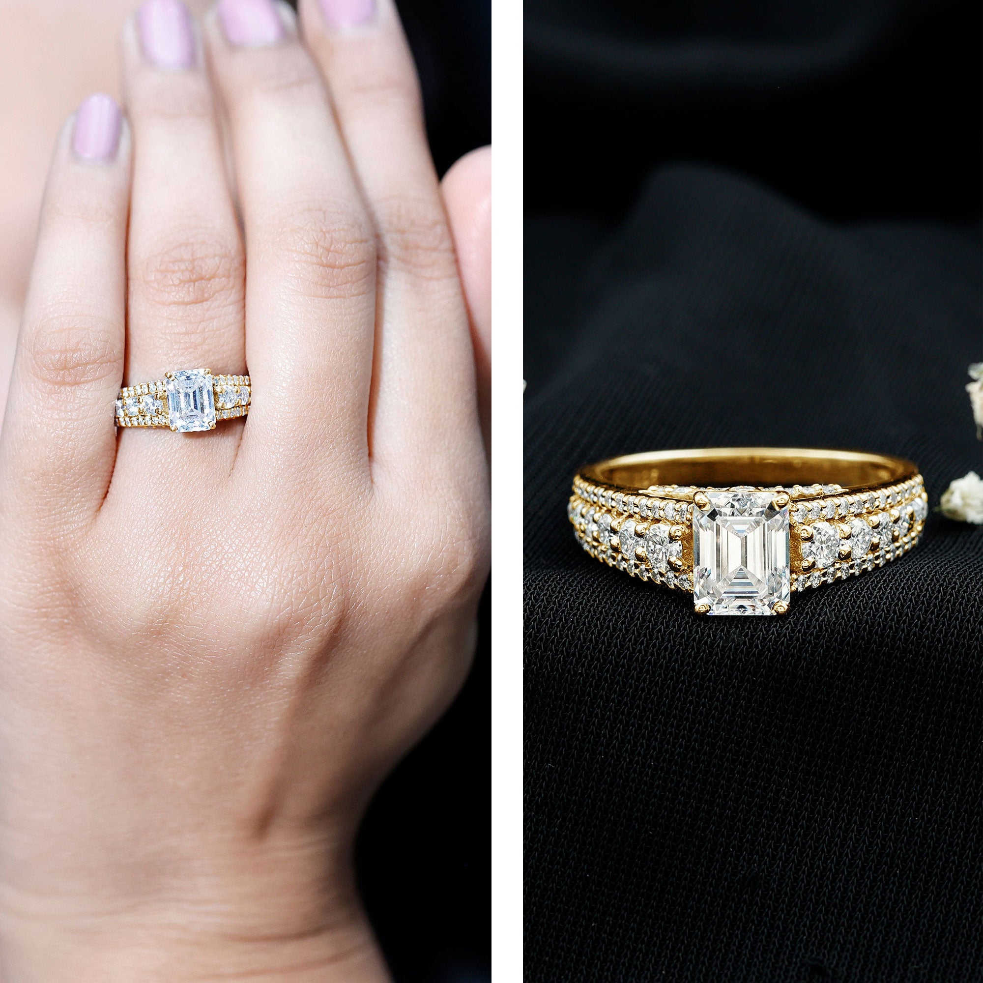 Turn your promise into a forever sparkle with this Emerald Cut Moissanite Ring. Make your special moment unforgettable with this breathtaking emerald cut engagement ring, designed to reflect the depth of your love and the brilliance of your future together. Featuring a premium 6X8 mm D-VS1 quality certified moissanite, this solitaire engagement ring delivers exceptional fire and clarity that rivals any traditional diamond—at a value that makes smart luxury possible. With a total weight of 3.31 carats, this ring combines a stunning emerald center with perfectly set round moissanite accents along the band, creating a visual masterpiece in a single, dazzling glance. Whether youre choosing a lifelong treasure for your proposal or upgrading to a symbol that better reflects your journey, this moissanite engagement ring offers elegance, durability, and unmatched brilliance. The expertly crafted 4-prong setting ensures lasting security, while the split shank lined with sparkling stones adds depth and dimension—making this a true showpiece among womens moissanite rings. A perfect choice for those seeking moissanite engagement rings or a distinctive emerald cut moissanite ring, this design celebrates beauty with meaning. The thoughtful craftsmanship, combined with the ethical sparkle of moissanite, brings you timeless sophistication without compromise. Elevate her “yes” moment with a ring that’s more than just jewelry—it’s a promise, a celebration, and a lifetime of memories wrapped in one stunning piece. If youre searching for a ring that blends romance, prestige, and smart value, look no further—this moissanite ring for women is the perfect beginning to your forever story