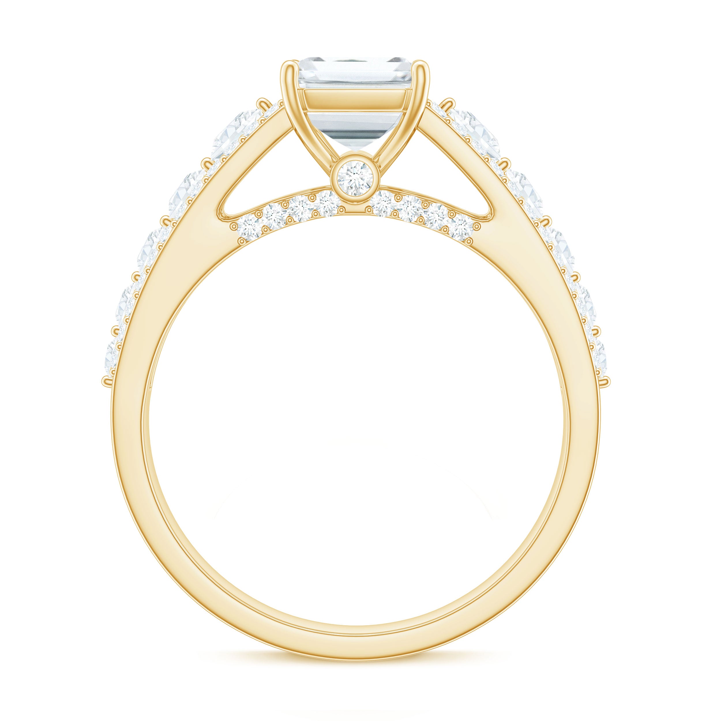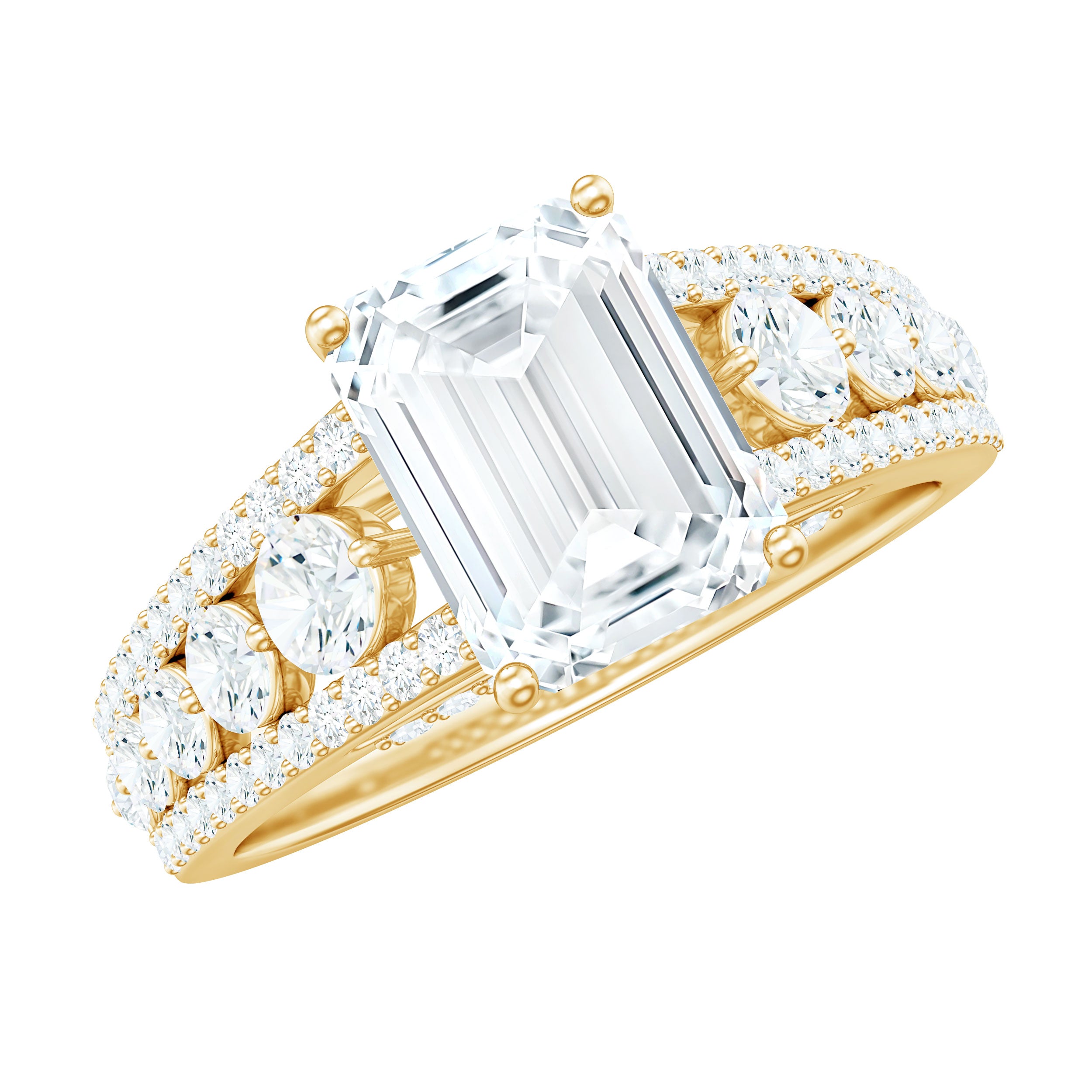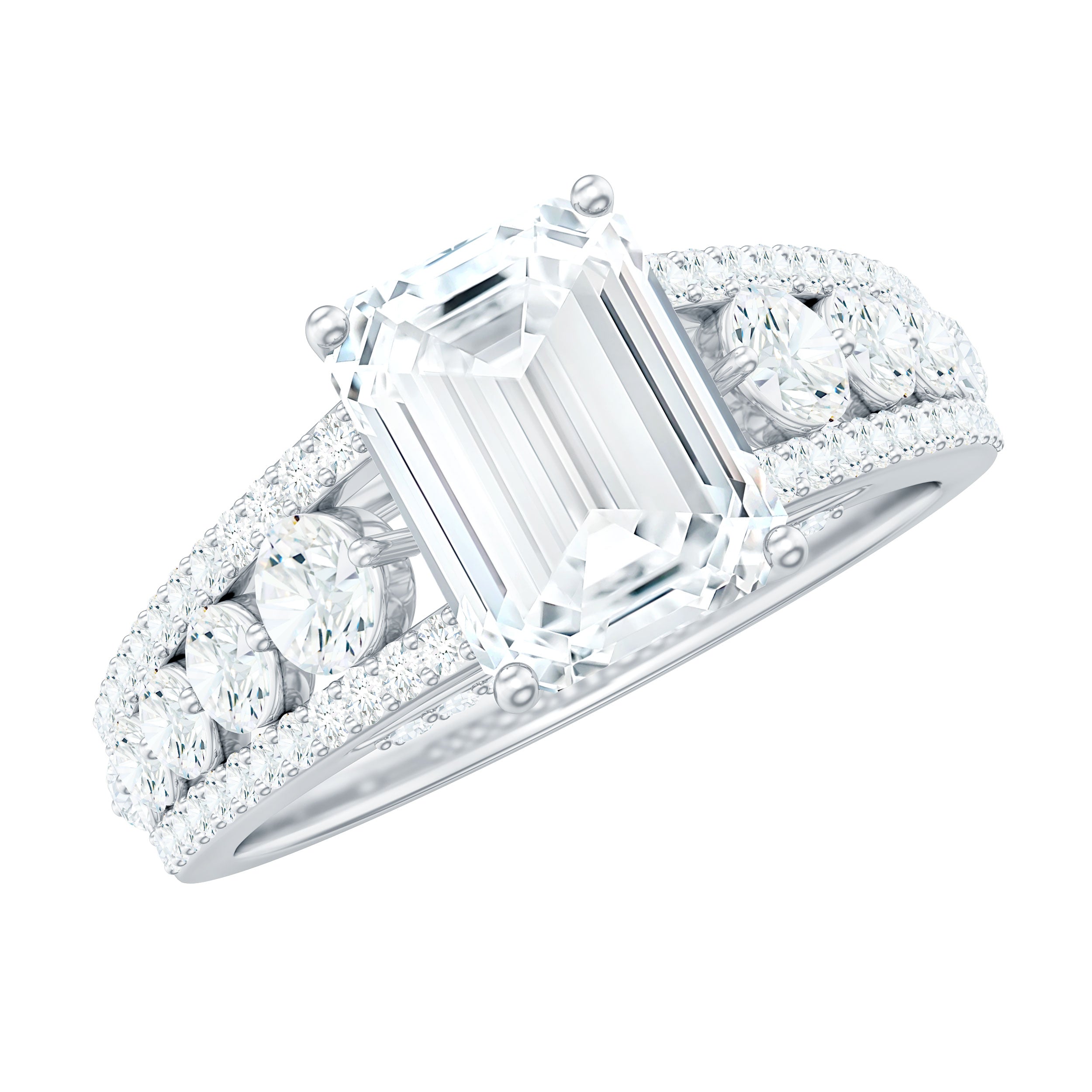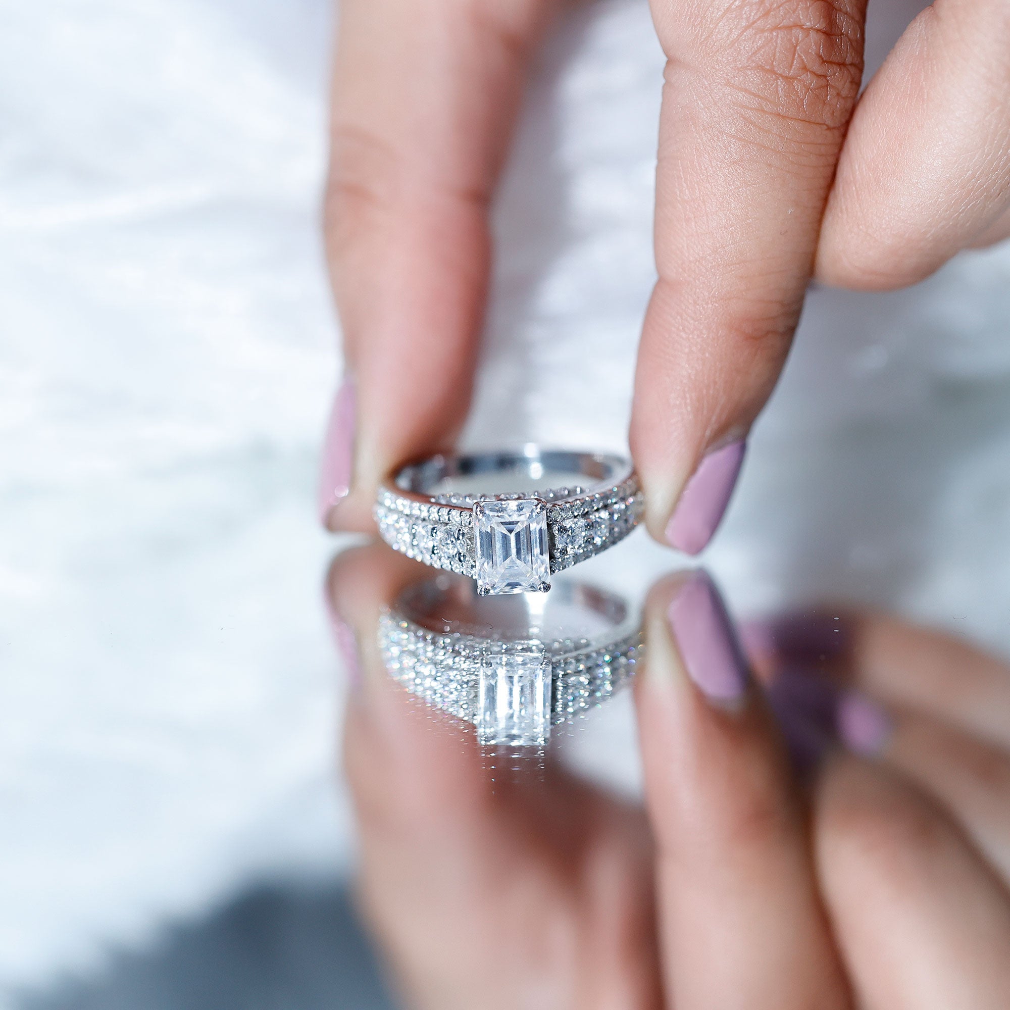 Turn your promise into a forever sparkle with this Emerald Cut Moissanite Ring. Make your special moment unforgettable with this breathtaking emerald cut engagement ring, designed to reflect the depth of your love and the brilliance of your future together. Featuring a premium 6X8 mm D-VS1 quality certified moissanite, this solitaire engagement ring delivers exceptional fire and clarity that rivals any traditional diamond—at a value that makes smart luxury possible. With a total weight of 3.31 carats, this ring combines a stunning emerald center with perfectly set round moissanite accents along the band, creating a visual masterpiece in a single, dazzling glance. Whether youre choosing a lifelong treasure for your proposal or upgrading to a symbol that better reflects your journey, this moissanite engagement ring offers elegance, durability, and unmatched brilliance. The expertly crafted 4-prong setting ensures lasting security, while the split shank lined with sparkling stones adds depth and dimension—making this a true showpiece among womens moissanite rings. A perfect choice for those seeking moissanite engagement rings or a distinctive emerald cut moissanite ring, this design celebrates beauty with meaning. The thoughtful craftsmanship, combined with the ethical sparkle of moissanite, brings you timeless sophistication without compromise. Elevate her “yes” moment with a ring that’s more than just jewelry—it’s a promise, a celebration, and a lifetime of memories wrapped in one stunning piece. If youre searching for a ring that blends romance, prestige, and smart value, look no further—this moissanite ring for women is the perfect beginning to your forever story
