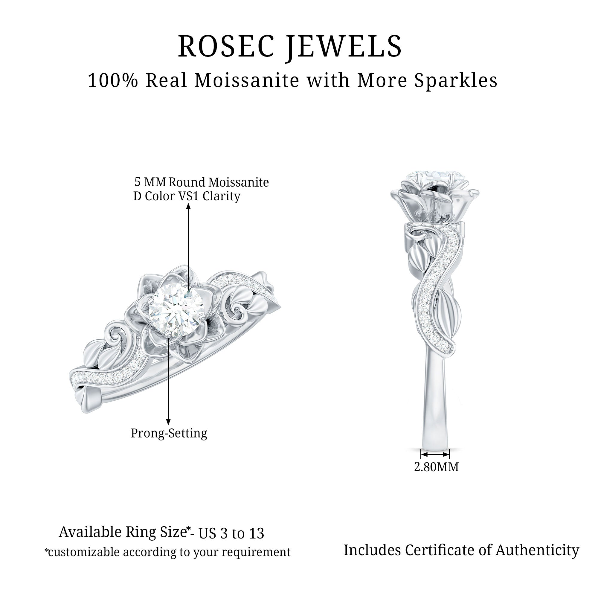For the person who loves nature-inspired jewelry, this Moissanite Flower Engagement Ring brings that vision to life. Inspired by the gentle curves of blooming petals, the design brings a graceful, garden-like feel to your special moment. At the heart of the ring sits a radiant 5 MM round moissanite, sparkling with brilliant D-VS1 quality. The center stone is framed by a lovely rose shaped flower, giving the Moissanite Engagement Ring a charming look. Along the band, more round moissanites brighten the design, adding a glow that catches attention from every angle. The shank features detailed leaf patterns that enhance the floral theme, giving the Floral Ring a nature-inspired elegance. This Half Carat Moissanite Ring is a wonderful choice for an engagement, a promise moment, or simply marking a memory that deserves something beautiful. It is designed to feel comfortable for everyday wear while still looking special enough for life’s most treasured days. Packaged in a charming jewelry box and available in many sizes, it is easy to give as a meaningful gift or to wear as a symbol of your own story.