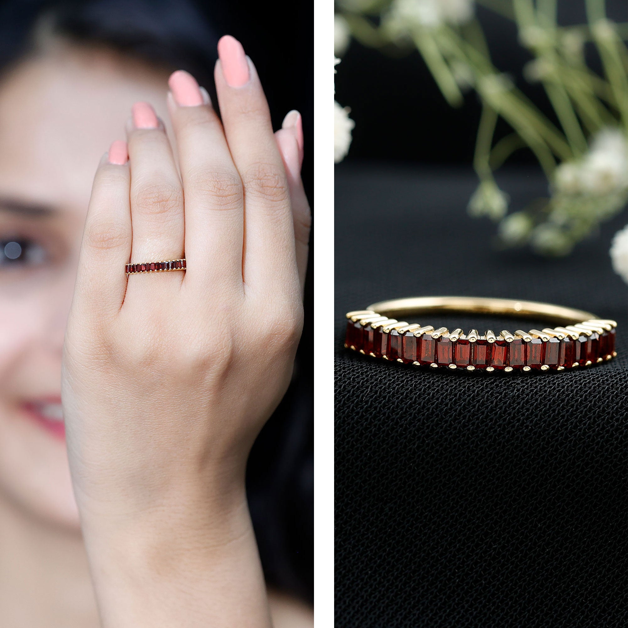 Celebrate special moments with this amazing Garnet Band Ring, symbolizing your connection. It is crafted from 14k yellow gold plated sterling silver. Make your memories unforgettable with our Baguette Wedding Band, which has a charm that will captivate your loved one, creating a distinctive and eye-catching appearance. The classic beauty of the Eternity Stackable Band features a row of Baguette Shaped Garnet in Shared Prong Setting that decorates half of the band, resulting in a unique piece of jewelry. With its simple yet elegant design, this Minimalist Wedding Ring has a timeless charm, allowing it to serve as a standalone option for a wedding band or to commemorate a special occasion. The Natural AAA Quality Garnet displays its brilliance and is a classic choice that radiates simplicity and grace. The sleek and polished design of this Garnet Eternity Ring invites you into a realm where timeless elegance meets modern charm. It is crafted to enchant and fascinate with its distinctive shape.