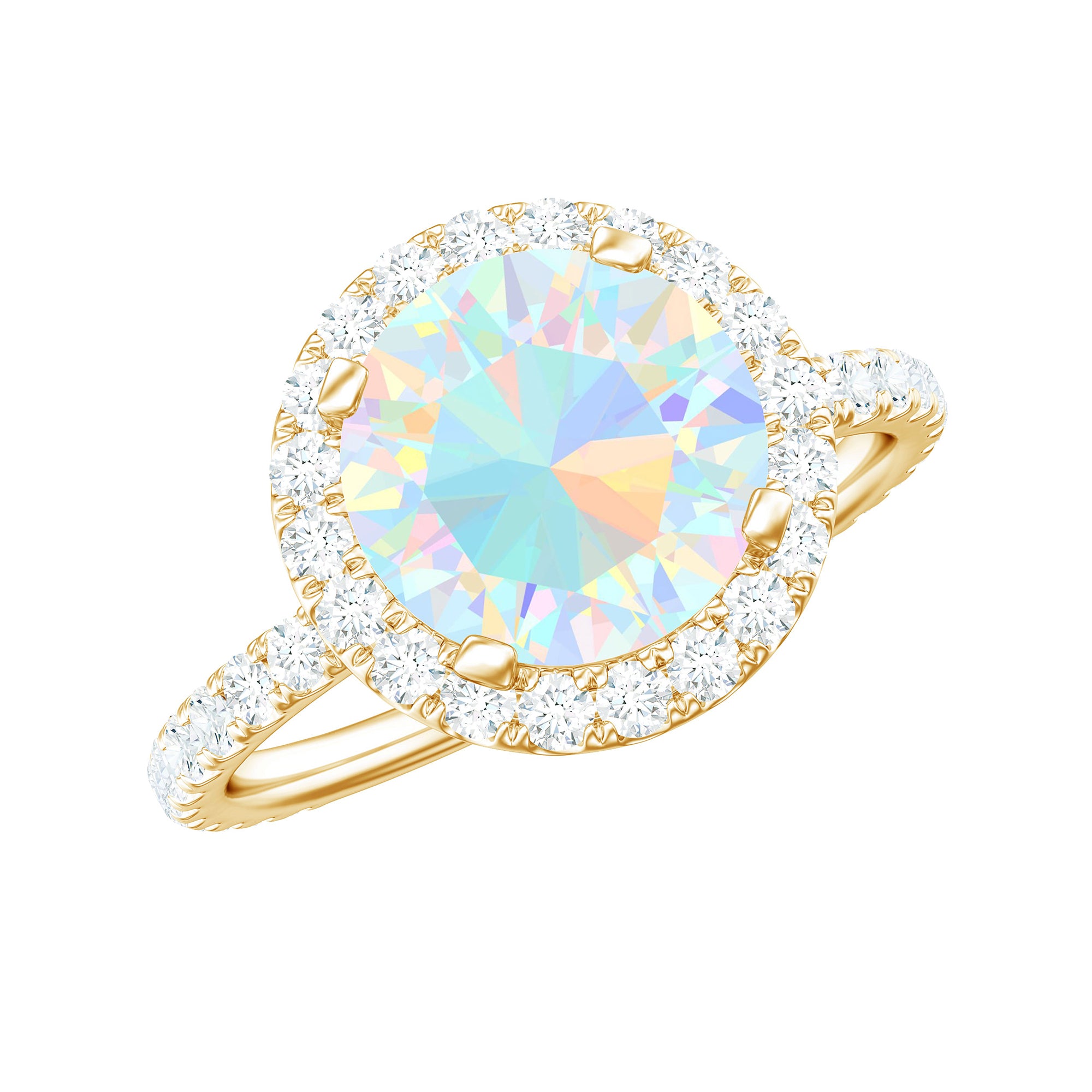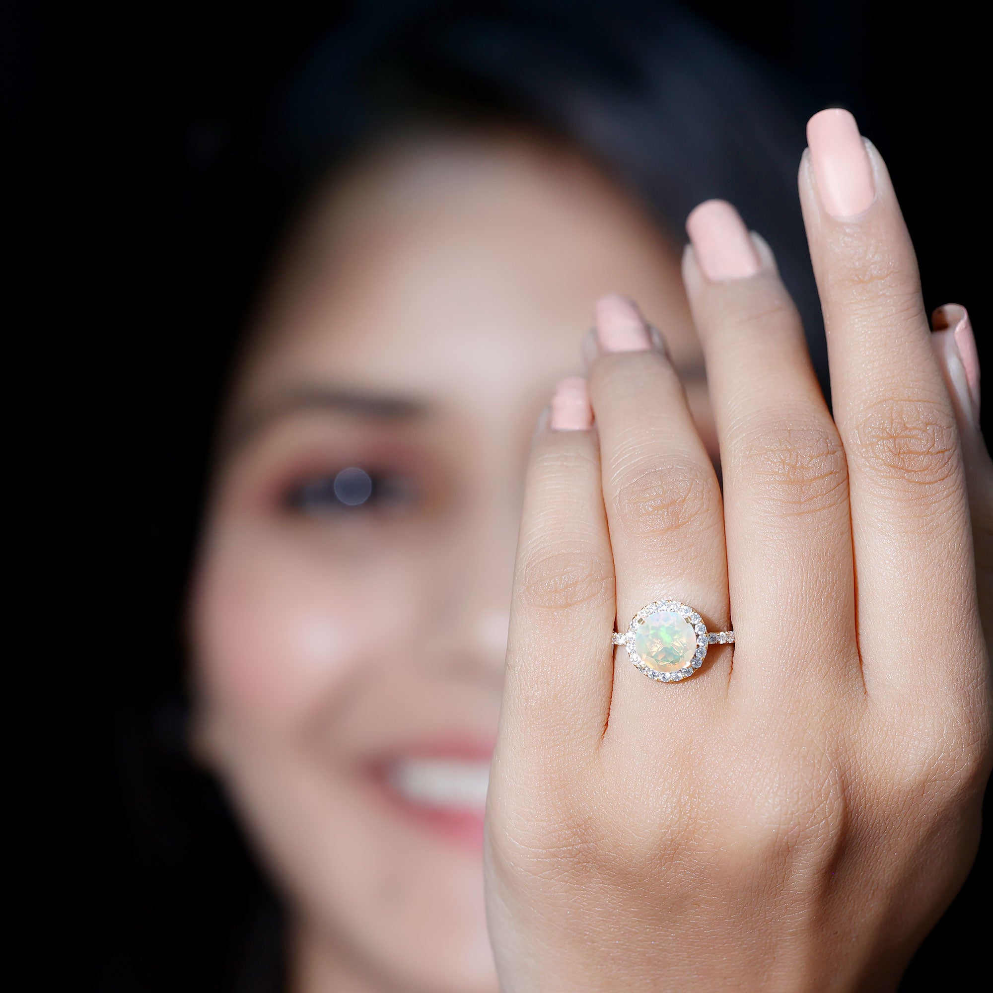 Timeless beauty with a touch of elegance, this Ethiopian Opal Engagement Ring is a luminous masterpiece that blends color and sparkle. At its heart is a glowing 8 mm Round Ethiopian Opal in Prong Setting, known for its shifting hues of soft blues, pinks and golds, like a sunrise captured in a stone. Surrounding the AAA Quality Rainbow Opal is a dazzling Halo of D-VS1 Moissanite, known for its fiery sparkle and brilliance. The band is also adorned with Moissanite stones, catching light from every angle and ensuring this Halo Engagement Ring with Opal turns heads from across the room. This Opal Engagement Ring is a symbol of forever, crafted for the kind of love that glows even in the quiet moments. Whether you are proposing, gifting or simply celebrating yourself, this Classic Engagement Ring is a statement of elegance and individuality. Available in a variety of sizes and presented in a luxury jewelry box, this Opal Halo Ring is proposal-ready and unforgettable from first glance.
