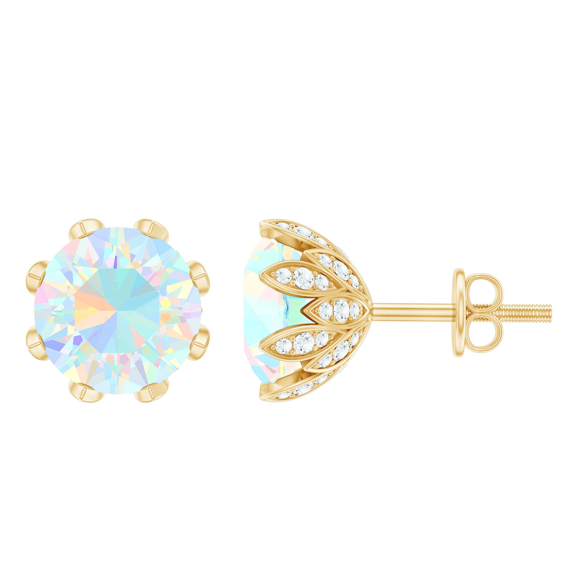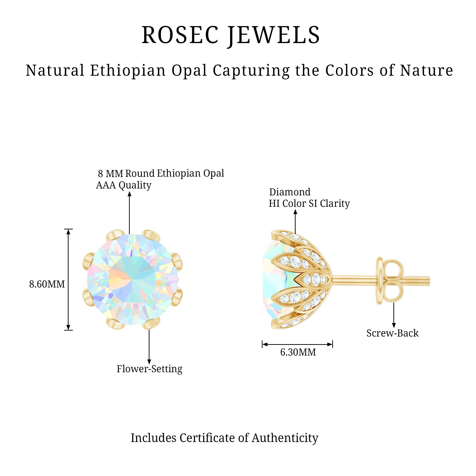 Let your style bloom with these enchanting Flower Earrings, delicately designed to capture the beauty of nature. Each earring features a vibrant 8 mm Round Shape Ethiopian Opal set at the center of a charming flower basket, surrounded by sparkling Diamond stones that highlight the hues of opal. The rainbow glow of AAA Quality Opal pairs beautifully with the HI-SI Diamond stones, creating a look that feels dreamy and full of life. Secured with Screw Back Closure, these Opal Stud Earrings stay comfortably in place, making them perfect for everyday wear or those special days when you want a little extra shine. The design is both playful and elegant, offering a sweet touch of femininity. Packaged in a signature jewelry box, these Opal Ear Studs make a thoughtful gift for someone who loves unique pieces or a beautiful treat just for you. These Opal Diamond Earrings bring a hint of whimsy and brilliance to every outfit. They are the perfect blend of charm, sparkle and natural beauty.