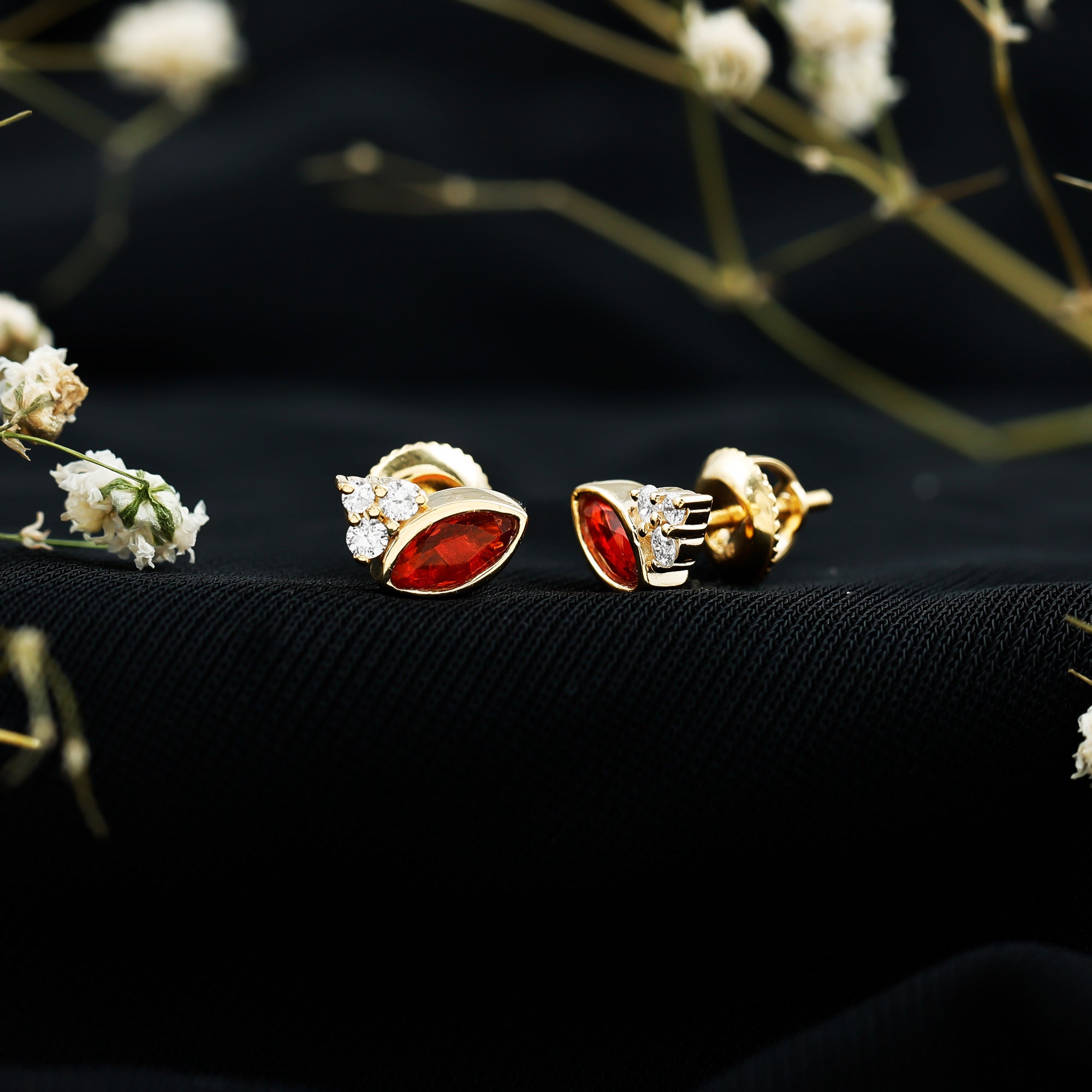 Feel the vibrant energy of these Fire Opal Stud Earrings, which bring bold elegance to your jewelry collection. Thoughtfully crafted in yellow gold plated silver, these Simple Earrings feature a stunning 3X6 MM marquise cut natural Fire Opal, set in bezel setting. A delicate trio of round cut lab grown diamonds accent one side of each earring, adding just the right amount of sparkle. With EF color and VS clarity, these diamonds beautifully highlight the glowing AAA quality opal, creating a lovely contrast that feels both modern and timeless. Secured with comfortable screw back closures, these Fire Opal Earrings are perfect for daily wear. Whether you are dressing up for a special occasion or adding a touch of color to your everyday outfit, they offer effortless elegance with a unique twist. As the birthstone for October, Fire Opal makes these Marquise Earrings a meaningful gift for someone special, or a personal treat if you love bold, colorful gems. Their simple design makes them easy to pair with anything, from workwear to weekend outfits. Full of warmth, charm, and character, these Fire Opal and Diamond Earrings are a beautiful way to wear your birthstone or simply enjoy a pop of fiery color with timeless style.