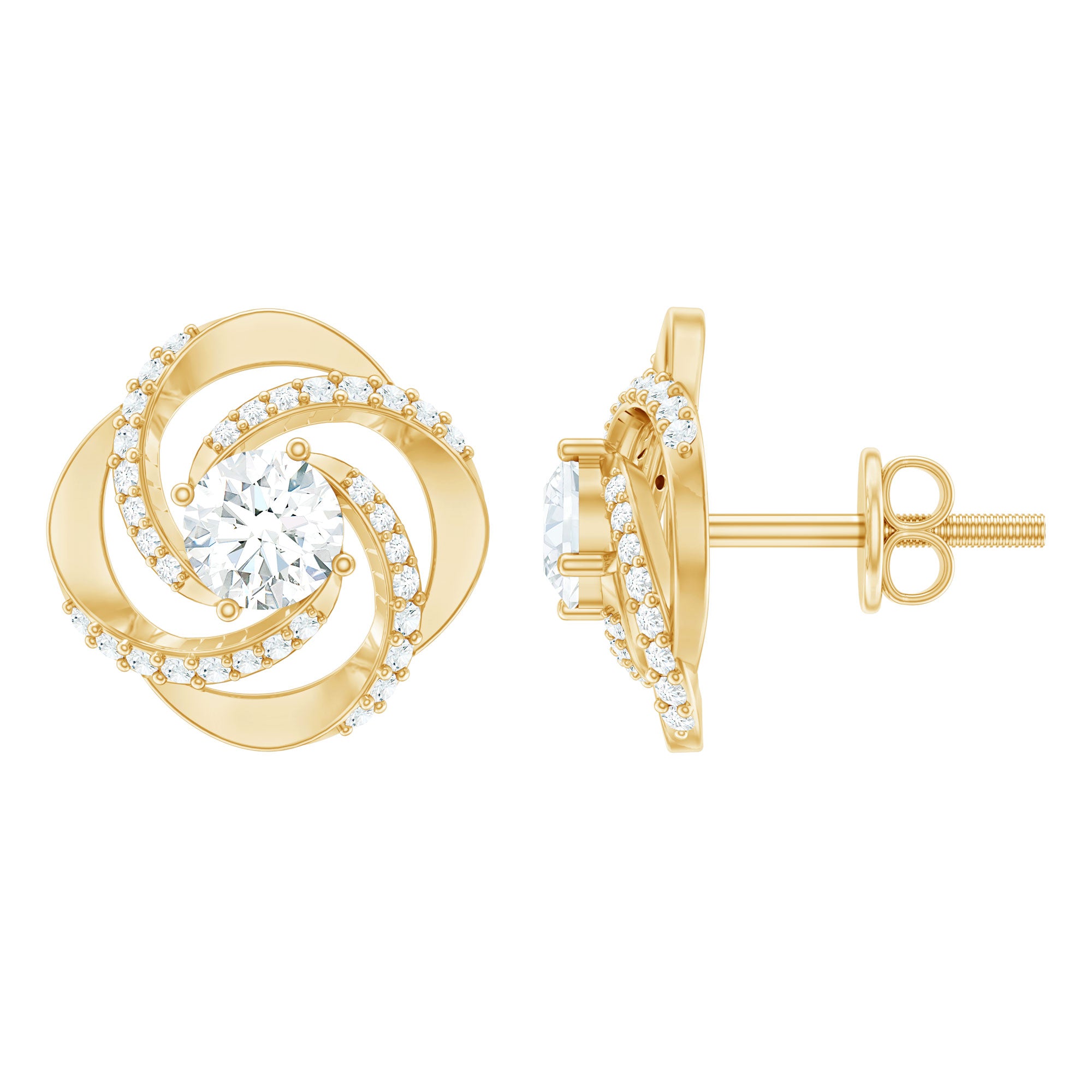 Add some sparkles and swirls to the celebration with these Diamond Stud Earrings. These Interlock Earrings feature with 5 mm quality diamond as the center stone embedded in the high-quality metal in the Prong-Setting. The metallic frame is in the intertwined swirl design decorated with Round Lab Grown Diamonds which enhances the beauty of this stud. The EF-VS Quality Diamond grabs the spotlight and makes these studs extra sparkling. These Swirl Earrings come with Screw Back Closure which keeps them in place throughout. Celebrate the Milestone of your relationship with these Diamond Studs. These studs are delivered in the premium Quality Gift Box.