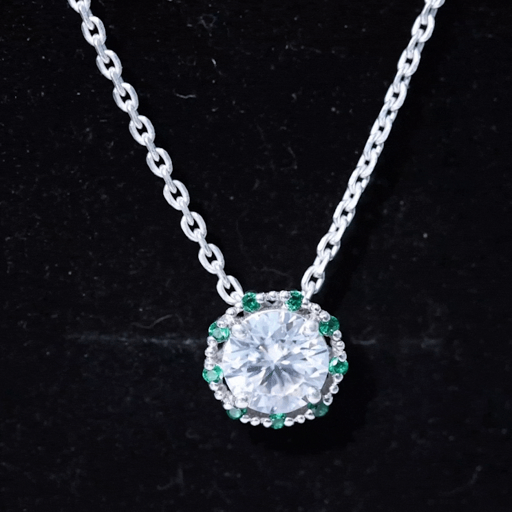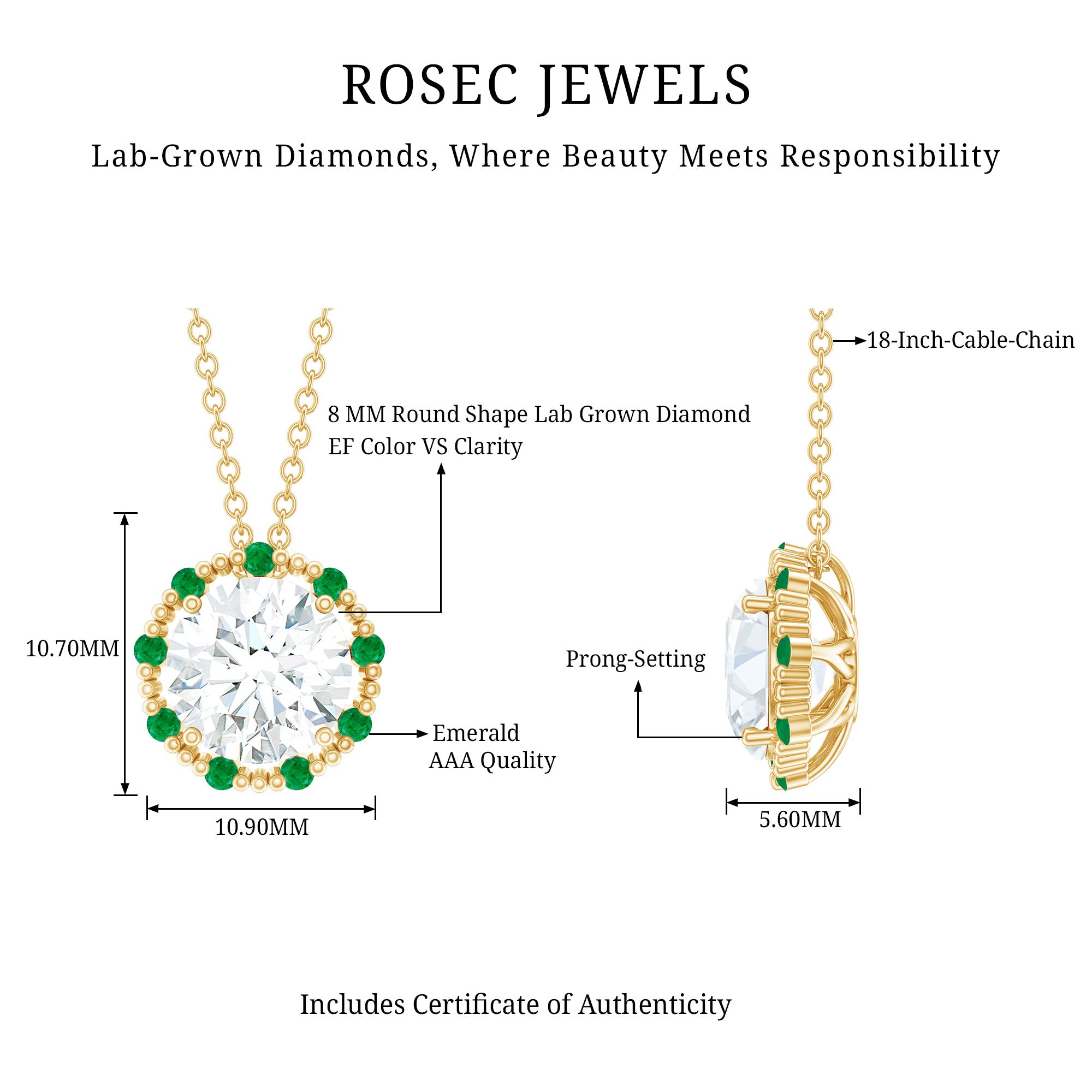 Introducing this stunning Diamond Pendant Necklace, a beautiful combination of classic elegance and modern appeal. Adorned with an 8 MM round cut diamond of EF-VS quality set in the center in prong setting, encircled by vintage inspired beadwork and deep green emerald gemstones. This hidden bail gives this 2 CT Diamond Necklace a floating effect without any distraction and makes it a versatile piece of jewelry for casual and formal outfits. This Halo Pendant is a thoughtful and affordable present for your loved one. Made with ethically sourced, lab grown diamonds, it offers the luxury of fine jewelry while being environmentally friendly.