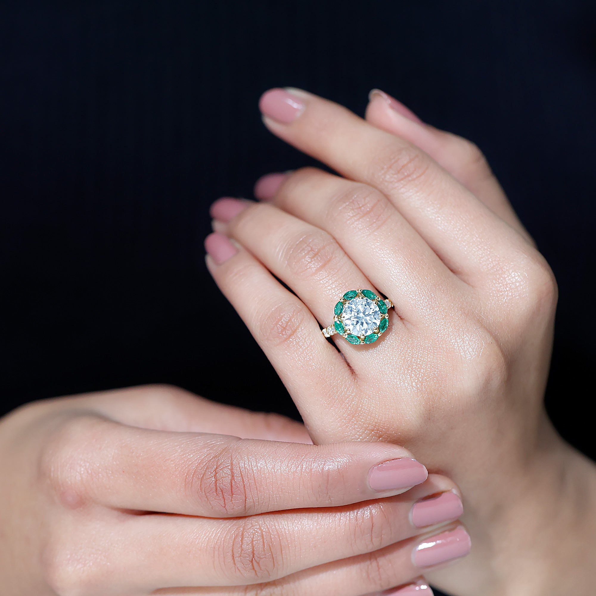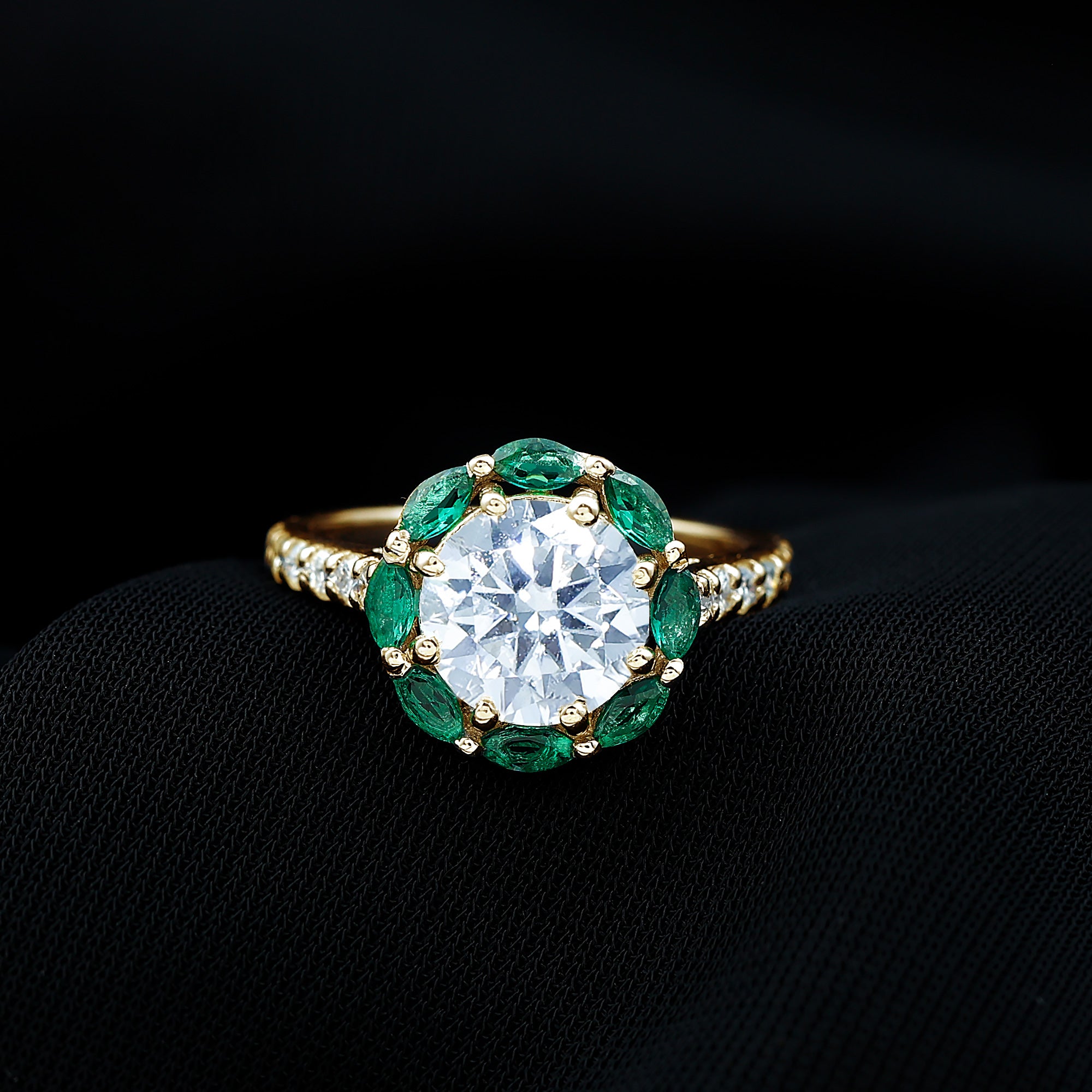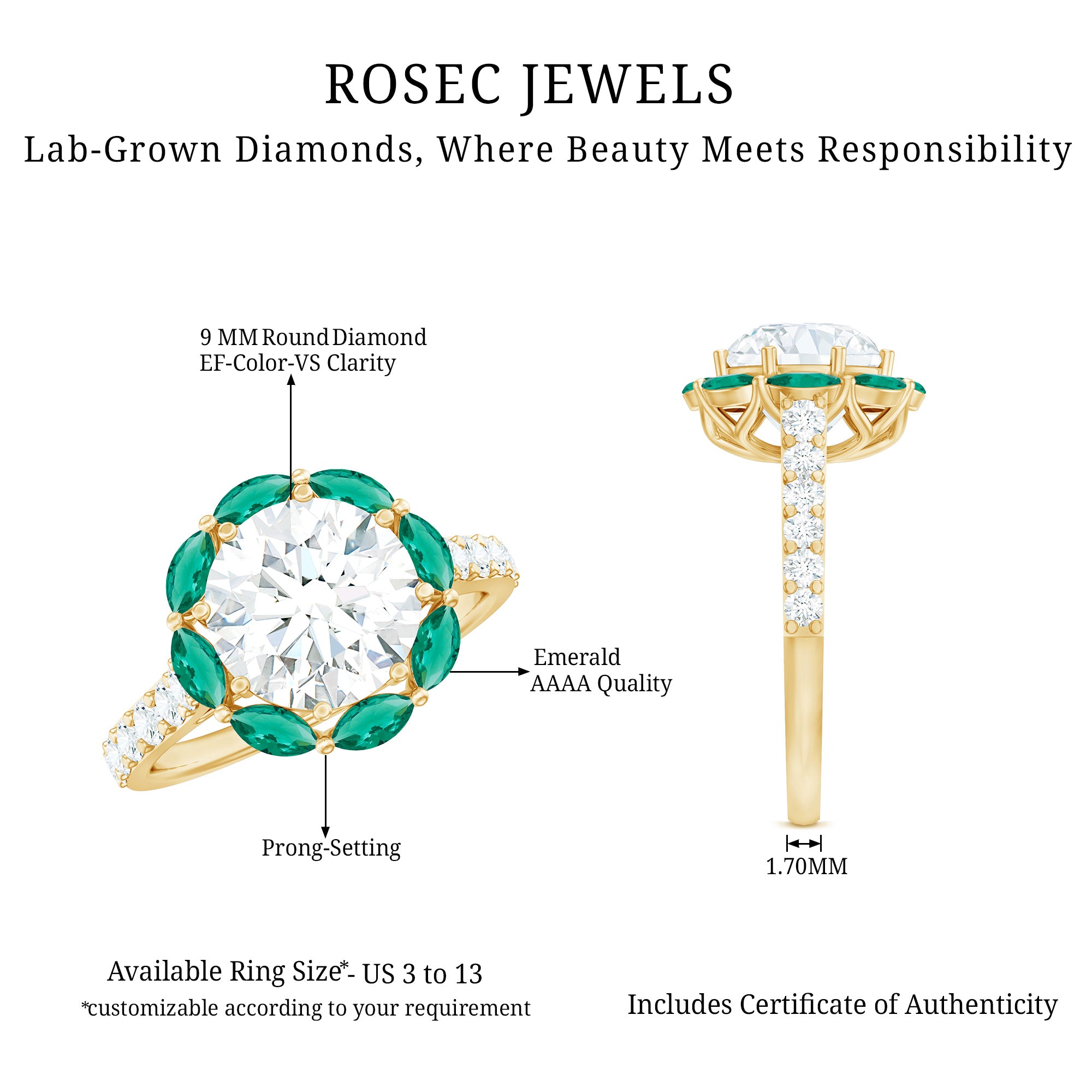 Why settle for an ordinary Halo Diamond Ring when you can have this masterpiece, full of contrast and modern charm - at its center sits a 9 MM round shaped EF-VS quality diamond (lab grown) held in secure 8-prong setting. Highlighting the center stone is a classic halo, curated with marquise shaped lab made emerald stones and diamond encrusted band, creating a contrast that is sure to catch everyones eye. What makes this Diamond Cocktail Ring unique is its versatility - whether you are looking for an Engagement Ring that stands out, a Proposal Ring to pop the question in style, or just a present for your lady love to celebrate your milestones, this piece is the perfect choice. Also, a diamond is an April birthstone, symbolizing everlasting love, strength, and wealth, making this Round Engagement Ring a meaningful and thoughtful accessory in your jewelry collection.
