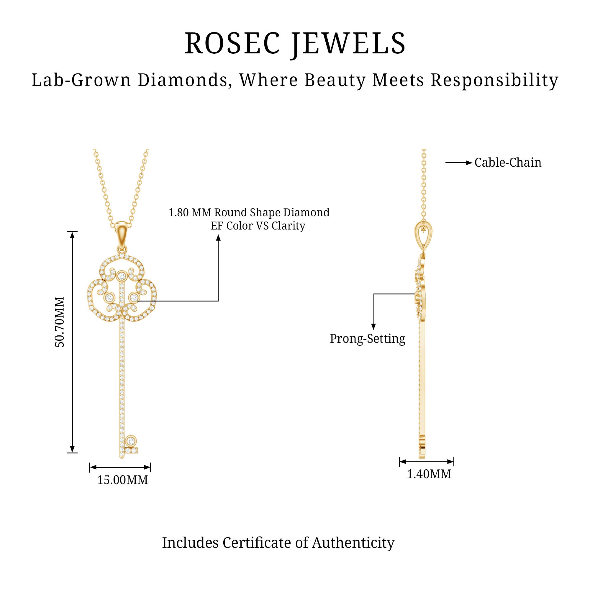 This captivating Key Necklace is a beautiful mix of sparkle, meaning, and timeless style. The pendant is shaped like a classic key and is adorned with Round Shape Lab Grown Diamond stones that shine with every movement. This Key Charm Necklace is the kind of piece that feels special the moment you put it on. The top of the key features a Vintage Inspired design that adds a soft, elegant touch. This Lab Grown Diamond Necklace is simple yet unique, perfect for adding a little charm to your everyday outfits or for making a subtle statement at special events. Made with Lab Grown Diamond stones of EF-VS Quality, this Lab Made Diamond Necklace offers the same brilliance as natural gemstones, but more sustainably and thoughtfully. Whether you are buying it as a gift or treating yourself, this Vintage Style Necklace is a lovely reminder of new beginnings and open doors. The necklace comes in a beautiful jewelry box, ready to give or enjoy. Delicate, meaningful, and easy to wear, this Diamond Key Pendant (Lab Created) is a little piece of elegance you will love having in your collection.