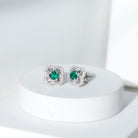 Enhance your collection with the elegance of nature through these exquisite Lab Grown Emerald Earrings. Expertly handcrafted from 14k white gold plated silver, these Studs combine the tranquil beauty of nature with the artistry of fine craftsmanship. At the center of each earring is a vibrant prong set 4 MM round lab created emerald, celebrated for its deep green color and AAAA quality. The emeralds rich, lush hue mirrors the splendor of natures finest offerings, while also being an ethically sourced, eco-conscious choice, making these Flower Stud Earrings not just stunning but also environmentally friendly. Encircling the central stone is a delicate round cut moissanite floral halo. The Emerald Stud Earrings are carefully completed with secure screw back closures, providing a comfortable and safe fit for everyday wear or special events. Own a piece of jewelry that not only enhances your appearance with its beauty but also reflects your appreciation for nature and conscious luxury.