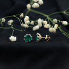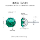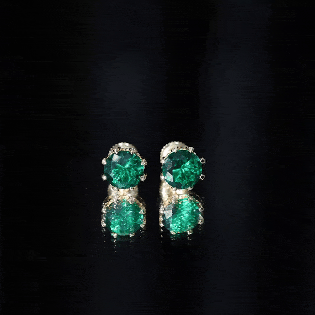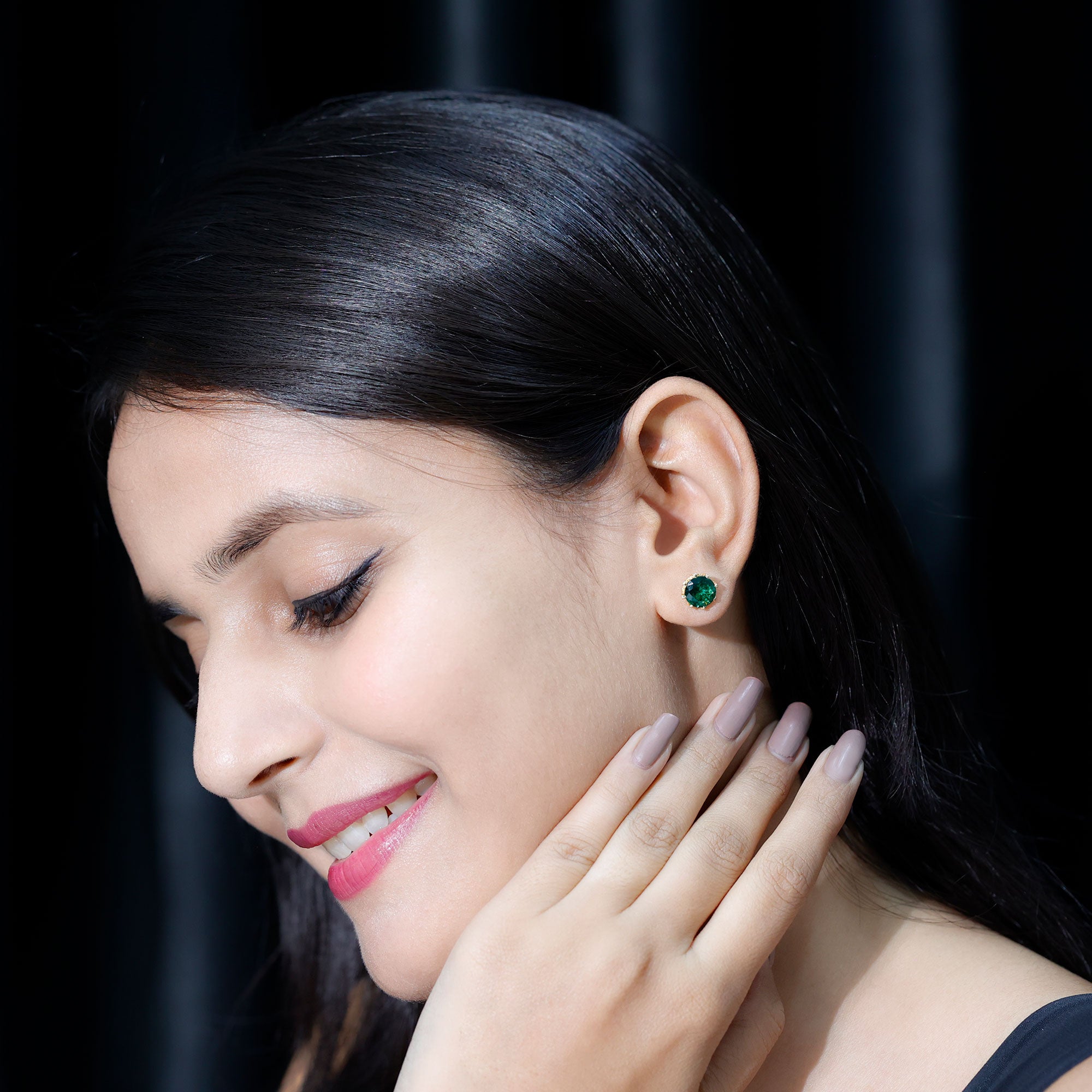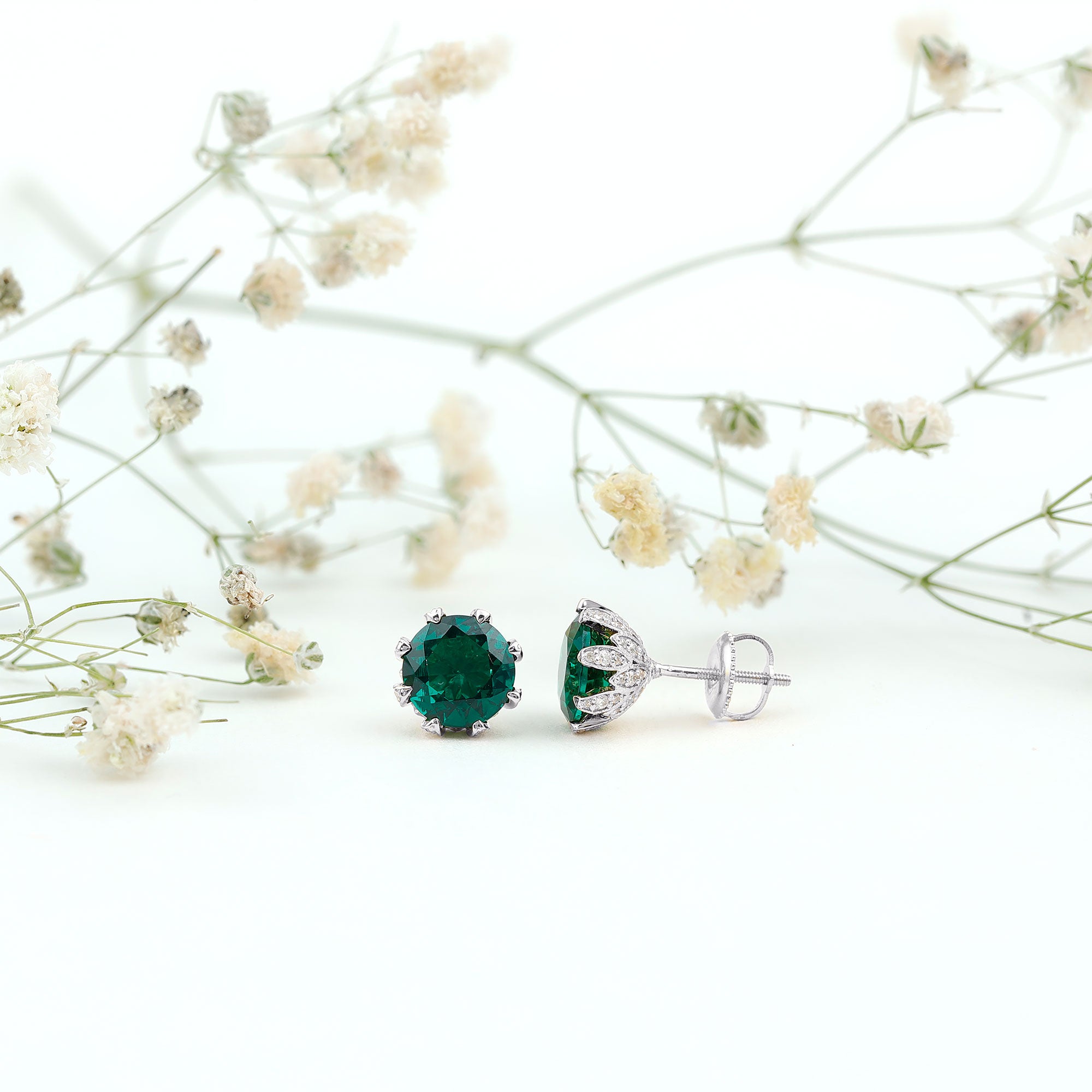 Elevate your style with our Emerald Stud Earrings that infuse a delightful hue into your life. The 8 MM Round Lab-Created Emerald is designed to capture the attention. The elegant floral motif at the end sparkles with the unmatchable brilliance of Moissanite resulting in the captivating and sophisticated appearance of these emerald earrings. Exquisitely secured with Screw-Back closure to keep them intact in the earlobe and provide a comfortable fit. Embrace your favorite outfit when you wear these emerald studs, a burst of sparkle on your ears.