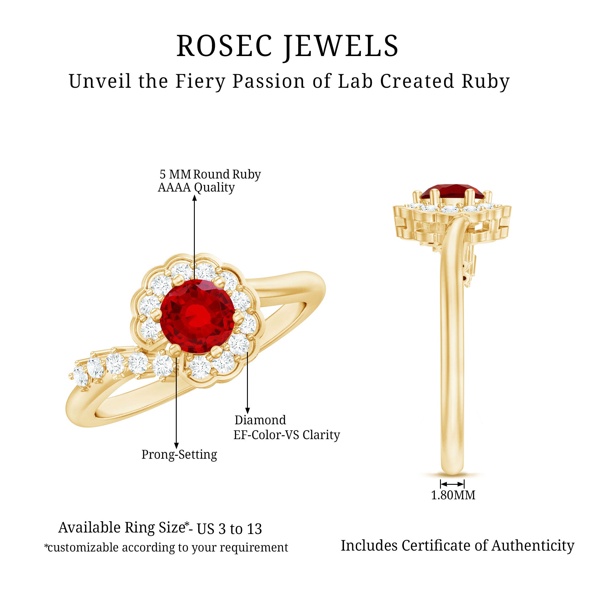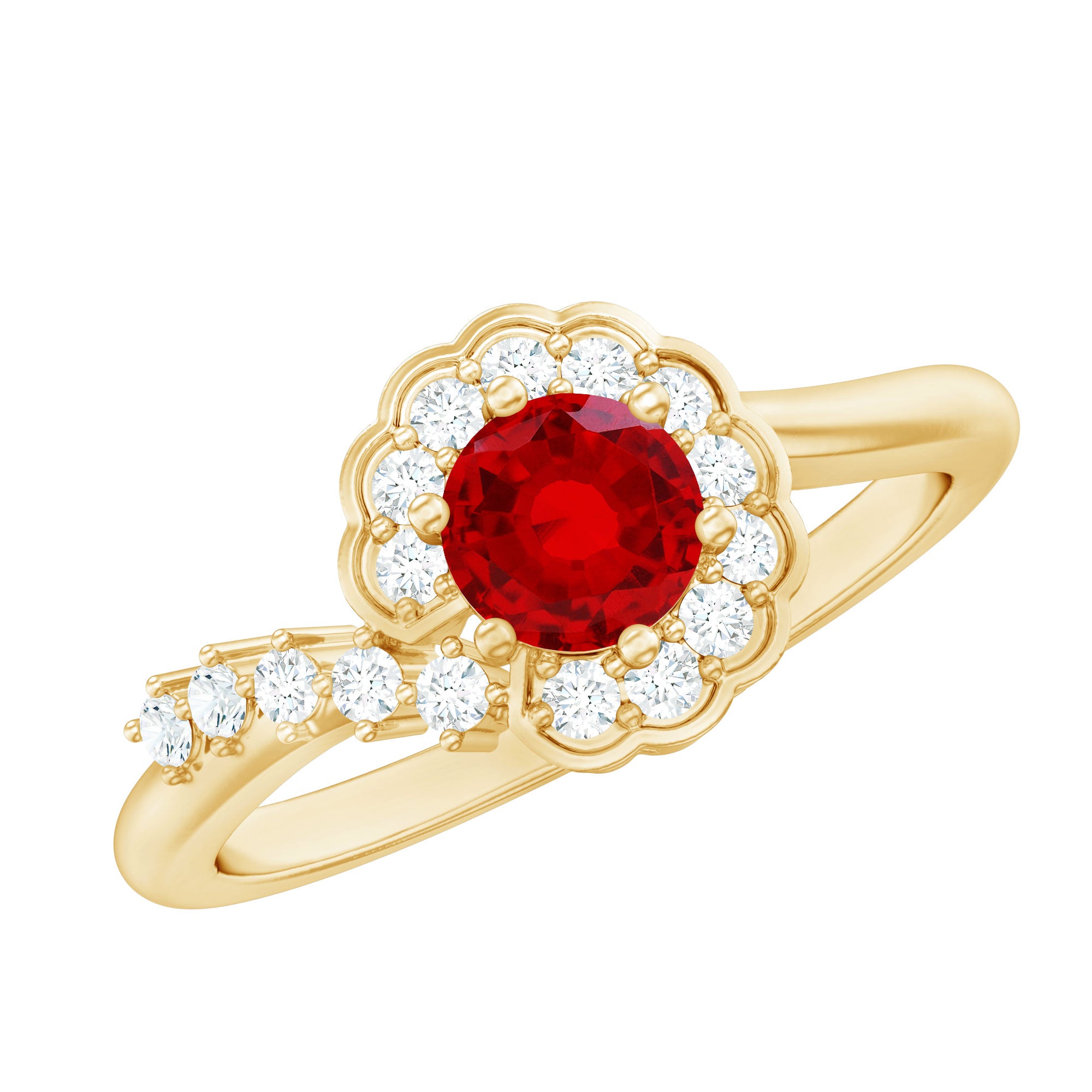 Let your love bloom with this Ruby and Diamond Engagement Ring, which is as special as the person you are giving it to. Designed with a touch of romance, this Flower Engagement Ring captures the feeling of falling in love. At the center, a 5 MM round lab created ruby glows with rich red color and set in secure prong setting. The AAAA quality of lab made ruby makes sure it sparkles with depth and intensity, catching the light and the eye instantly. What makes this Ruby Flower Ring truly stand out is the floral halo design. A delicate arrangement of lab grown round diamonds surrounds the ruby like petals in bloom, continuing partway down the shank to give the ring a graceful curve. The style is feminine, elegant, and thoughtfully made to reflect the beauty of your bond. The ruby and diamonds are both lab grown, offering a more ethical and sustainable choice without compromising on brilliance or charm. Whether you are planning a surprise proposal, choosing a unique promise ring, or simply looking to mark a meaningful moment, this Ruby Engagement Ring brings the perfect mix of beauty and intention. Gift it to the one who makes your world brighter, and let the story begin.