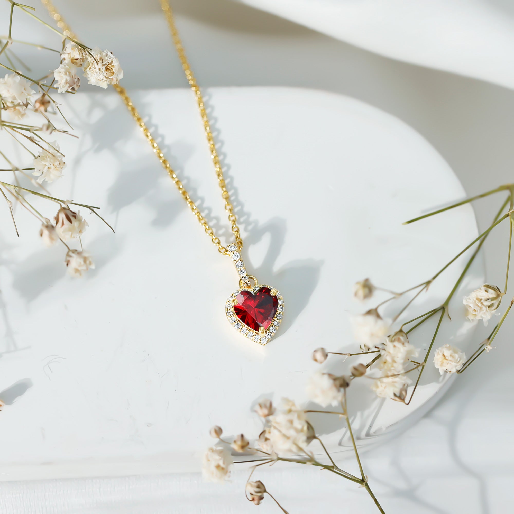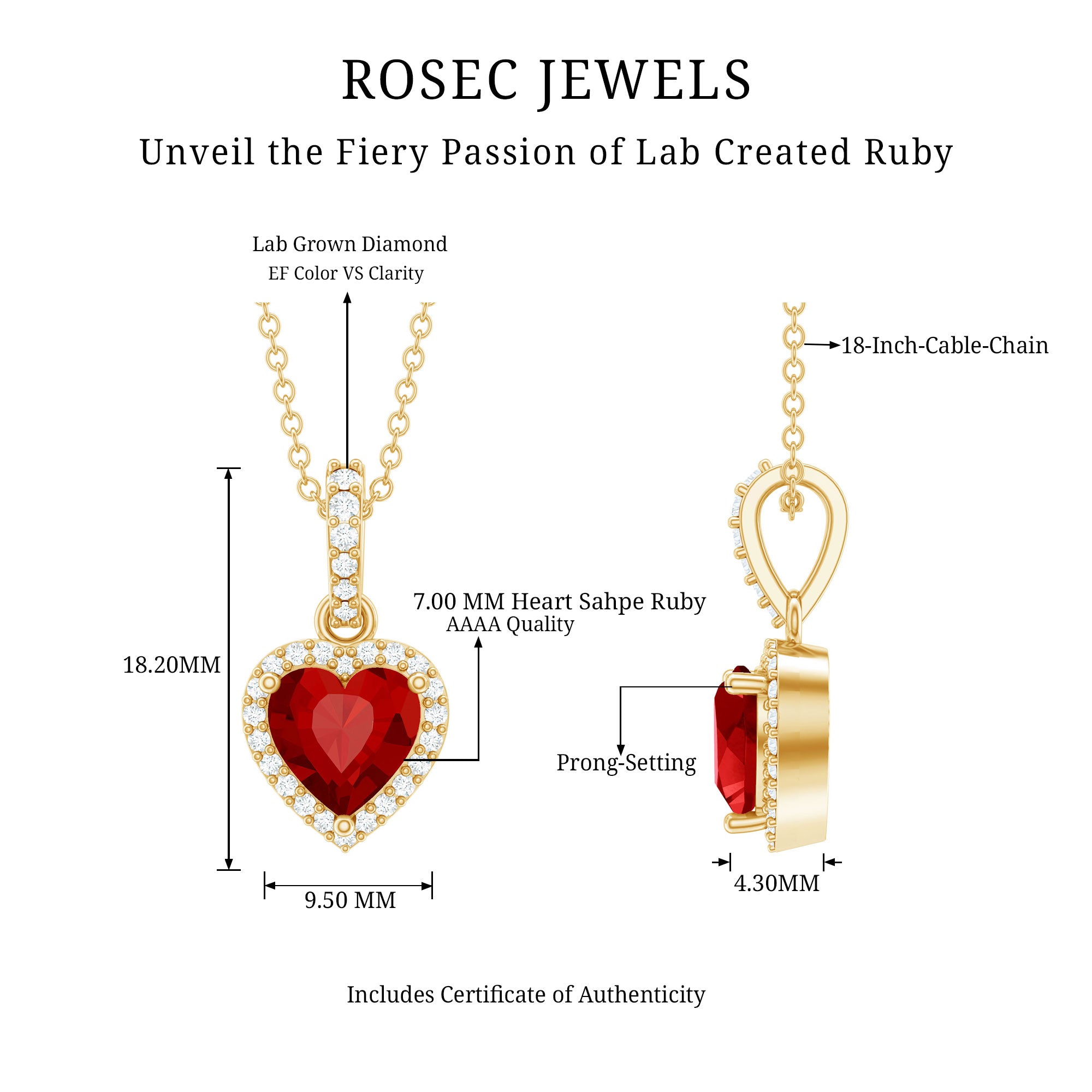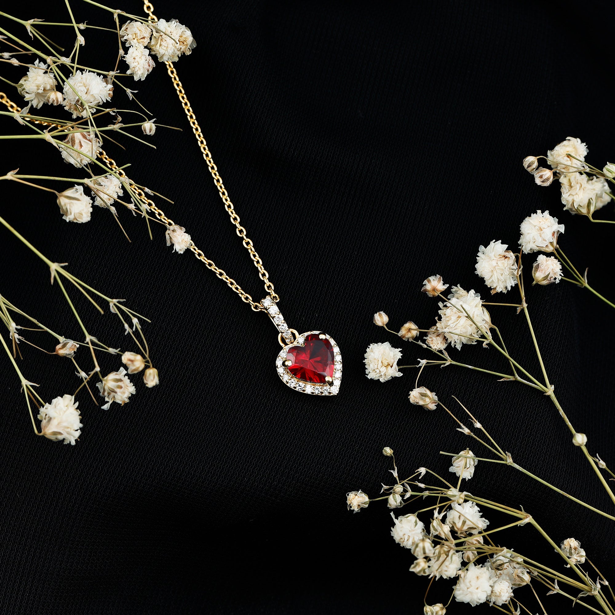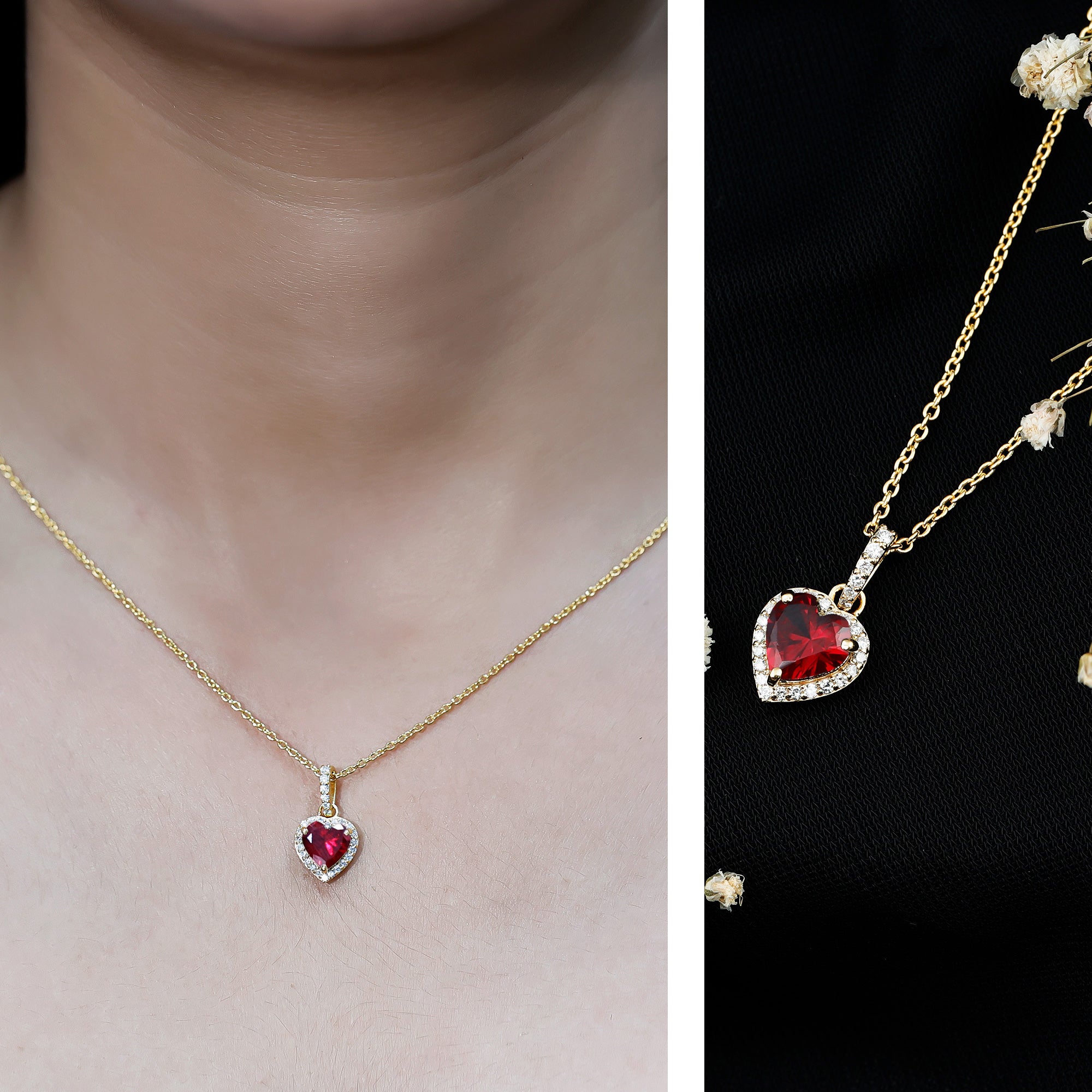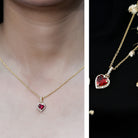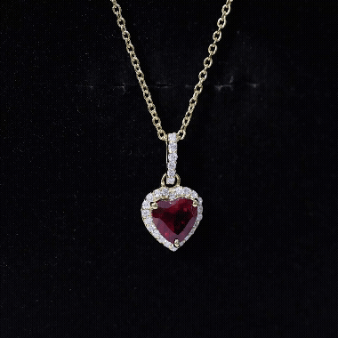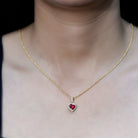 When words fall short, let your jewelry do the talking. This Heart Shaped Ruby Necklace is a beautiful expression of love, passion, and the moments that make your heart skip a beat. Thoughtfully crafted in 14k yellow gold plated silver, this Heart Locket Necklace features a 7 MM heart shaped lab created ruby at the center, capturing the timeless essence of romance. Nestled securely in prong setting, the ruby is surrounded by a shimmering halo of round lab grown diamonds, creating a radiant frame that elevates the charm of the centerpiece. Adding a special touch is the decorative bail, also adorned with lab grown diamonds, that seamlessly connects the pendant to a delicate chain. The Ruby and Diamond Heart Necklace hangs beautifully around the neckline, making it the perfect gift for anniversaries, Valentine’s Day, birthdays, or simply to show how much you love her without saying a word. It is sweet, meaningful, and just dramatic enough to make hearts flutter. Whether you are gifting it to your partner or treating yourself as a reminder of self-love, this Ruby and Diamond Necklace is a keepsake that holds emotion in every detail. It is romantic, feminine, and designed to be cherished for years to come. So, if you are looking for a necklace that speaks of love, lights up the room, and carries a piece of your heart, it is right here, waiting to be worn close to theirs.