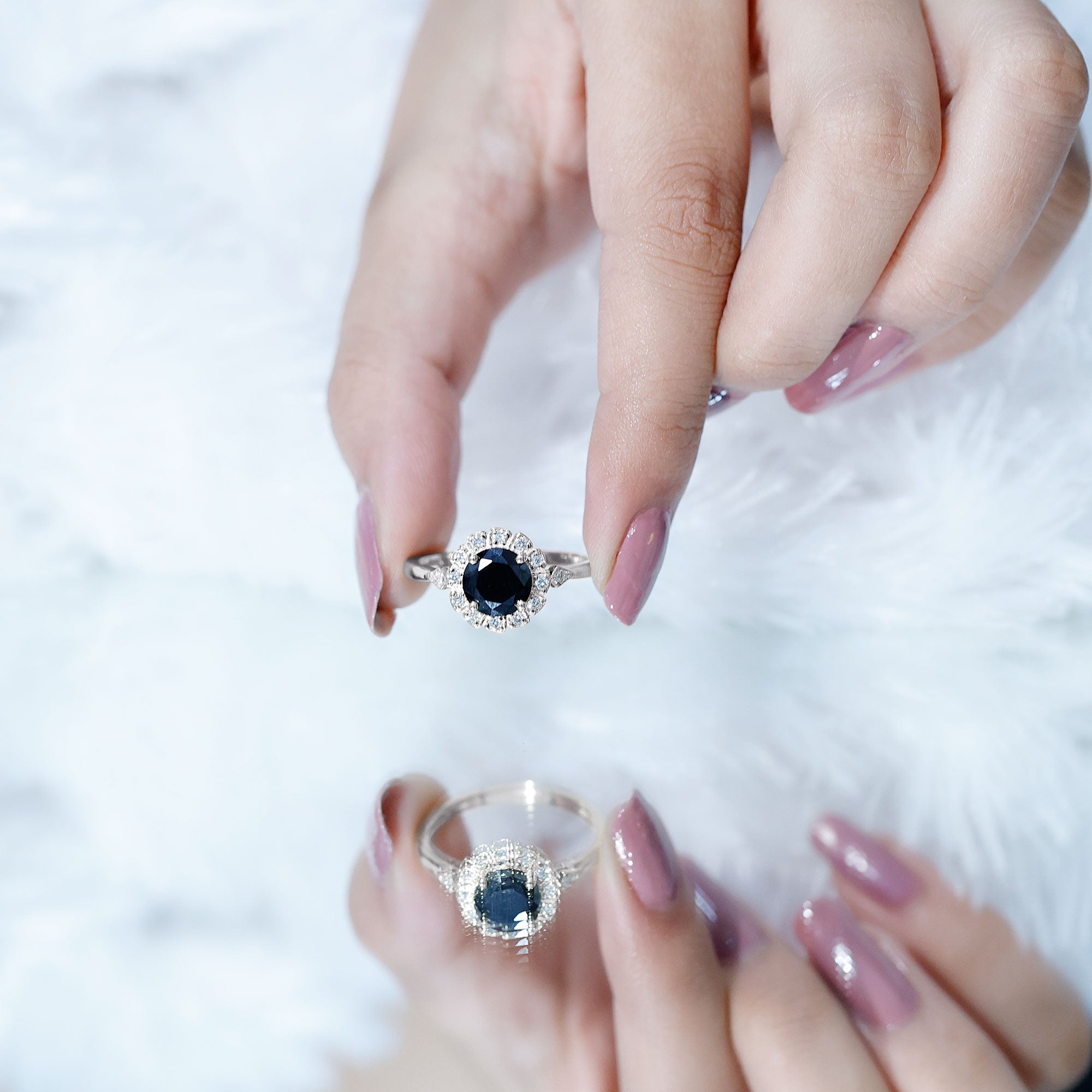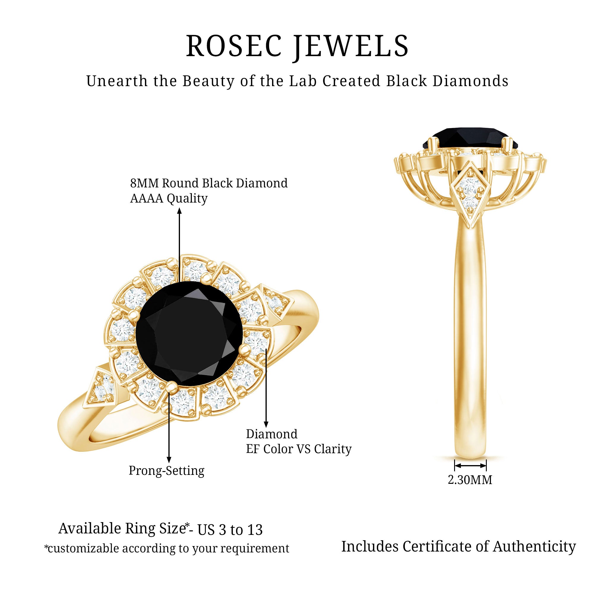 Classic elegance meets modern allure in our Halo Engagement Ring. This timeless piece seamlessly blends sophistication and contemporary style. The 8 mm Round Shape Lab Created Black Diamond takes center stage, accentuated by White Lab Grown Diamond gemstones in a floral halo for added brilliance. Meticulously crafted, this Black and White Diamond Ring (Lab Grown) radiates with Aaaa Quality Black Diamond and Ef-Vs Quality diamonds defining the timeless beauty and symbolizing enduring love. Elevate your moment with our exquisite creation, brought to you by Rosec Jewels, synonymous with exceptional craftsmanship and unparalleled quality.