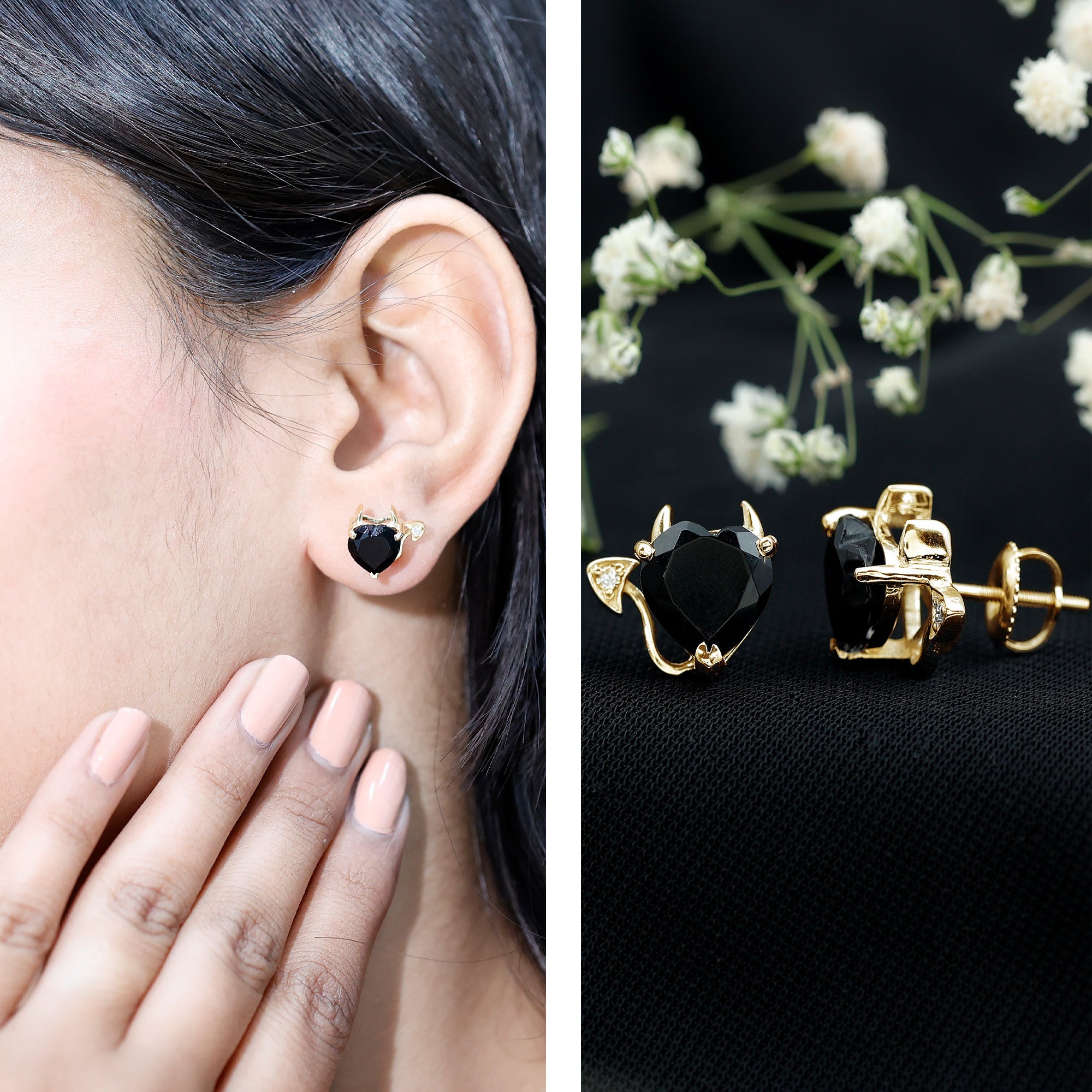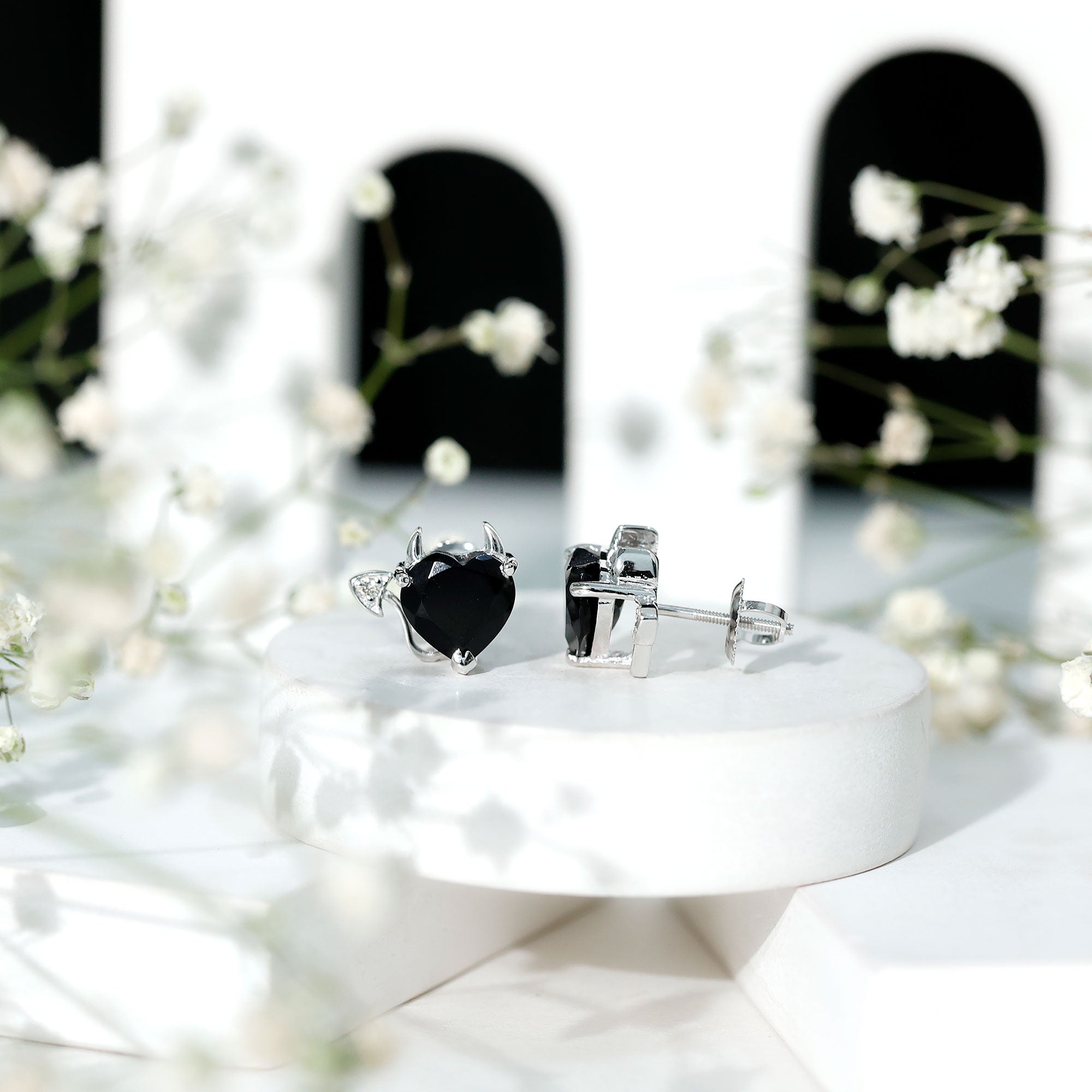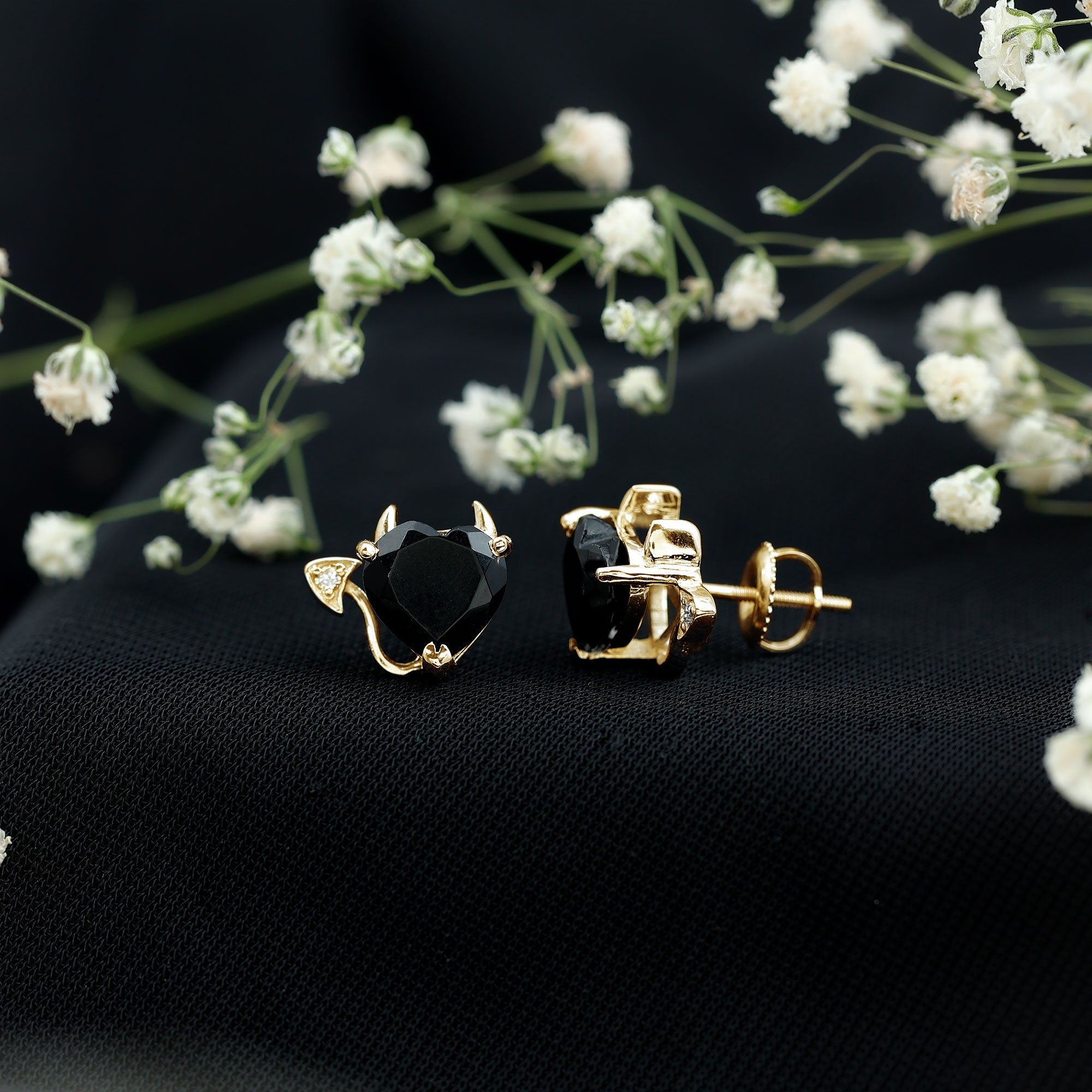 Turn heads with your impeccable style and captivating glamour. Our Gothic Stud Earrings feature an 8 MM heart shaped Lab Created Black Diamond that exudes stunning beauty. The tail is adorned with a White Diamond, making it a truly breathtaking piece that will captivate all who lay eyes on them. The combination of black and white diamonds in these Heart Stud Earrings is truly captivating. They are made with high-quality metal and come with a secure screw-back closure, so they stay in place all day. Whether you are dressing up for a special event or just adding something fun to your everyday look, these Lab Grown Black Diamond Earrings are easy and comfortable to wear. The playful devil-inspired design adds a bold twist, making the duo stylish and full of personality. They are a great choice for Halloween, date nights, or anytime you want to show a more daring side of yourself. These Gothic-style Black Heart Earrings offer a fun and unique accessory that stands out without trying too hard.