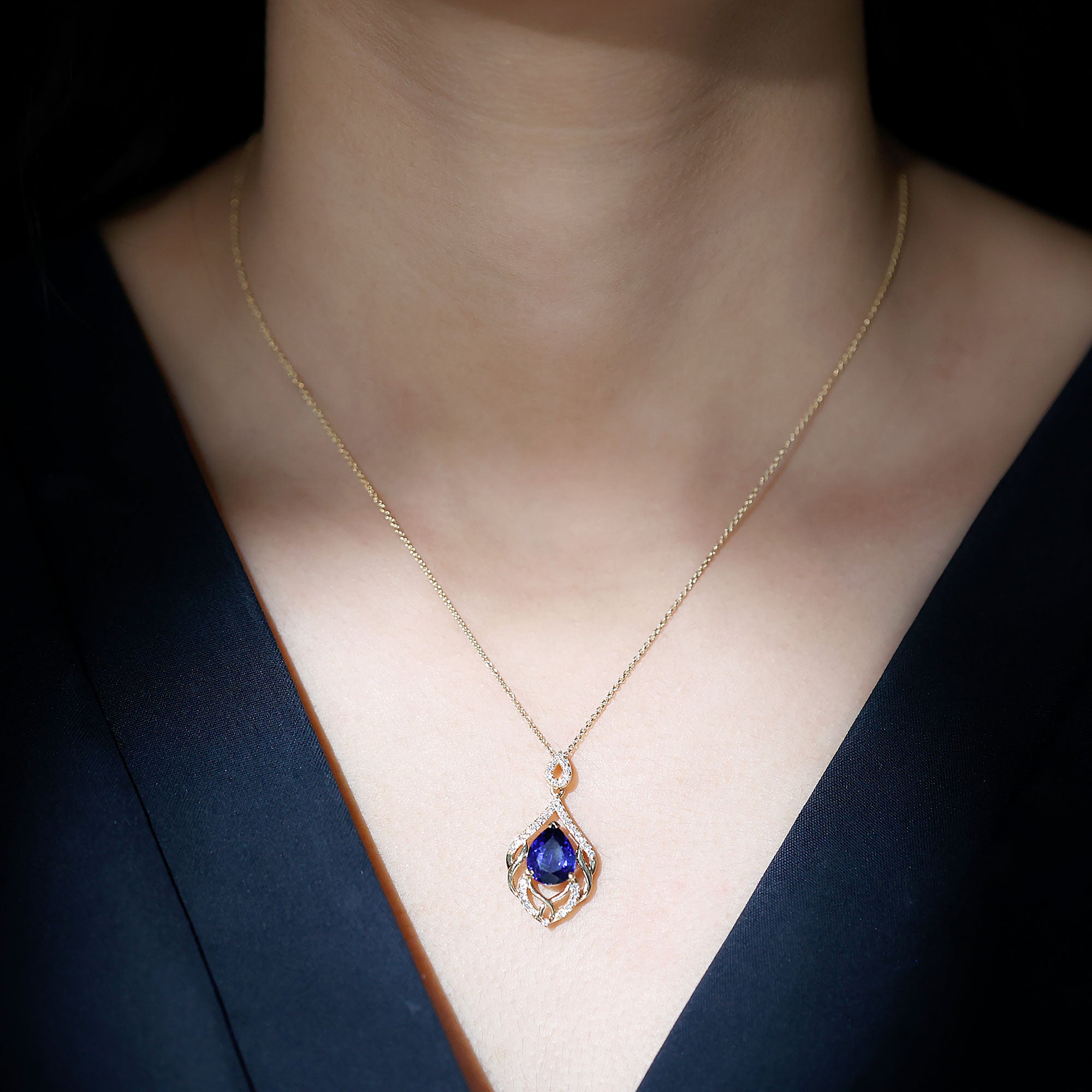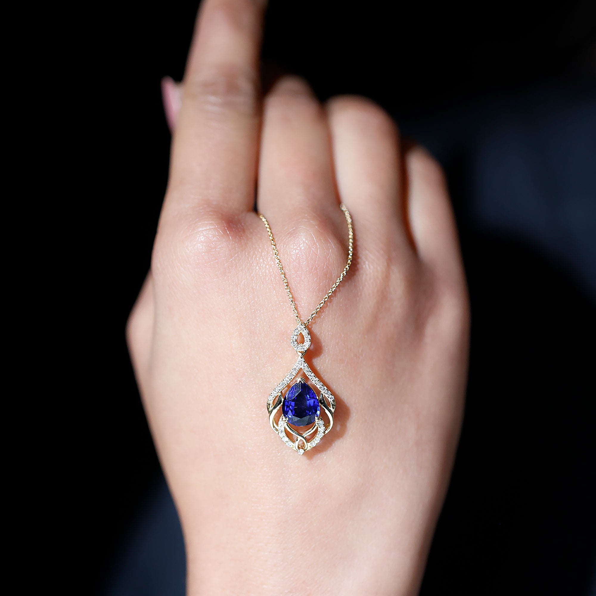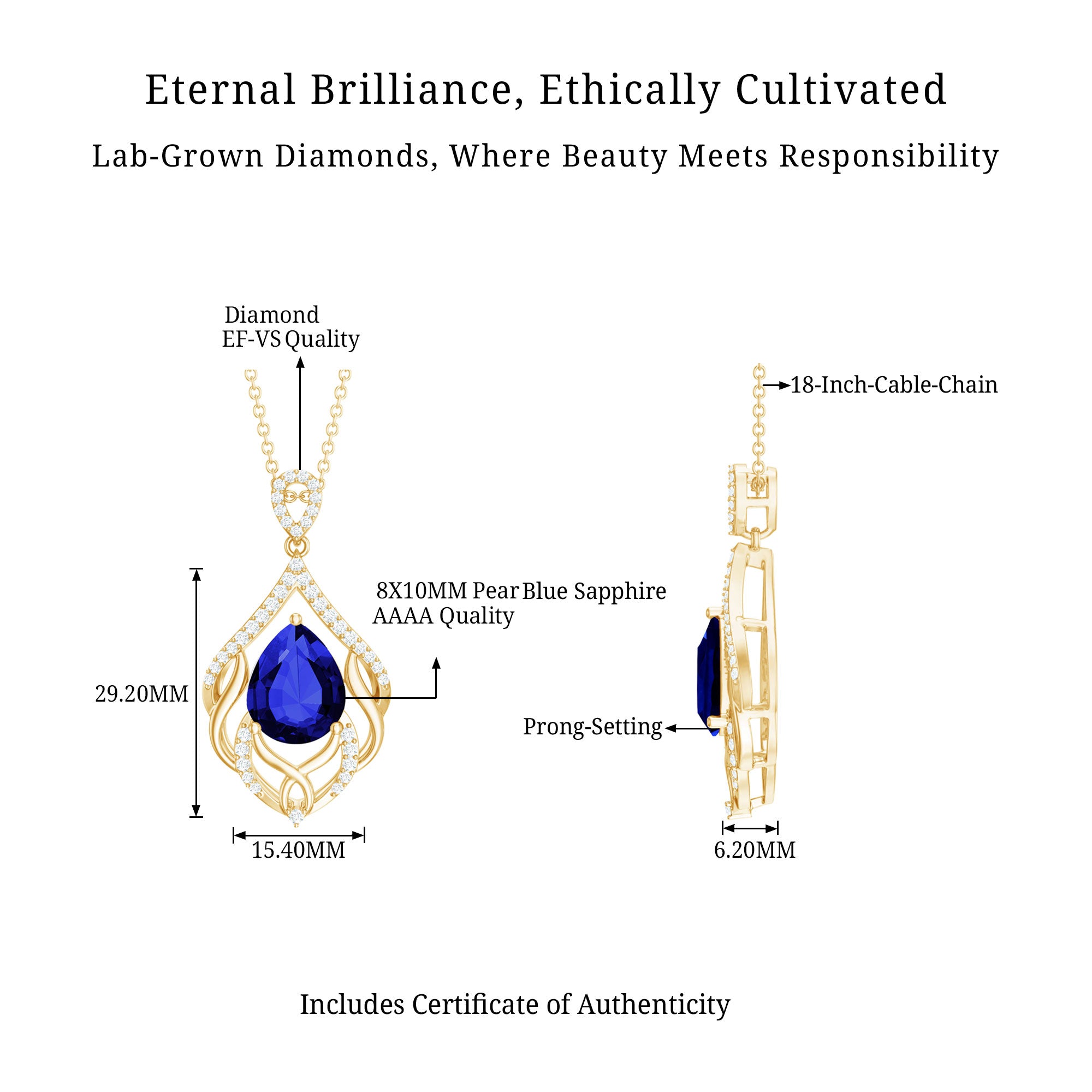 Indulge in the artistry of our Leaf Inspired Lab Created Blue Sapphire Pendant Necklace, where each detail whispers sophistication and grace. Our Designer Blue Sapphire Teardrop Pendant Necklace isnt just jewelry; its a statement, a symbol, and a dazzling chapter in your own love story. The design features a 8x10 mm Pear Shaped Synthetic Sapphire delicately cradled on a bed of leafy metal patterns, adorned by the shimmering embrace of round shape lab grown diamonds. Embrace the brilliance, adorn yourself with passion and shine of Aaaa quality Sapphire and Ef-Vs quality Diamonds, and let this Designer Necklace script your romance in gemstones! Rosec Jewels specializes in crafting stunning jewelry pieces using Certified Lab Cultured Gemstones.