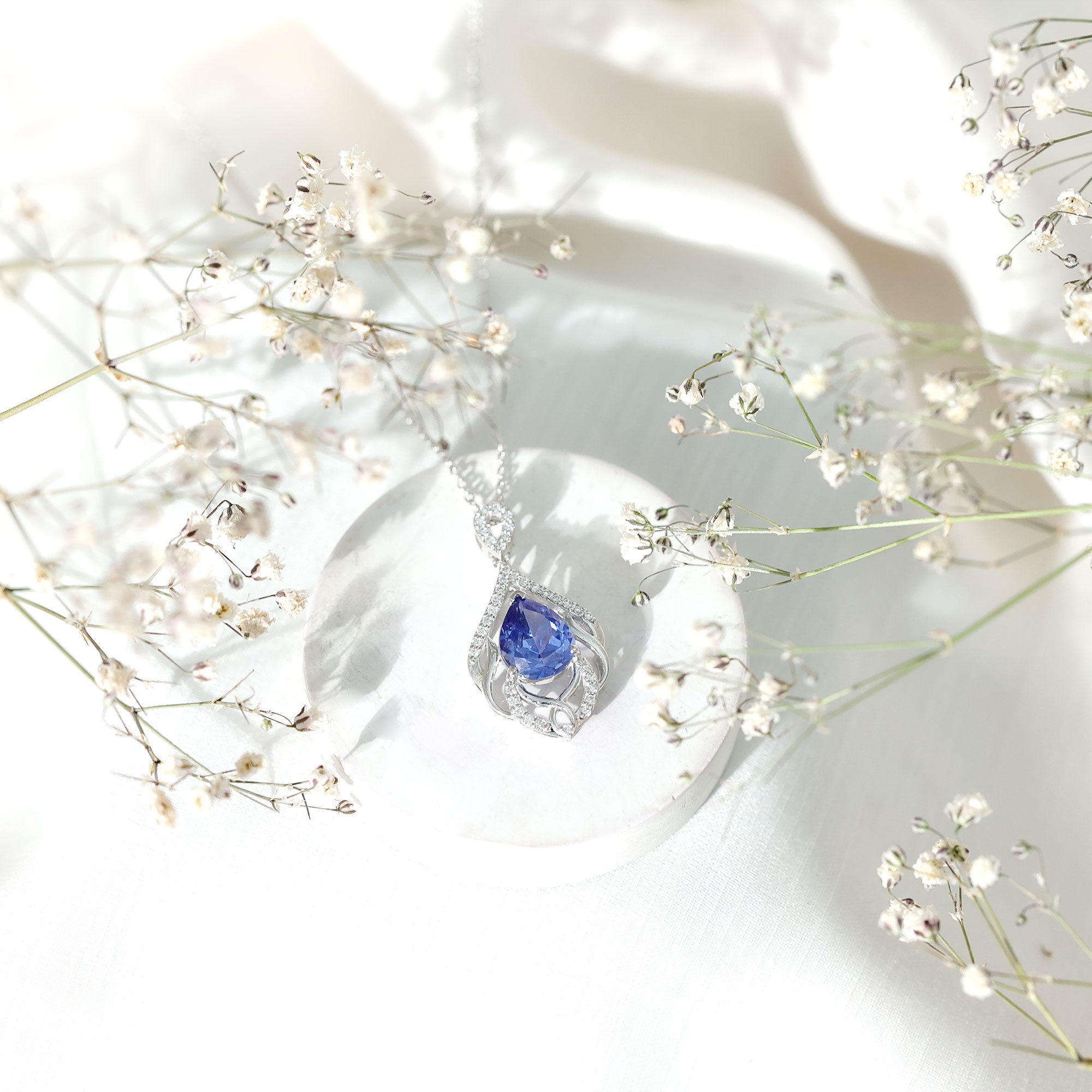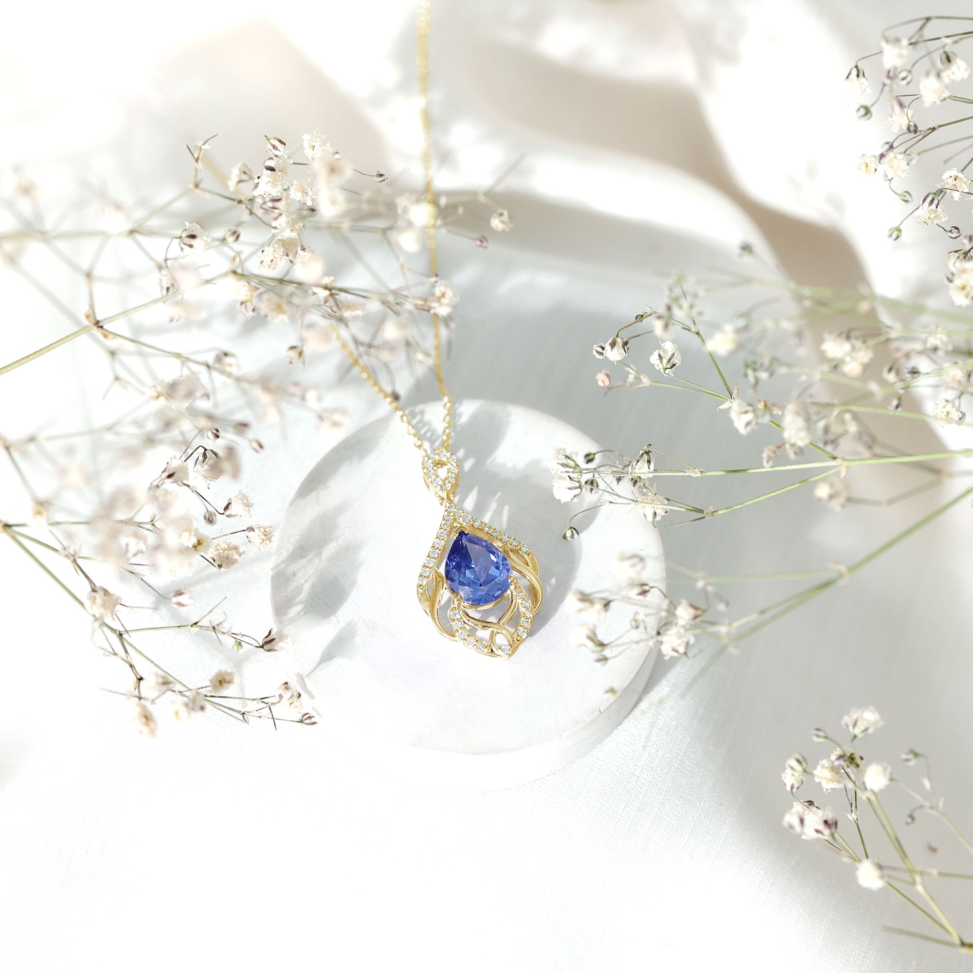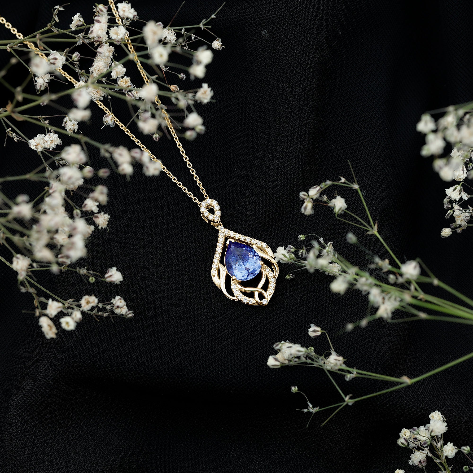 Indulge in the artistry of our Leaf Inspired Lab Created Blue Sapphire Pendant Necklace, where each detail whispers sophistication and grace. Our Designer Blue Sapphire Teardrop Pendant Necklace isnt just jewelry; its a statement, a symbol, and a dazzling chapter in your own love story. The design features a 8x10 mm Pear Shaped Synthetic Sapphire delicately cradled on a bed of leafy metal patterns, adorned by the shimmering embrace of round shape lab grown diamonds. Embrace the brilliance, adorn yourself with passion and shine of Aaaa quality Sapphire and Ef-Vs quality Diamonds, and let this Designer Necklace script your romance in gemstones! Rosec Jewels specializes in crafting stunning jewelry pieces using Certified Lab Cultured Gemstones.