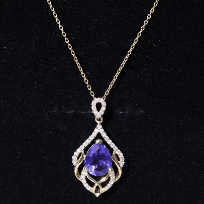 Indulge in the artistry of our Leaf Inspired Lab Created Blue Sapphire Pendant Necklace, where each detail whispers sophistication and grace. Our Designer Blue Sapphire Teardrop Pendant Necklace isnt just jewelry; its a statement, a symbol, and a dazzling chapter in your own love story. The design features a 8x10 mm Pear Shaped Synthetic Sapphire delicately cradled on a bed of leafy metal patterns, adorned by the shimmering embrace of round shape lab grown diamonds. Embrace the brilliance, adorn yourself with passion and shine of Aaaa quality Sapphire and Ef-Vs quality Diamonds, and let this Designer Necklace script your romance in gemstones! Rosec Jewels specializes in crafting stunning jewelry pieces using Certified Lab Cultured Gemstones.
