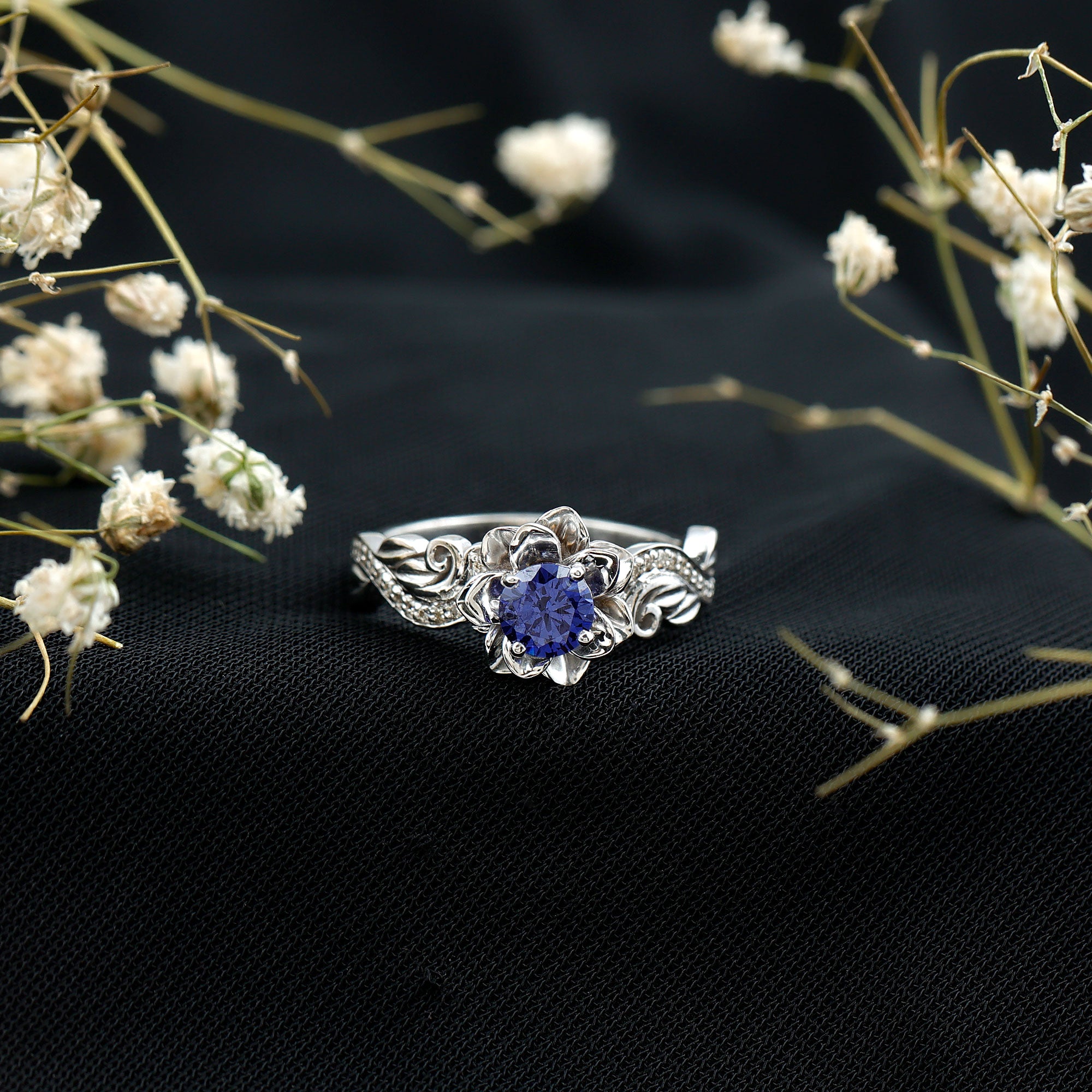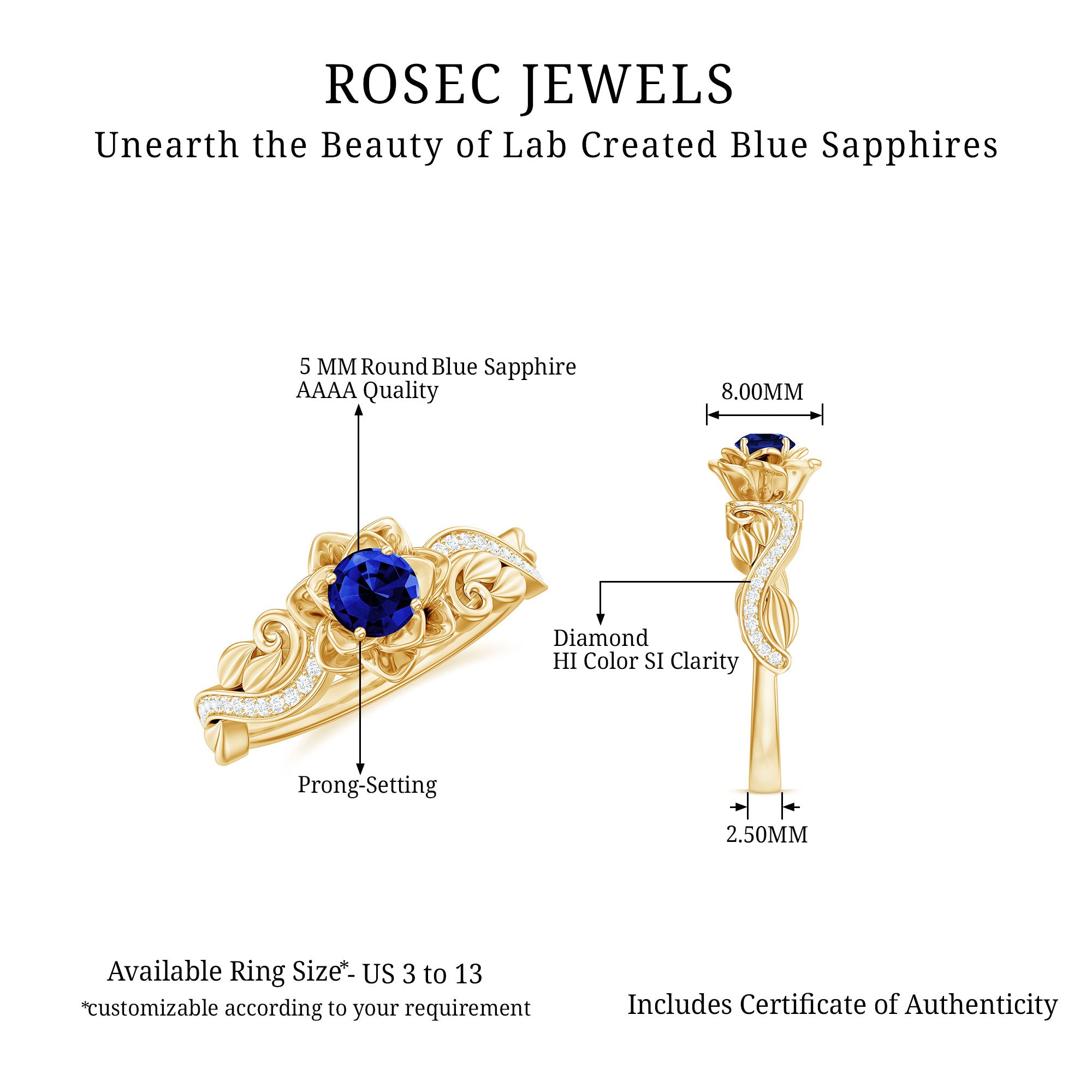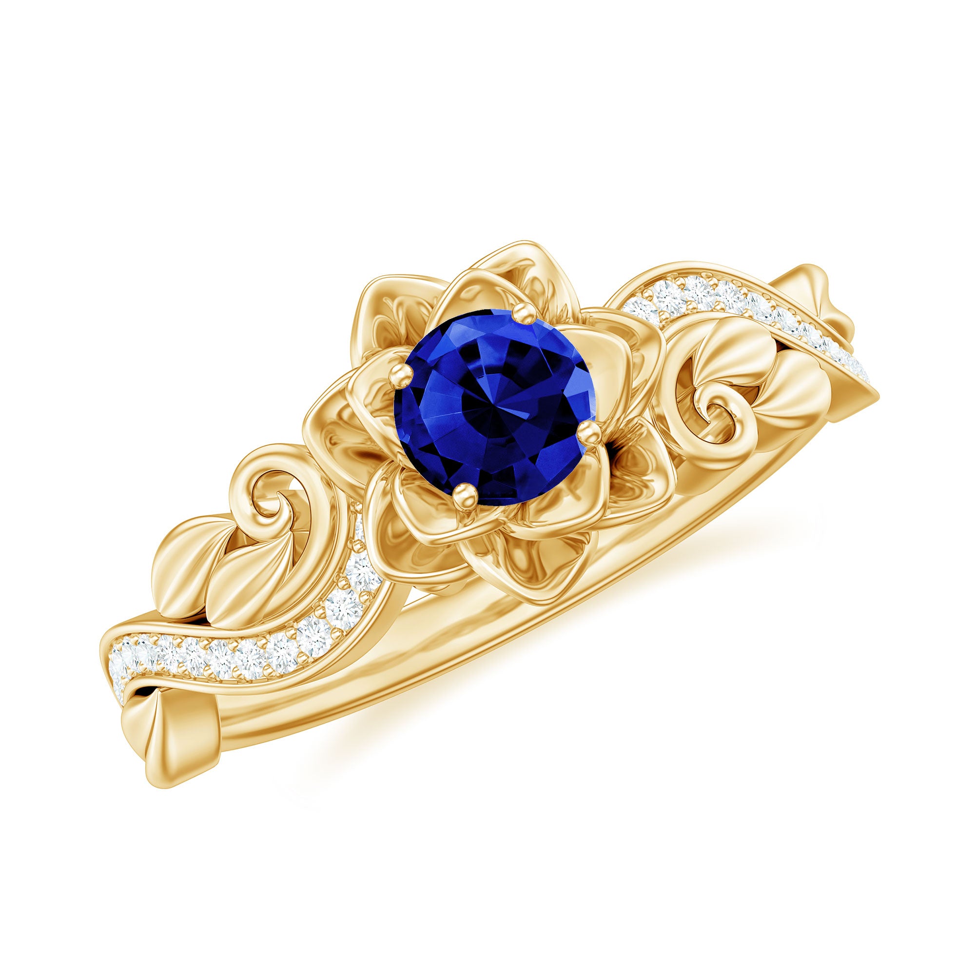 The bloom of true love shines beautifully in this enchanting Flower Engagement Ring, a design inspired by the most delicate and meaningful forms of nature. At the center of the floral motif sits a radiant 5 mm Round Shape Lab Created Blue Sapphire set in Prong Setting, glowing with a rich and captivating blue that symbolizes loyalty, wisdom and lasting devotion. Surrounding the center stone, the flower-inspired design creates a graceful and romantic look that captures the beauty of a blossom in full bloom. The band continues the nature inspired story with elegant leaf details, gently adorned with sparkling Diamond stones that add a soft shimmer from every angle. Each curve of this Lab Grown Blue Sapphire Engagement Ring is thoughtfully crafted to reflect growth, harmony and the journey of two hearts coming together. Its delicate yet eye-catching design makes it perfect for someone who loves jewelry with meaning, charm and a touch of natural beauty. Whether chosen for a heartfelt proposal or to celebrate a special chapter in your love story, this Lab Blue Sapphire Diamond Ring carries a timeless sense of romance. Presented in a signature jewelry box and available in a variety of ring sizes for the perfect fit, this beautiful Nature Inspired Engagement Ring is a sparkling symbol of a love that continues to grow and blossom forever.
