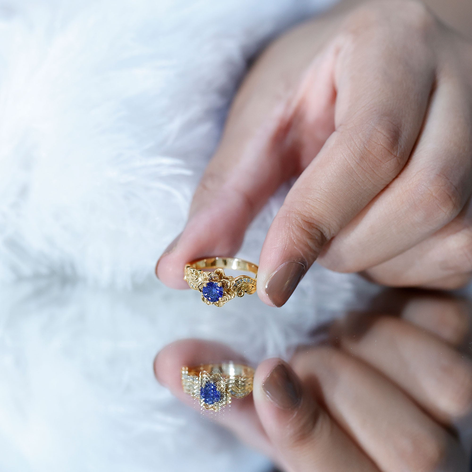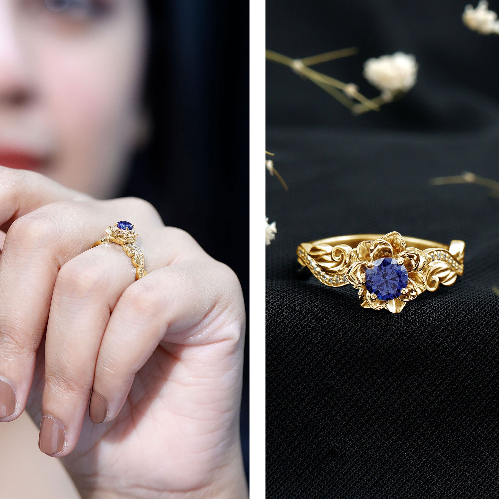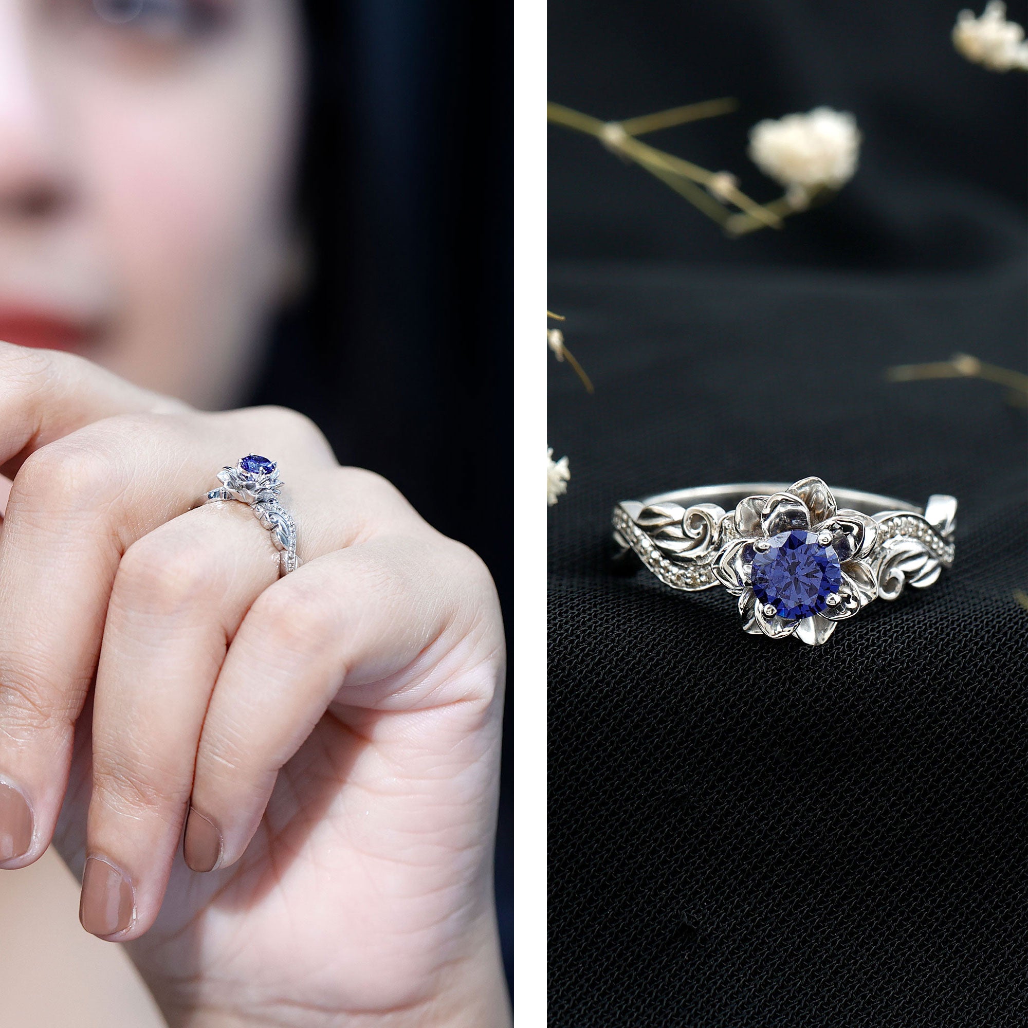 The bloom of true love shines beautifully in this enchanting Flower Engagement Ring, a design inspired by the most delicate and meaningful forms of nature. At the center of the floral motif sits a radiant 5 mm Round Shape Lab Created Blue Sapphire set in Prong Setting, glowing with a rich and captivating blue that symbolizes loyalty, wisdom and lasting devotion. Surrounding the center stone, the flower-inspired design creates a graceful and romantic look that captures the beauty of a blossom in full bloom. The band continues the nature inspired story with elegant leaf details, gently adorned with sparkling Diamond stones that add a soft shimmer from every angle. Each curve of this Lab Grown Blue Sapphire Engagement Ring is thoughtfully crafted to reflect growth, harmony and the journey of two hearts coming together. Its delicate yet eye-catching design makes it perfect for someone who loves jewelry with meaning, charm and a touch of natural beauty. Whether chosen for a heartfelt proposal or to celebrate a special chapter in your love story, this Lab Blue Sapphire Diamond Ring carries a timeless sense of romance. Presented in a signature jewelry box and available in a variety of ring sizes for the perfect fit, this beautiful Nature Inspired Engagement Ring is a sparkling symbol of a love that continues to grow and blossom forever.