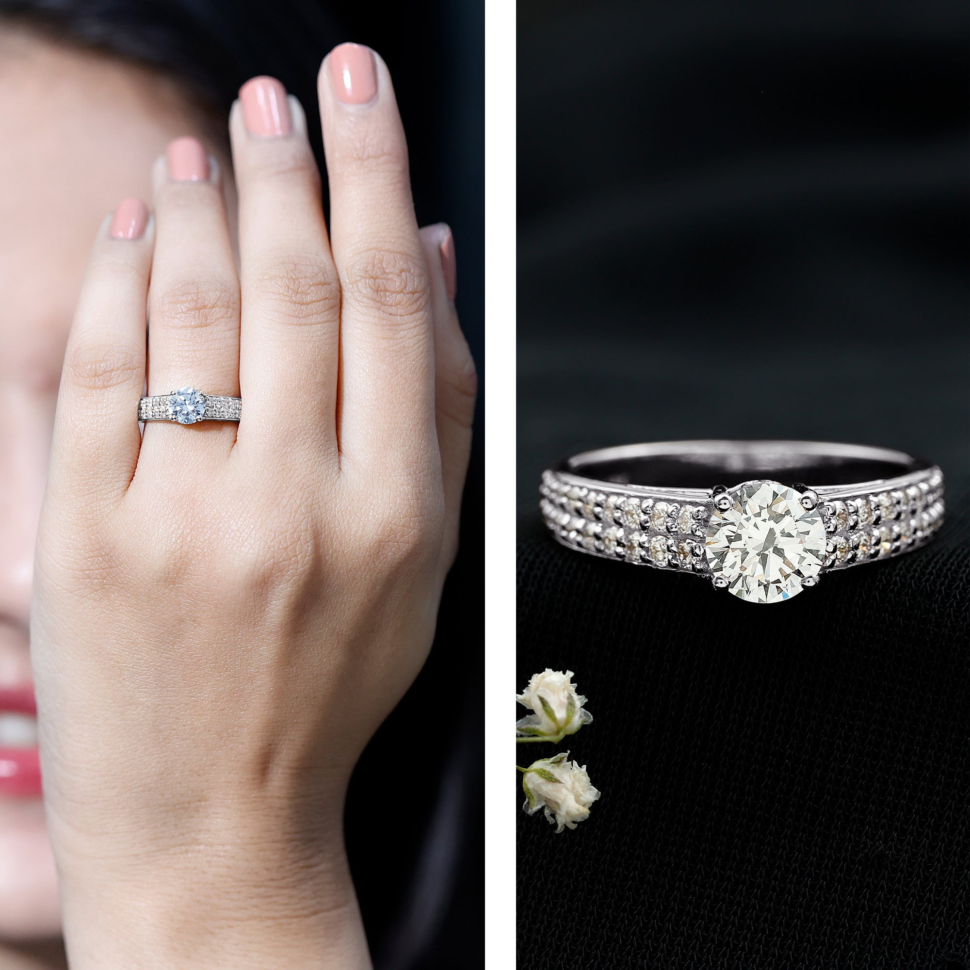 Timeless and classic this Lab Grown Diamond Ring has an eye-catching design that creates display of fire and brilliance. It is uniquely adorned with 6 MM Round Shaped Lab Grown Diamond in Prong Setting, with a cluster of Diamond gemstones in paved effect that adds shine to the ring and makes it a great choice for the bride-to-be who wants a glamorous and modern look. This Diamond Engagement Ring is a sentimental choice for her special day. Symbolizing eternal joy this breathtakingly beautiful Engagement Ring For Women is a go to choice that ensures it will be cherished for years to come.