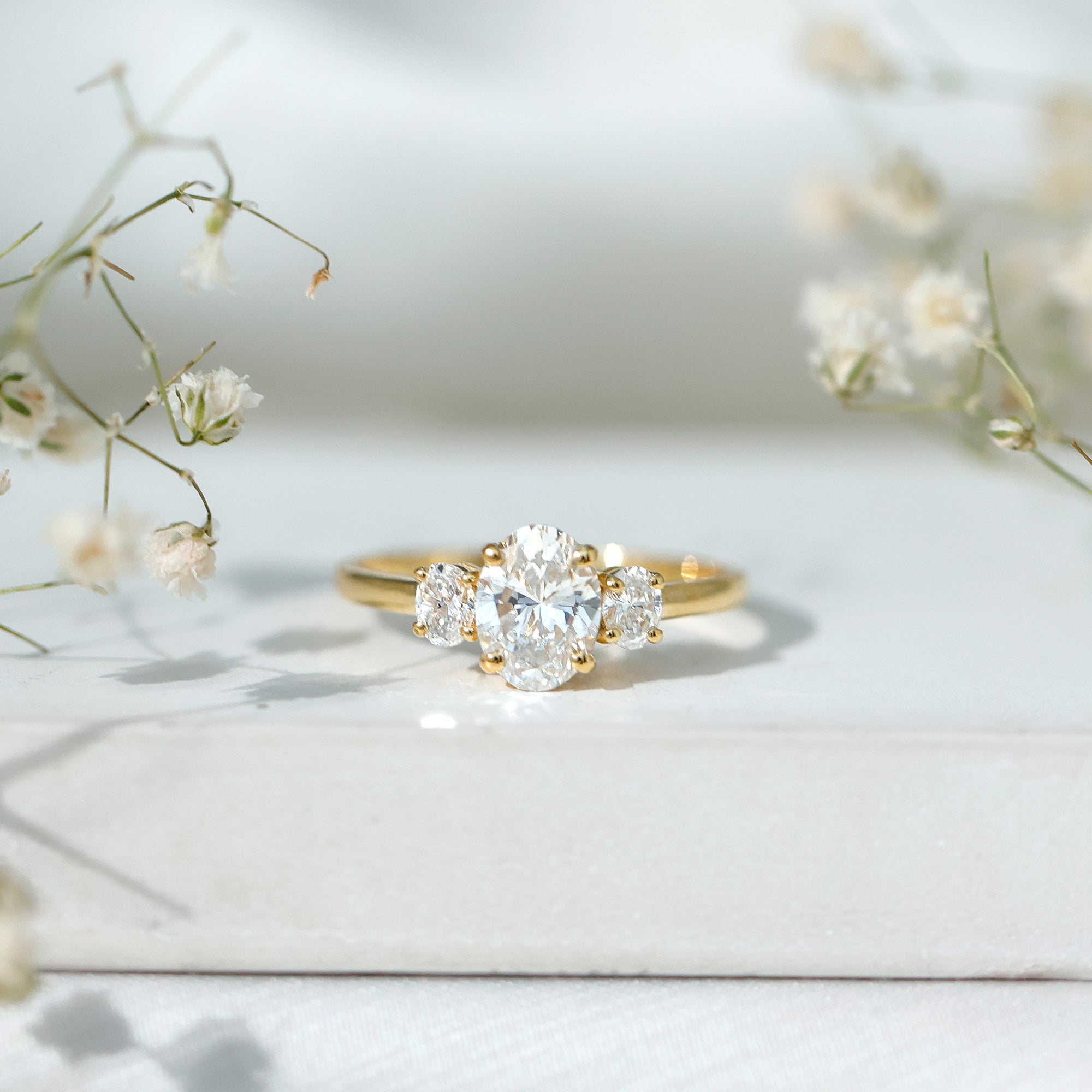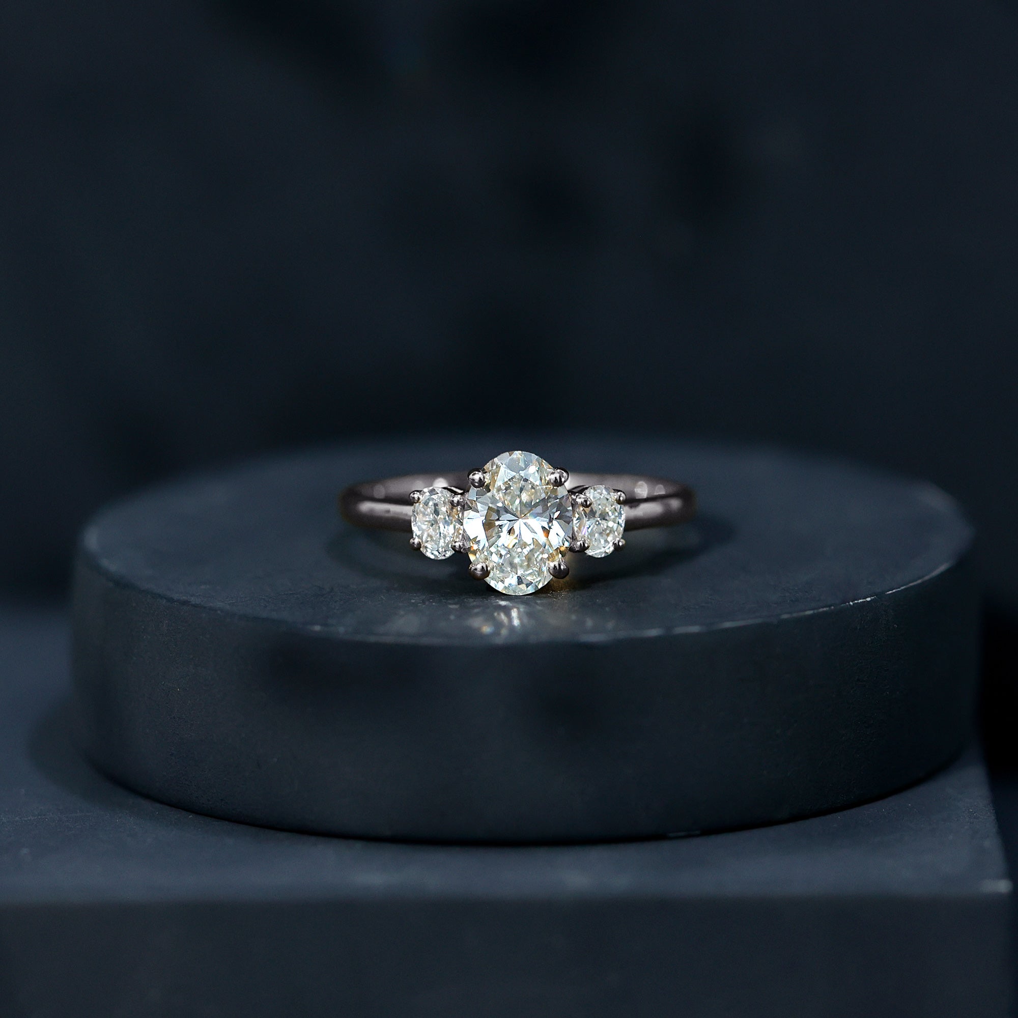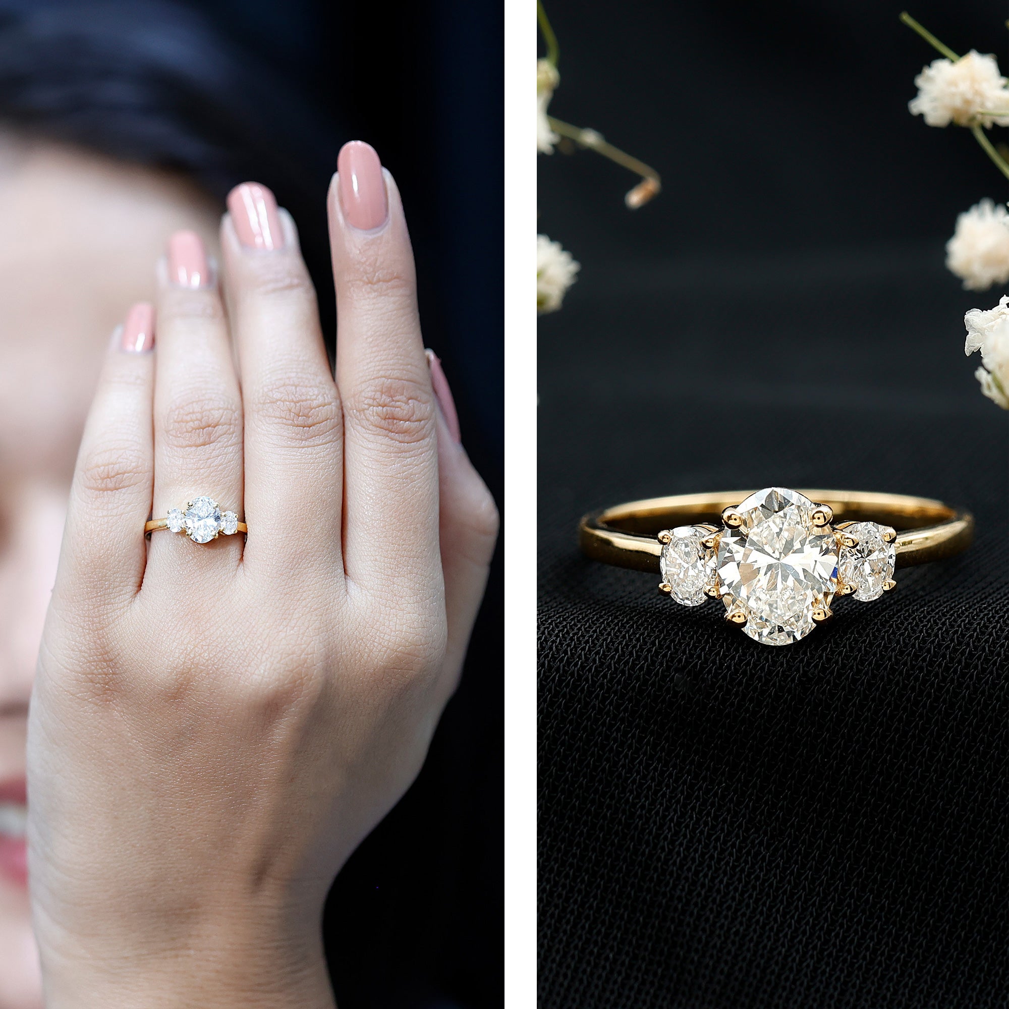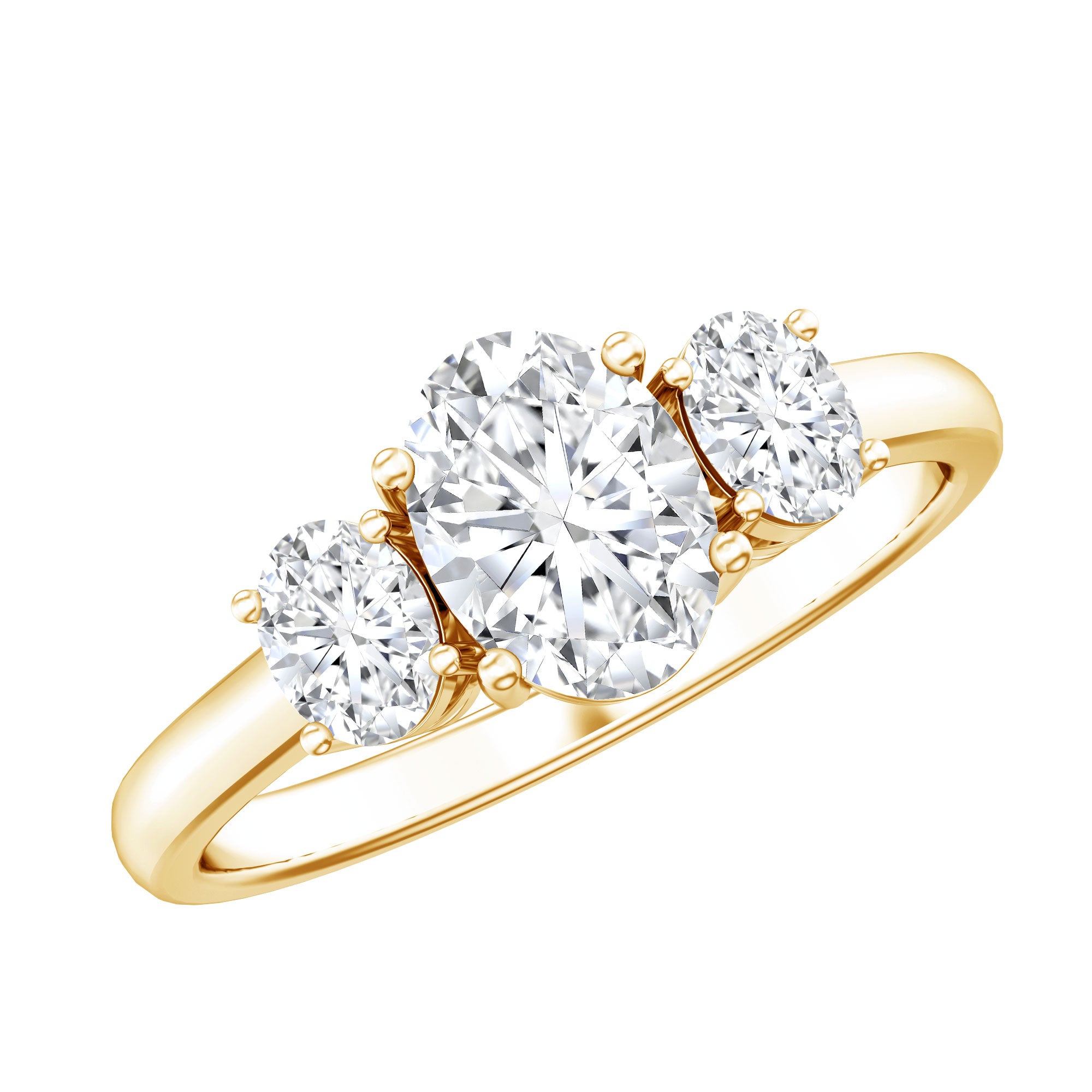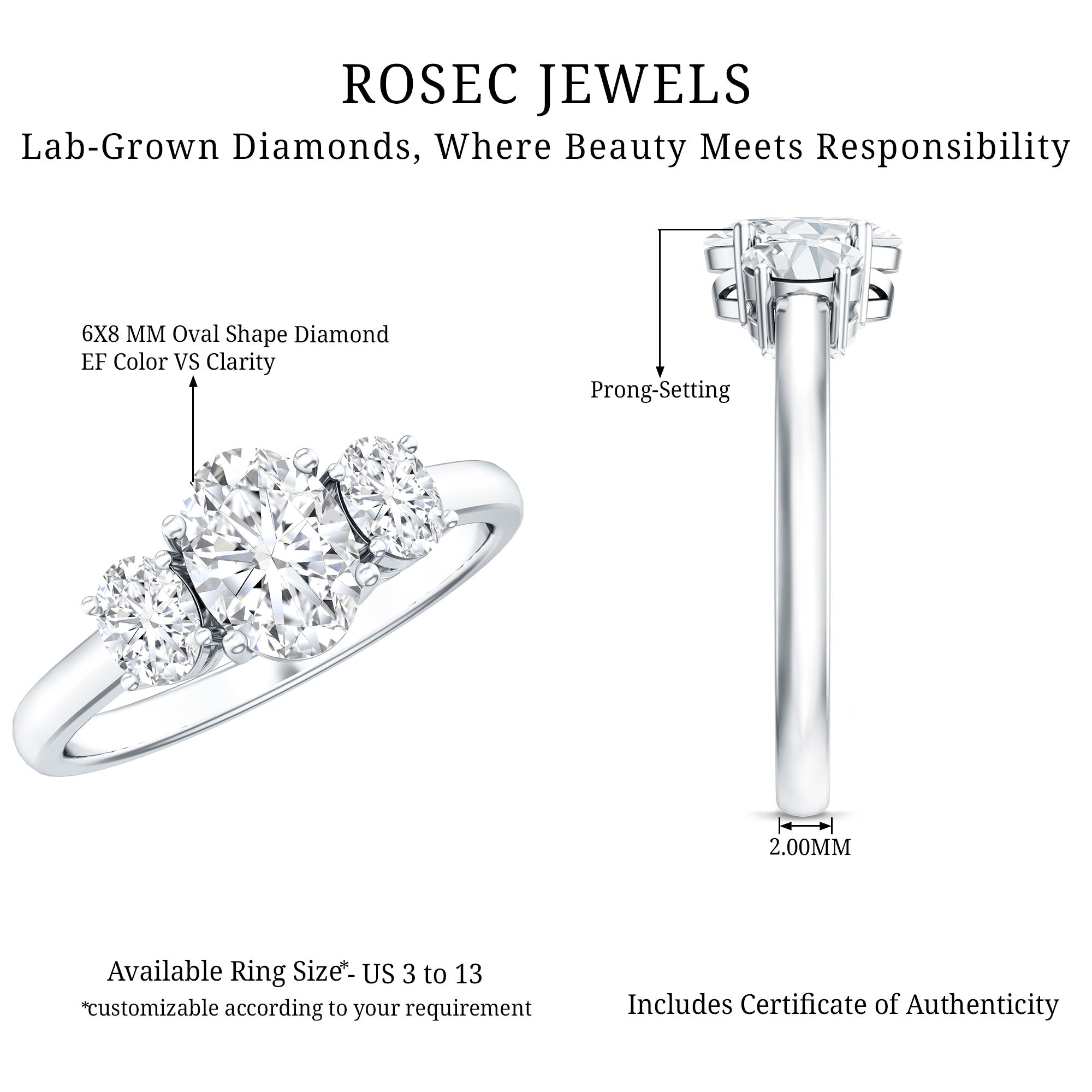 Celebrate every moment of your love story with this classic Diamond Engagement Ring. This Three Stone Engagement Ring is more than just a piece of jewelry, its a reflection of your unconditional love. Featuring three oval cut diamonds (EF-VS Quality), each set in a secure prong setting, this Lab Grown Diamond Ring captures the essence of your past, present, and future. Designed with timeless elegance, the Low Profile Ring is perfect for celebrating a bond that will last forever. Whether you are starting a new chapter together or looking for a way to express your commitment, this Simplistic Ring will forever remind you of the love you share.
