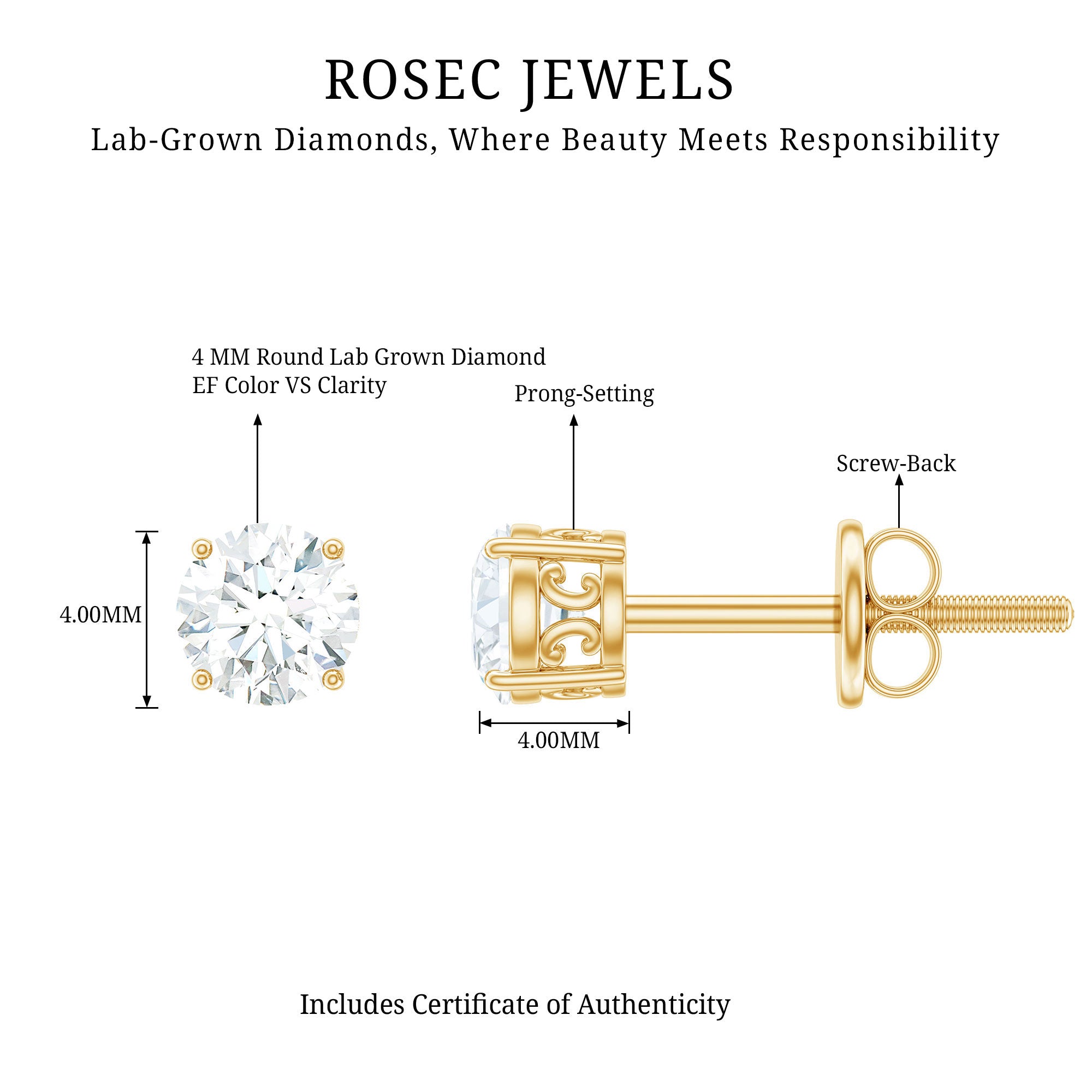 Celebrate love with the shine of Lab Grown Diamond Studs by Rosec Jewels. These fine earrings are handcrafted with a 4 mm Round Shape Lab Grown Diamond securely placed in 4 Prong Setting with the Screw Back Closure. The shine of EF-VS Quality Lab Grown Diamonds will complement the celebration of the occasion. These Solitaire Diamond Studs will make her feel special and leave her surprised with your beautiful choice of these studs. To ensure that your feeling are special for the women in your life, we will ship these Round Diamond Studs in the Premium Quality Gift Box.