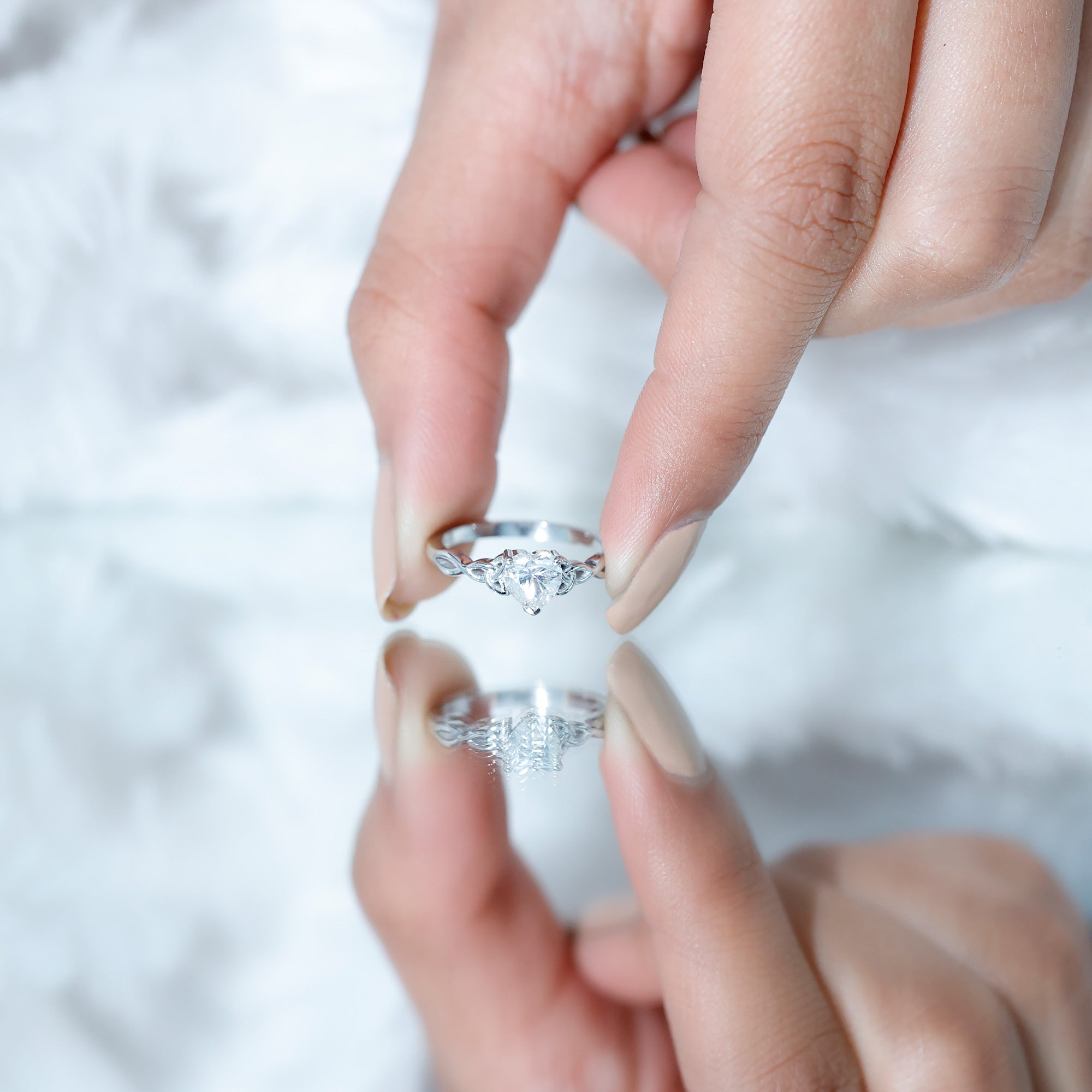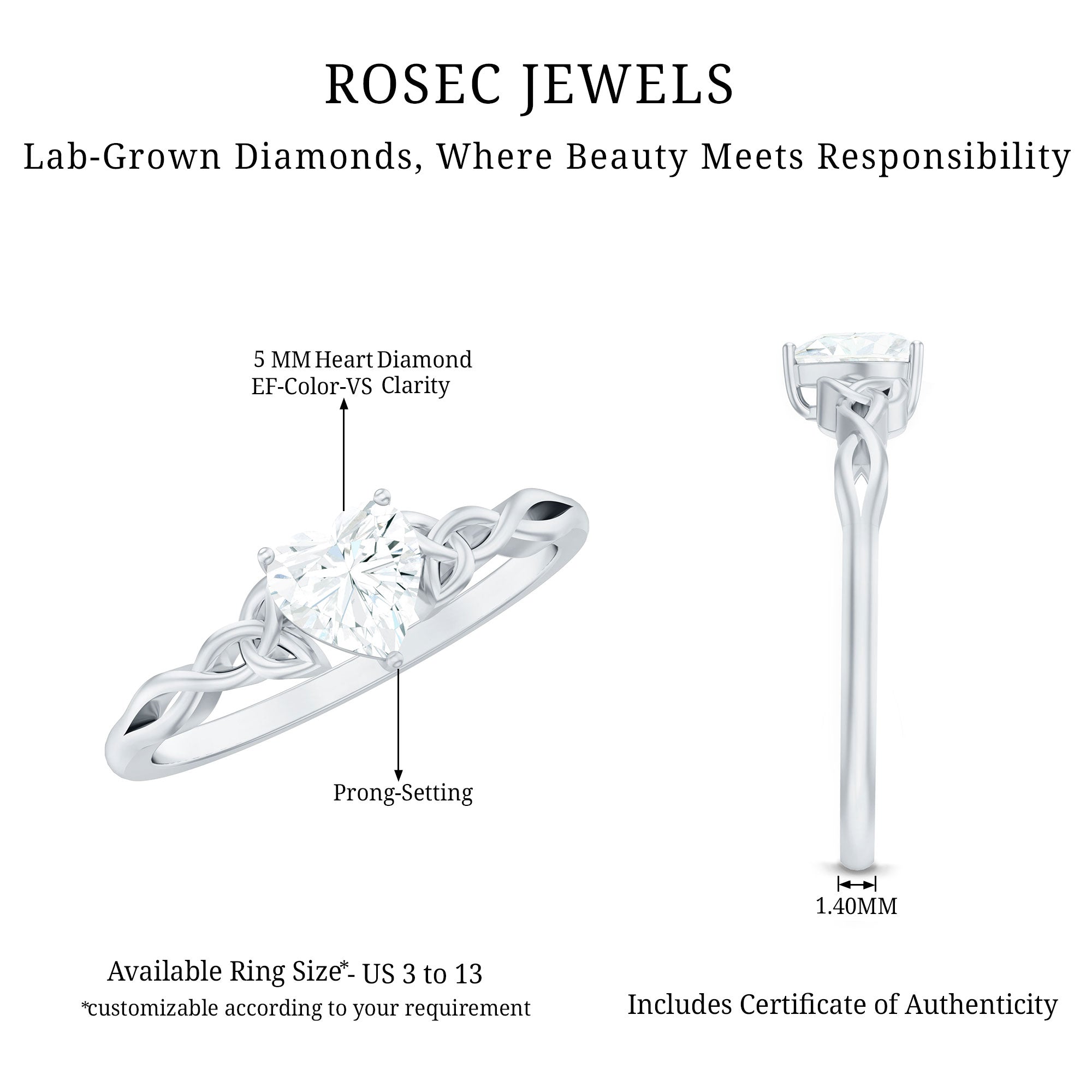 Surprise her by presenting this mesmerizing Heart Shape Promise Ring and make her feel truly special. Crafted with perfection by Rosec Jewels, this Solitaire Ring features a 5 MM heart shape diamond of EF color and VS clarity, set in a secure 3 prong setting. The Celtic knot design on the band symbolizes an eternal bond, making it a unique and meaningful piece. A perfect addition to her Jewelry Collection, this Lab Grown Diamond Ring shows that our brand is committed to creating environment-friendly jewelry pieces.