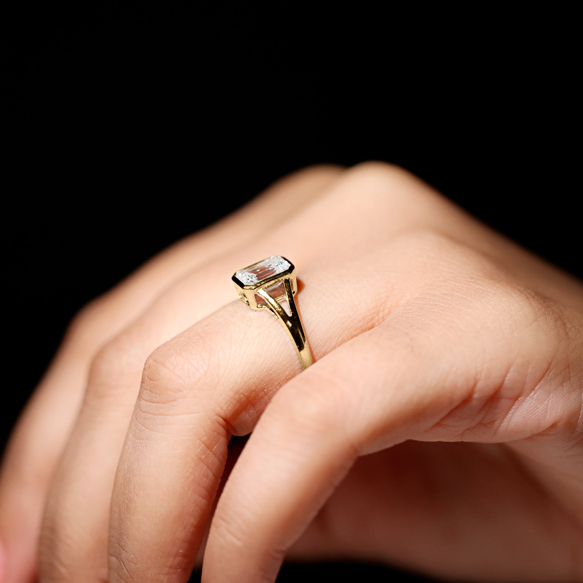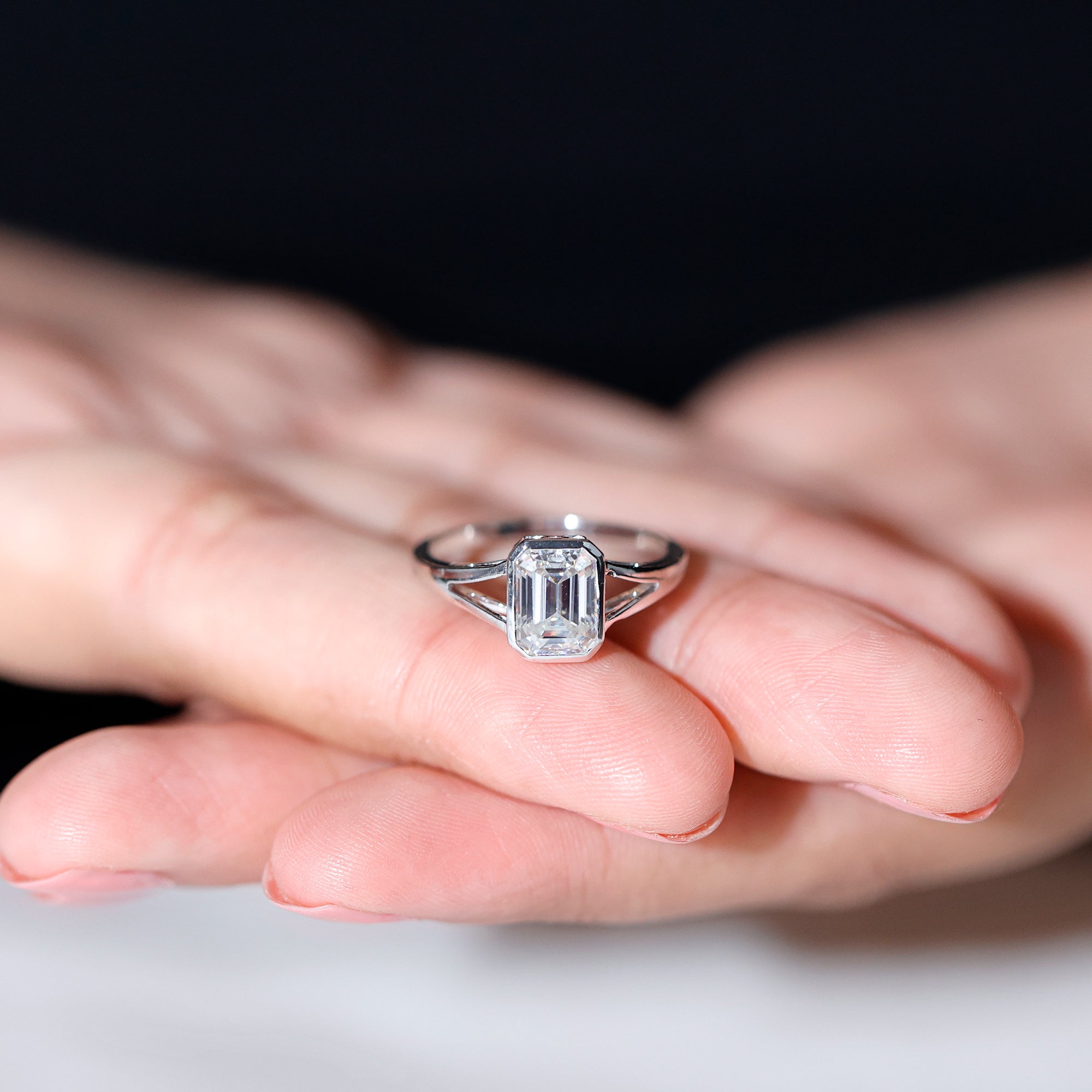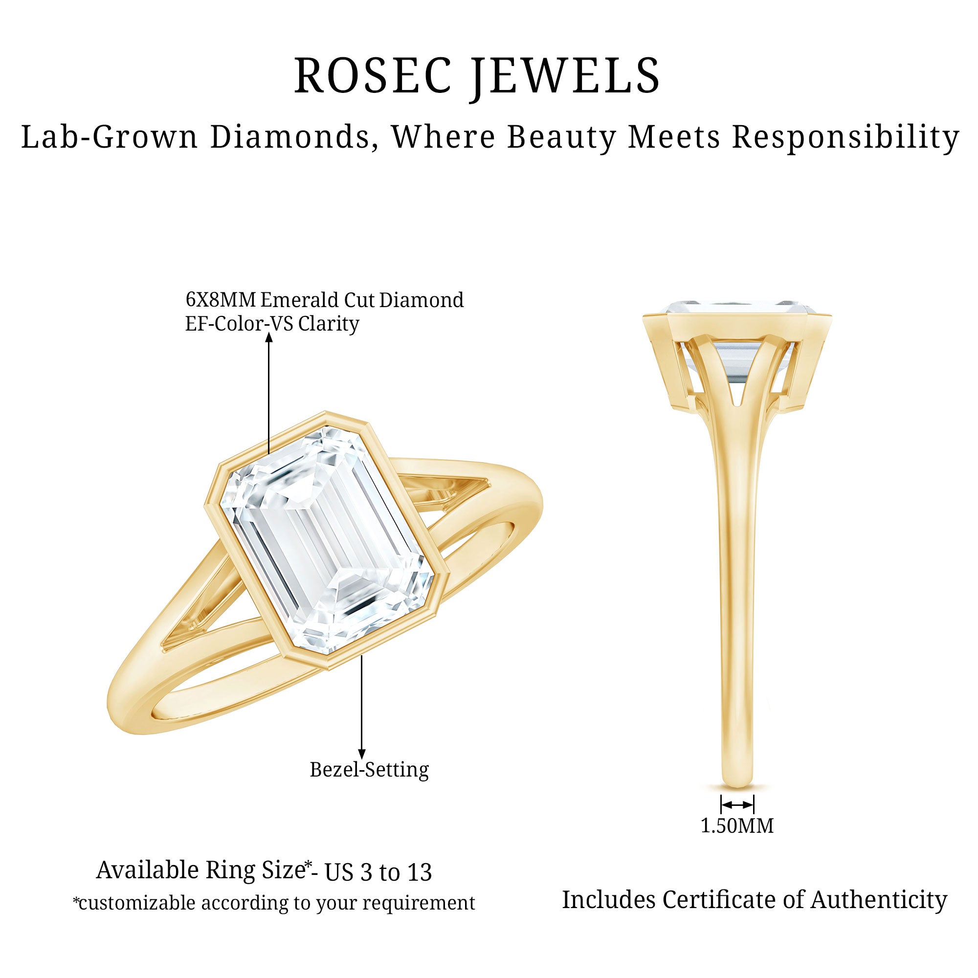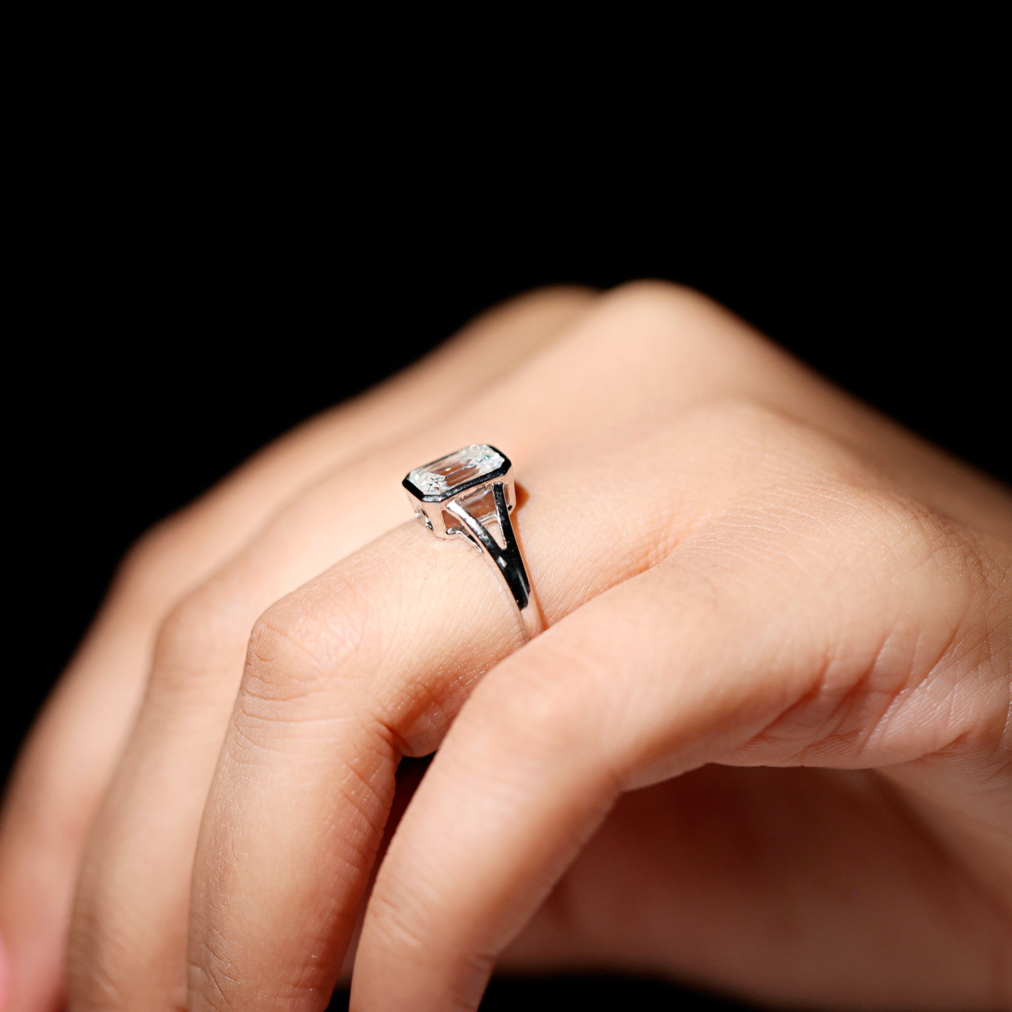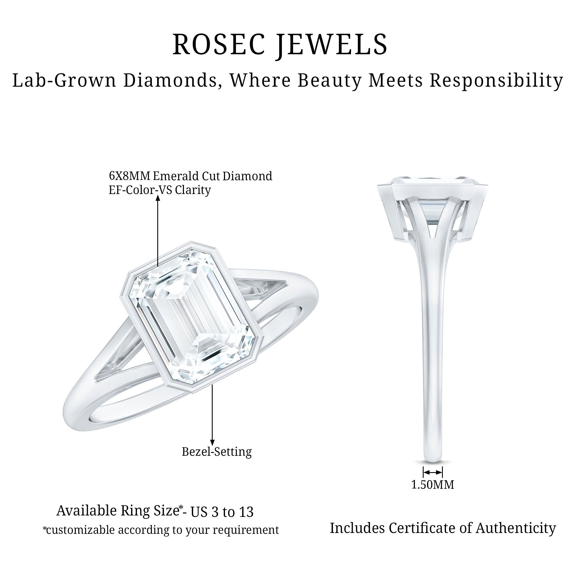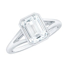 With elegant simplicity and timeless gracefulness, this Lab Grown Diamond Engagement Ring has a bold and glamorous shape that favors an art deco style. With hearts intertwined and reminiscent of dearest memories, this ring is adorned with a 6X8 MM Emerald Cut Lab Grown Diamond in Bezel Setting as Solitaire along with the Split Shank. Its geometric shape and brilliant reflection make it a fantastic choice for an engagement. This Emerald Cut Engagement Ring has treasured moments of anticipation and joy. Exuding opulence and grace this Solitaire Engagement Ring symbolises the union of two souls and embodies a timeless love story.