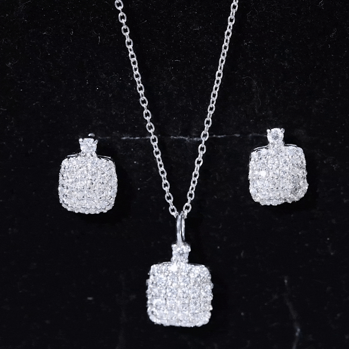 Are you looking to bring a touch of sparkle to your day or surprise someone with an unforgettable gift? This Diamond Jewelry Set is designed to do just that - effortlessly elegant, irresistibly radiant, and ready to shine the moment the box is opened. Crafted with EF-VS Quality Diamonds for exceptional clarity and brilliance, each piece embodies timeless beauty with a contemporary flair. The Necklace and Earrings Set showcases delicate round cut lab grown diamonds set in prong setting with a square design. The Stud Earrings come with a secure Screw Back Closure for your peace of mind and everyday convenience, while the Pendant flows elegantly on a sleek chain that complements virtually any outfit in your wardrobe. Whether it is for a coffee date or your wedding day, this Lab Grown Diamond Necklace Set transitions effortlessly and adds a glow that is sure to catch attention. This Bridal Necklace Set is beautifully presented in a signature jewelry box, making it a thoughtful and personal surprise that is ready to gift.