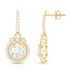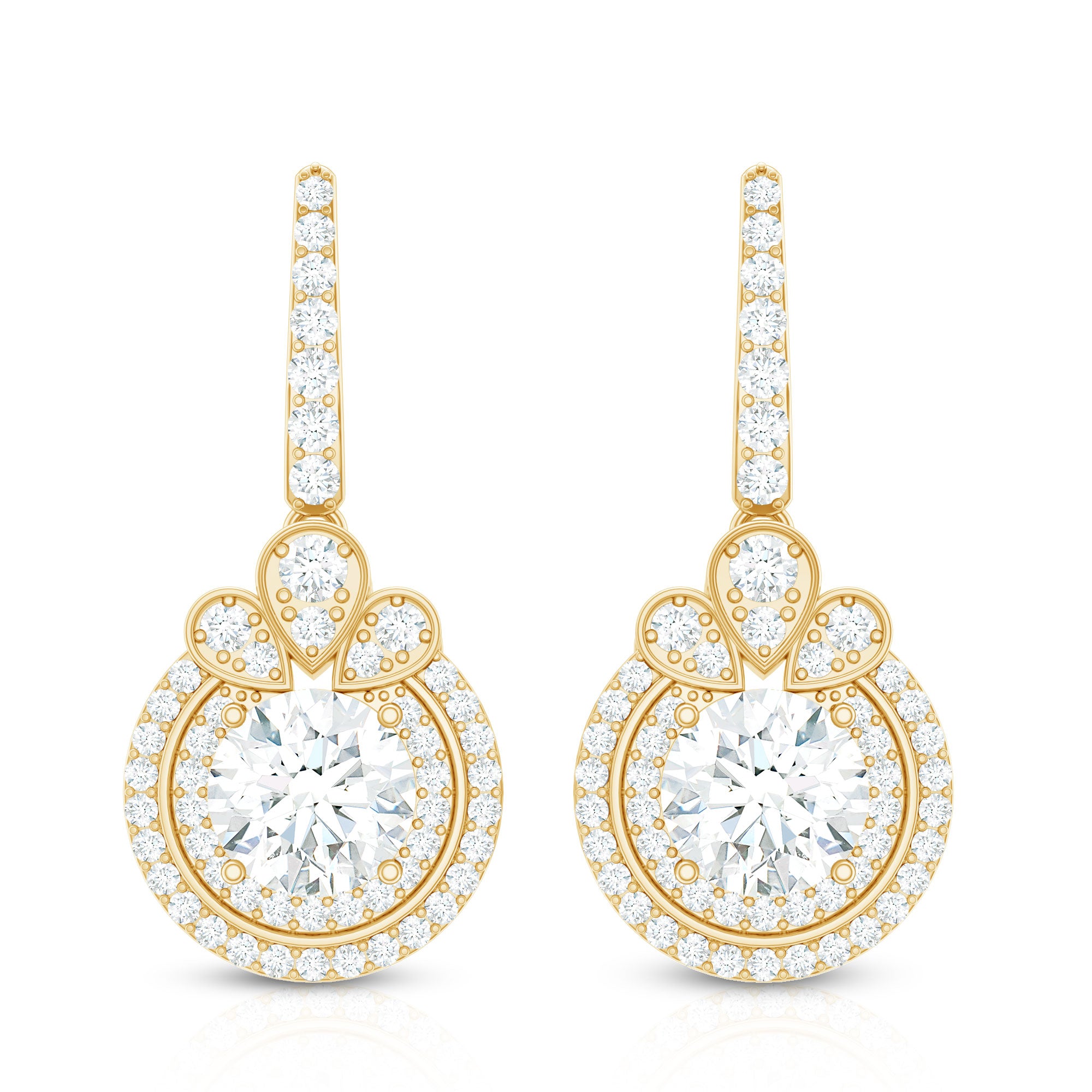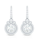 In these Bridal Earrings, a 6 MM round shaped diamond (lab grown) takes center stage, beautifully framed by a diamond double halo and dangling from a decorative bar at the top. Three delicate pear shaped motifs encrusted with diamonds sit gracefully above the center stone, adding a regal touch to the design. Secure prongs hold each gemstone in place, enhancing its brilliance, while the screw back closure ensures the earrings sit safely on your earlobes, offering a flawless fit with every wear. Our Diamond Wedding Earrings will add the perfect sparkle to your bridal glow. The Lab Grown Diamond Earrings are an affordable option for those born in April or those whose zodiac sign is Aries, these Dangling Earrings hold even deeper meaning, representing clarity, love, and strength.