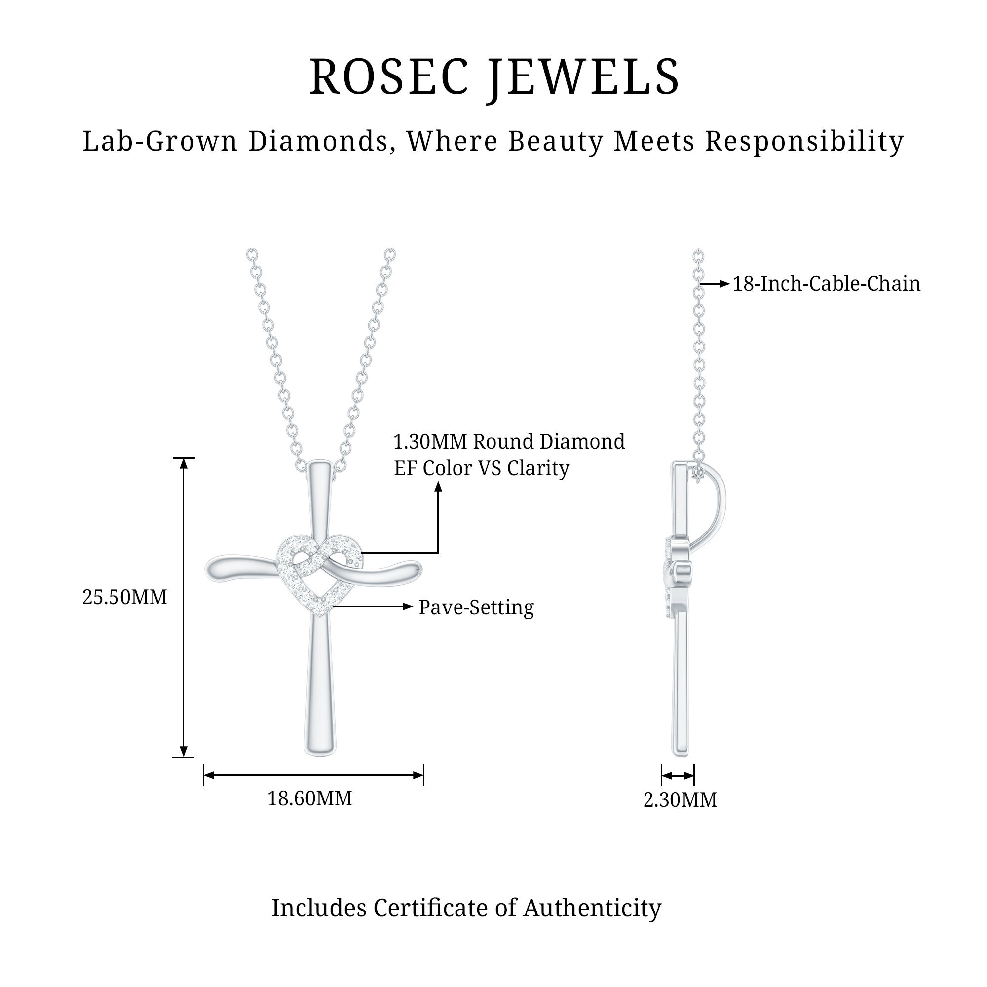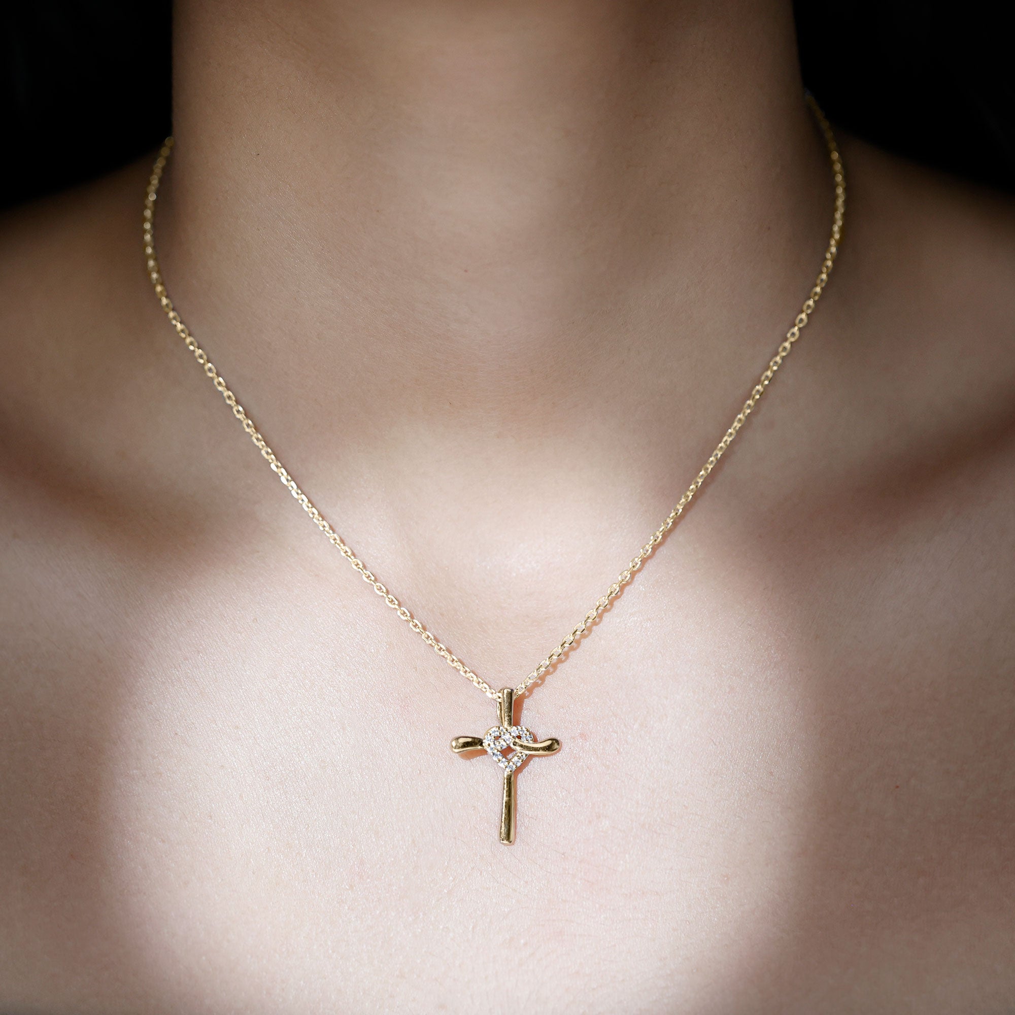 This gorgeous Cross Pendant is more than just a piece of jewelry, it is a powerful symbol of love and faith. This Diamond Cross Necklace features a gracefully flowing ribbon-like structure with an intertwined heart shape knot adorned with sparkling lab made diamonds of EF-VS quality. A hidden bail allows the Meaningful Necklace to look like it is floating effortlessly. Whether you wear it solo or stack it with a pendant, this definitely turns every head. You can present this as a gift for christmas, birthday gift, an anniversary gift, or a romantic surprise, this Cross Heart Necklace beautifully marks lifes most cherished moments. The lab made diamonds ensure affordability while being eco-friendly, offering the same brilliance and durability as natural stones. Also, our jewelry comes with a certificate of authenticity.