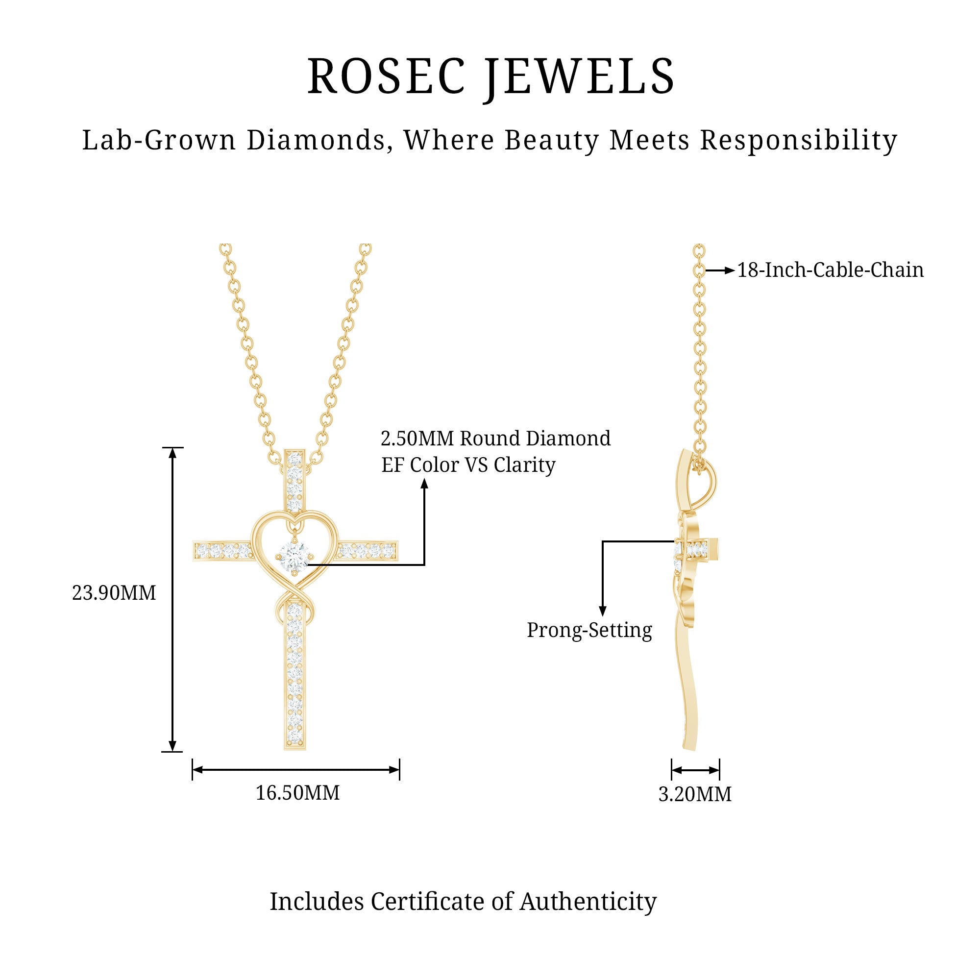 Rosec Jewels Diamond Cross Necklace is a beautifully crafted piece that blends faith, love, and eternity into one elegant design. It features a powerful cross design adorned with horizontal and vertical bars of sparkling round cut diamonds of EF-VS Quality. At the center of the Lab Grown Diamond Pendant Necklace lies an elegant infinity heart shape, artistically intertwined to represent eternal love and devotion. A single dangling diamond is suspended at the center of the heart, creating a mesmerizing movement that catches the light with every turn. Give your blessings and show your never-ending love to your special one in the form of this Cross Infinity Necklace, it expresses every emotion when words are not enough.