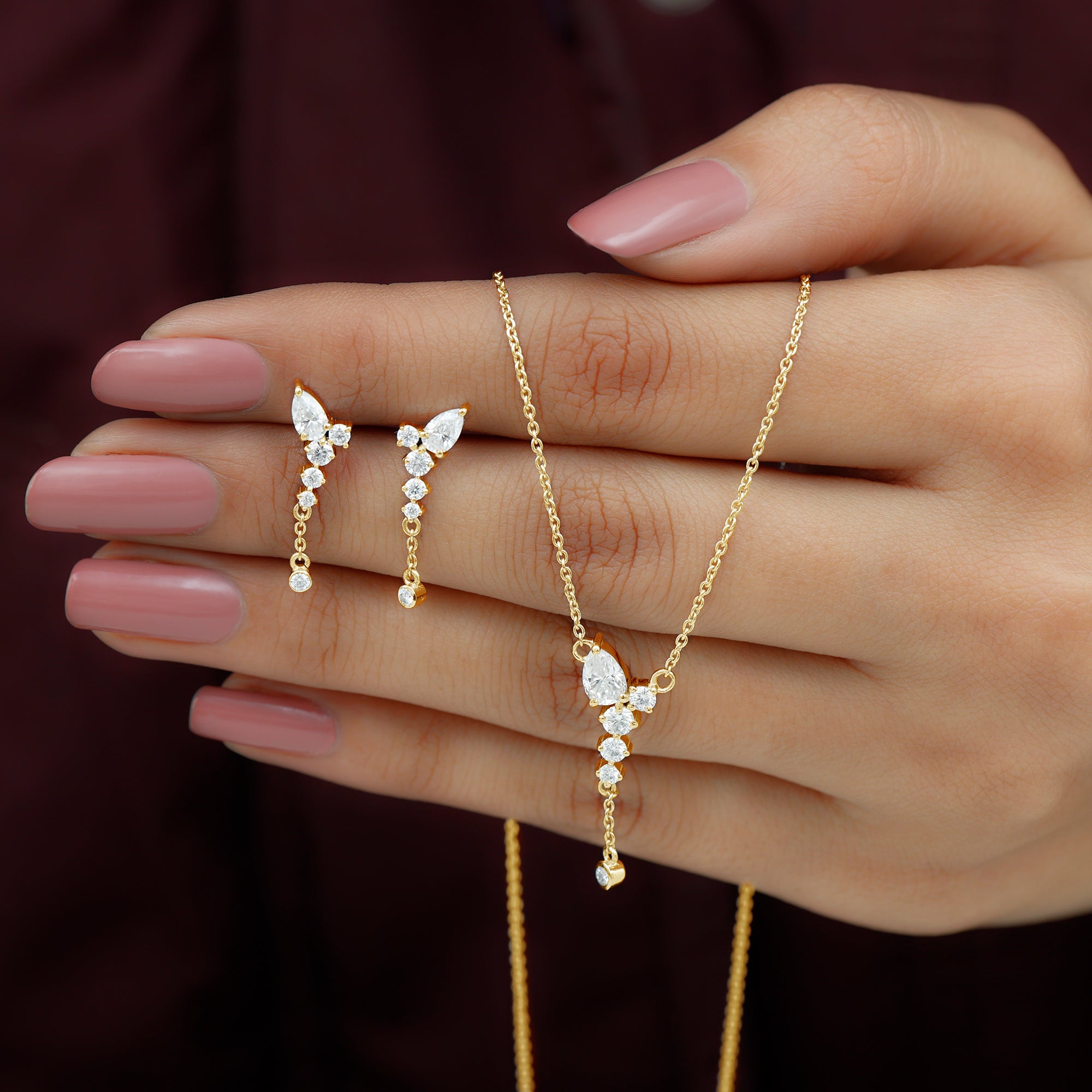 Celebrate the milestone of the relationship with a Diamond Earring and Necklace Set, which features Diamonds placed in the dripping style starting from the pear-shaped and round shape diamond dangled down in a Prong Setting with a Cable Chain. We at Rosec Jewels are committed to deliver Necklace sets with certified gemstones hence this Diamond Set is embedded with EF-VS Quality Diamonds. The earrings have a Screw back fitting which makes them comfortable to wear and pendant is dangled in the cable chain. This Sparkling Jewelry Set is perfect for expressing your love and gratitude towards your lady on the anniversary celebration.