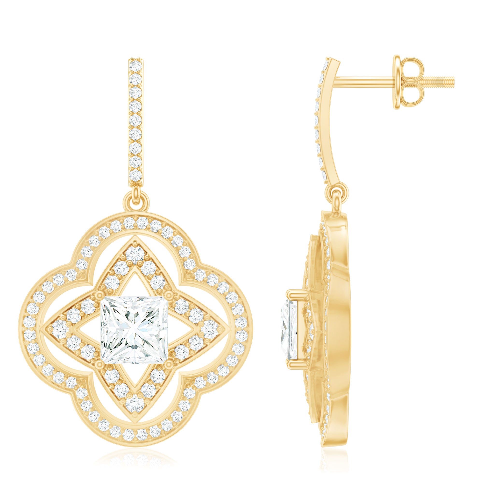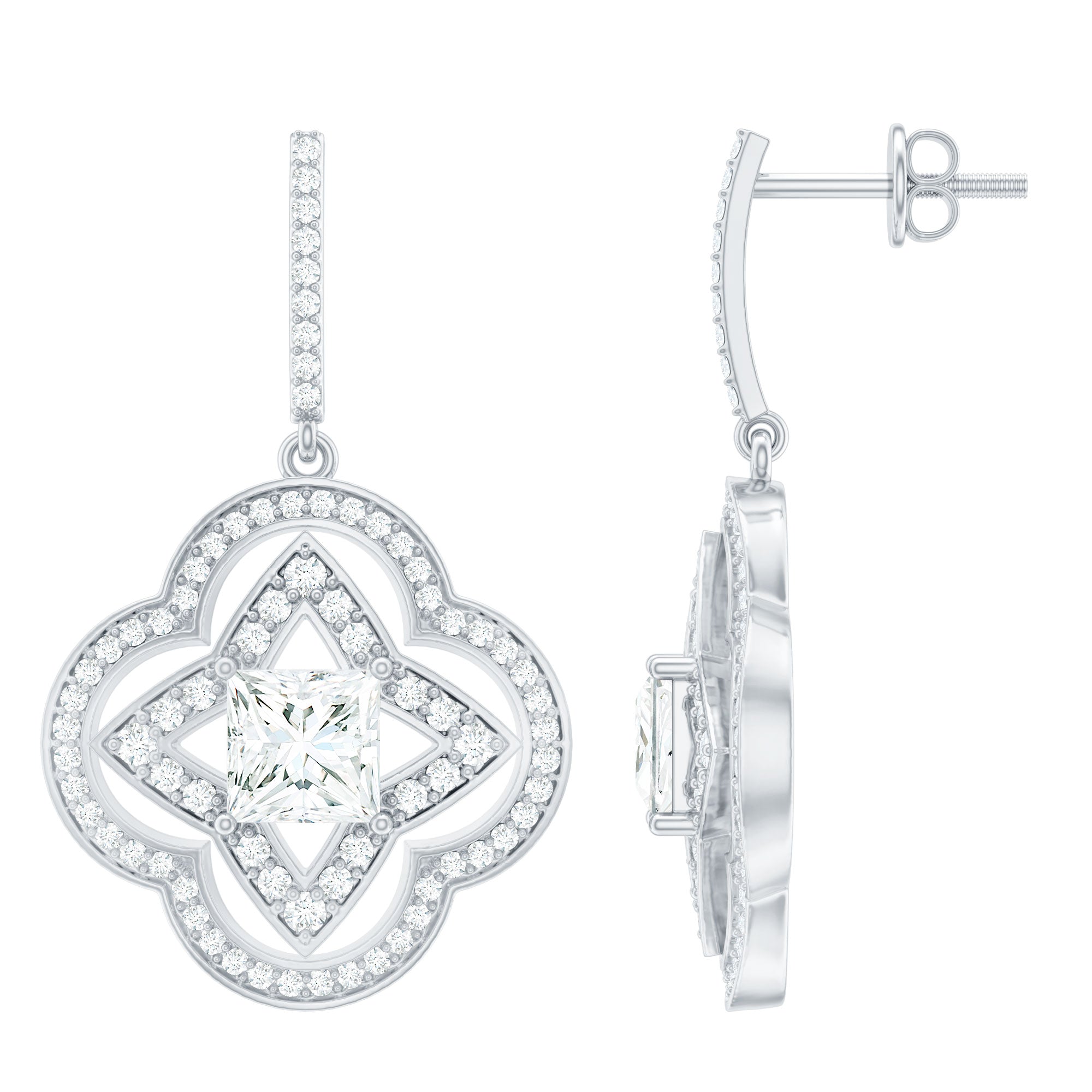 Adorn your ears with the ethereal beauty of these Floral Drop Earrings, adorned with sparkling 5 mm Princess cut diamond set in a secure prong setting in the center and surrounded with round shape Diamonds in a flower pattern. The Screw Back Closure ensures a secure and comfortable fit, perfect for any occasion. Embrace elegance with these Diamond Drop Earrings (Synthetic) that seamlessly blend sophistication and natures beauty. Crafted with an ethically sourced, eco-friendly Ef-Vs quality lab grown diamond and comes with a certificate of authenticity, its a thoughtful and budget friendly choice for an Anniversary gift or any meaningful occasion.