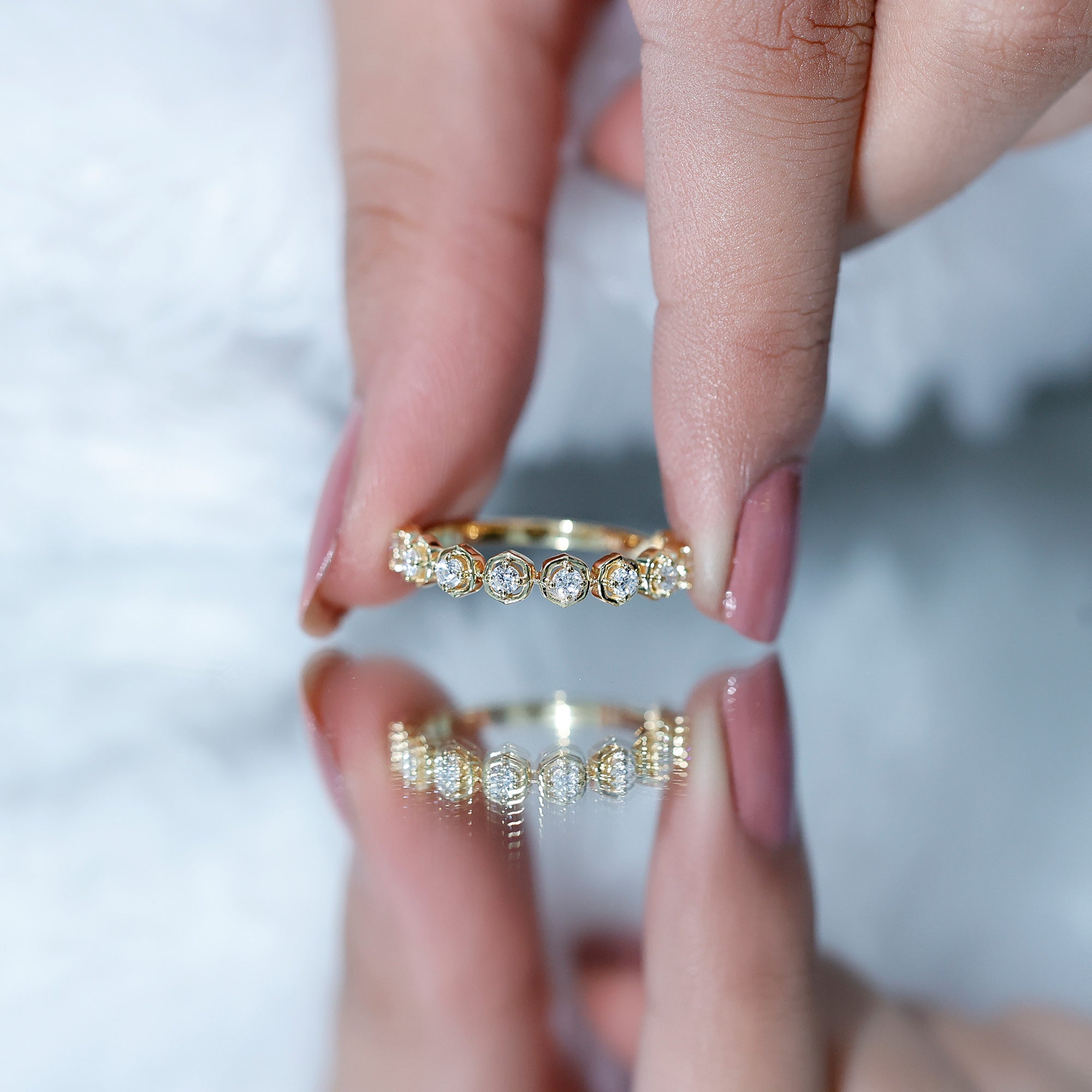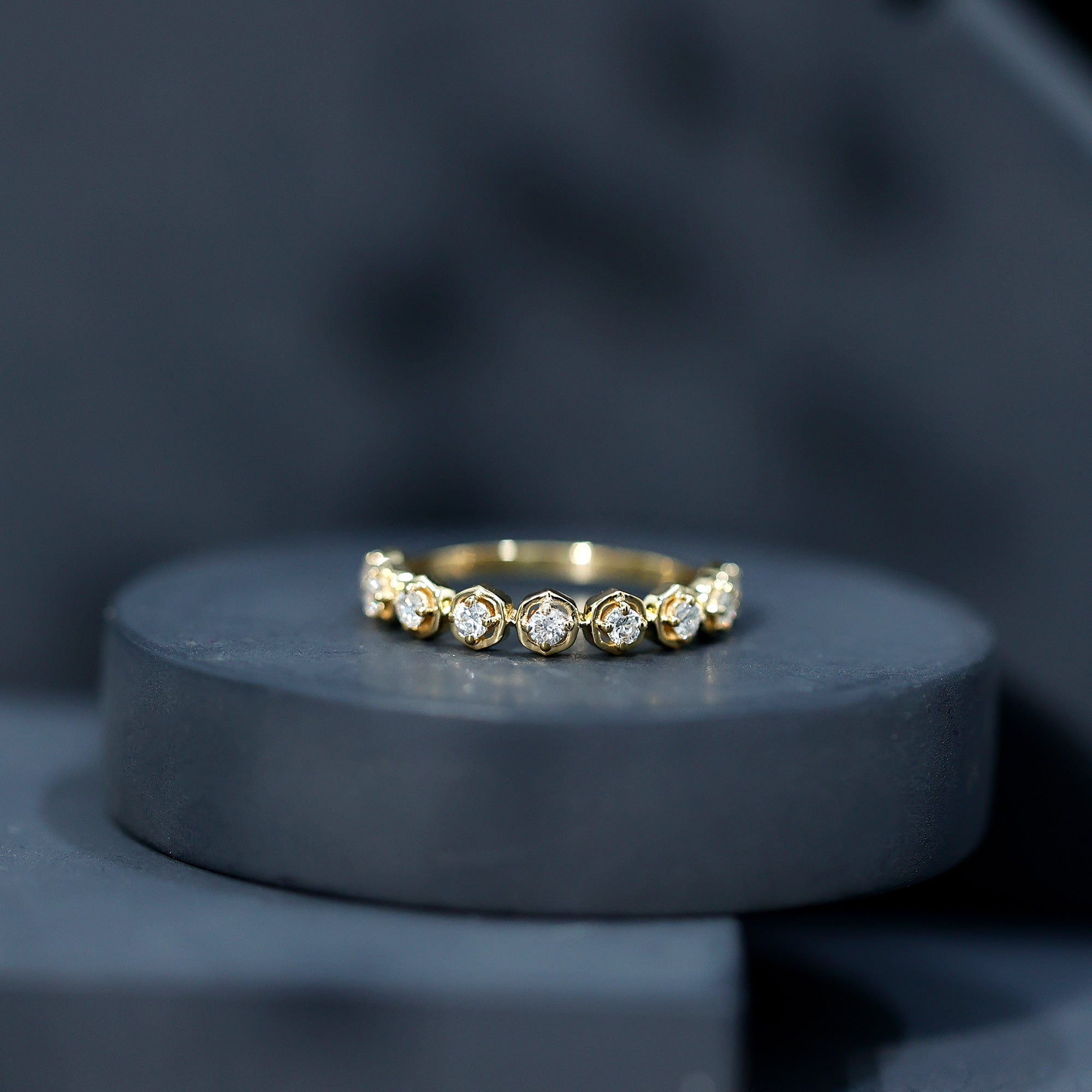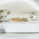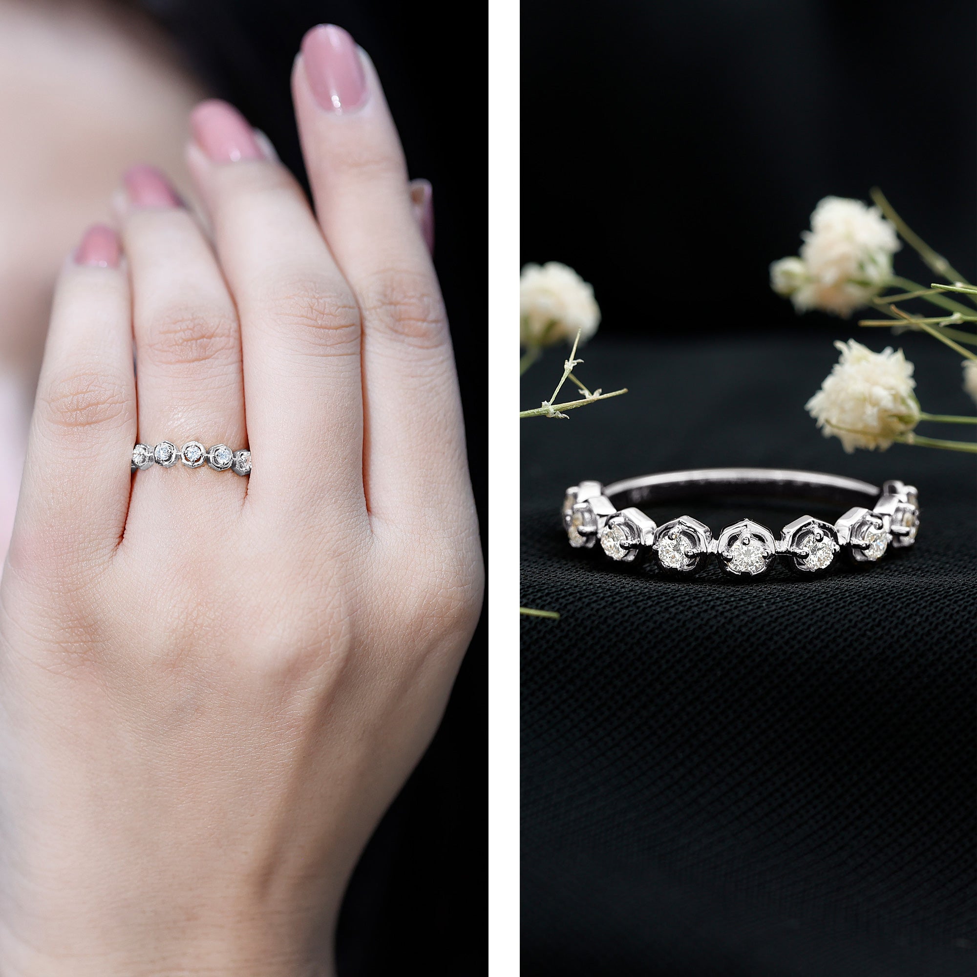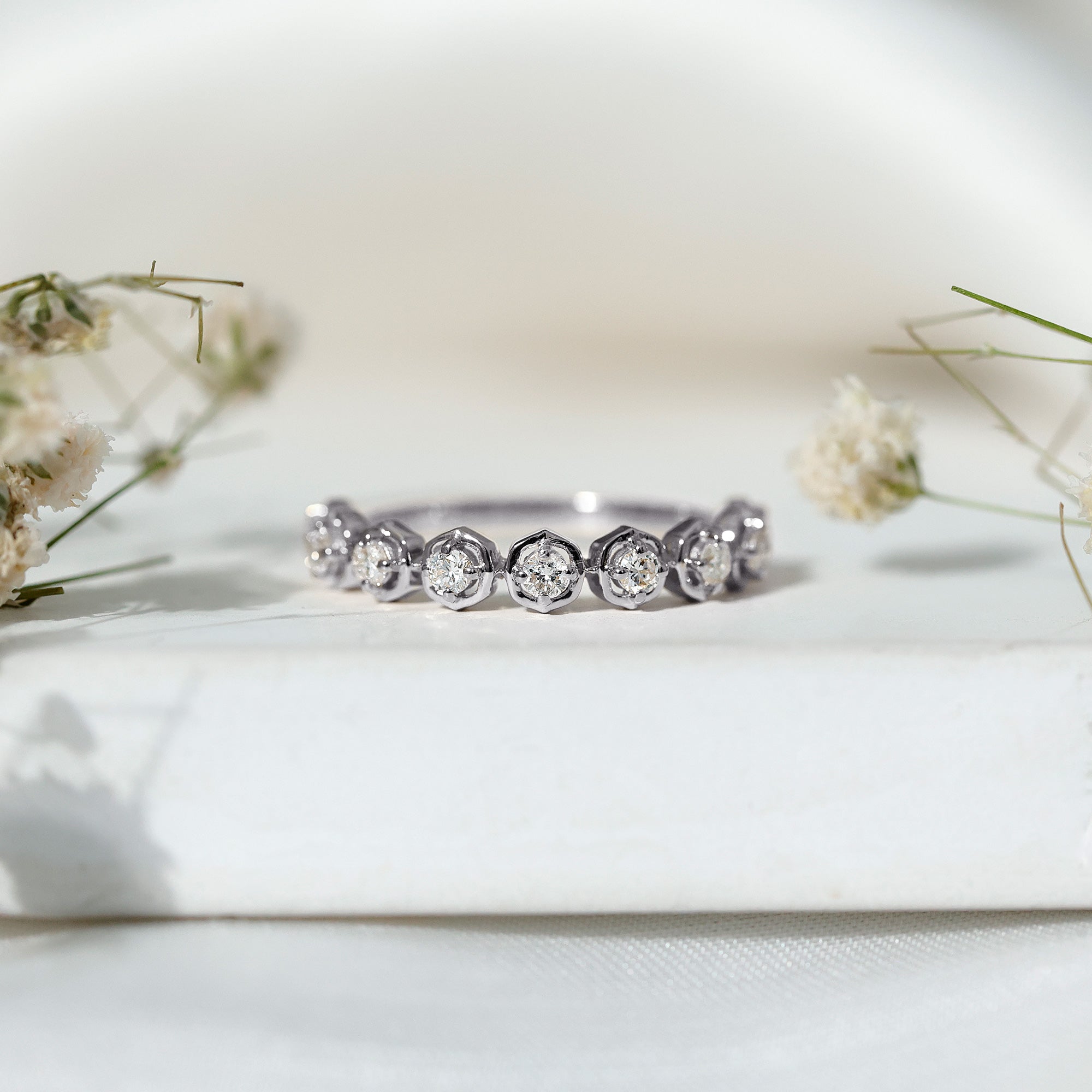 Simply stunning, this Diamond Half Eternity Ring is designed for the woman who loves minimalist pieces of jewelry but with a touch of modern elements. It is embellished with round cut diamonds (EF-VS quality), each set in prong setting and surrounded with open floral frames. The minimalist design adds a touch of natures beauty while keeping the Anniversary Ring lightweight and comfortable for everyday wear. Also, all the gemstones in this Diamond Flower Ring are lab made and certified and offer the same brilliance and durability as natural ones but are created in an eco-friendly and sustainable way, making this piece a responsible and stylish choice. Presented in a premium box, its the perfect choice for a moment youll cherish forever.