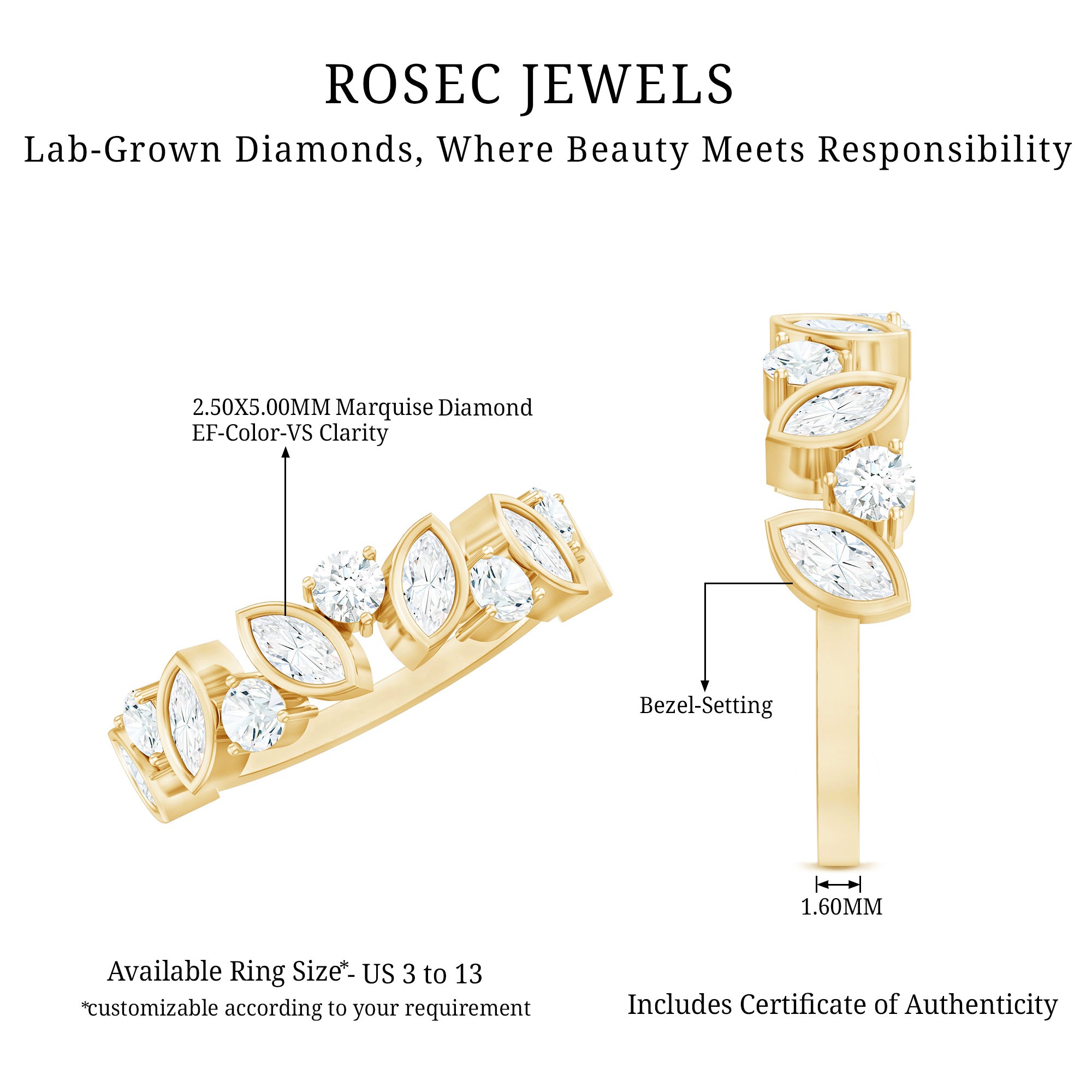 Our Diamond Anniversary Ring has a unique yet timeless aesthetic that will never go out of style. This Half Eternity Ring features marquise shaped diamonds in bezel setting and round shaped diamonds in prong setting, all set alternatively to create a unique piece of jewelry. This versatile piece pairs beautifully with another ring for a stacked look or can be worn solo as a statement of understated glamour. Plus, since the stones of this Diamond Eternity Ring are lab-grown, you get the luxury of fine jewelry without breaking the bank. This Minimalist Ring comes with a certificate of authenticity and a premium packaging box. If you are buying this as a gift for her, it is ready to be given the moment it arrives.