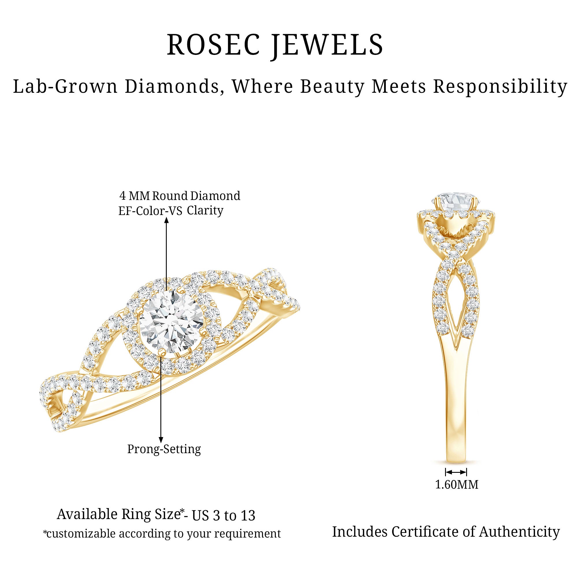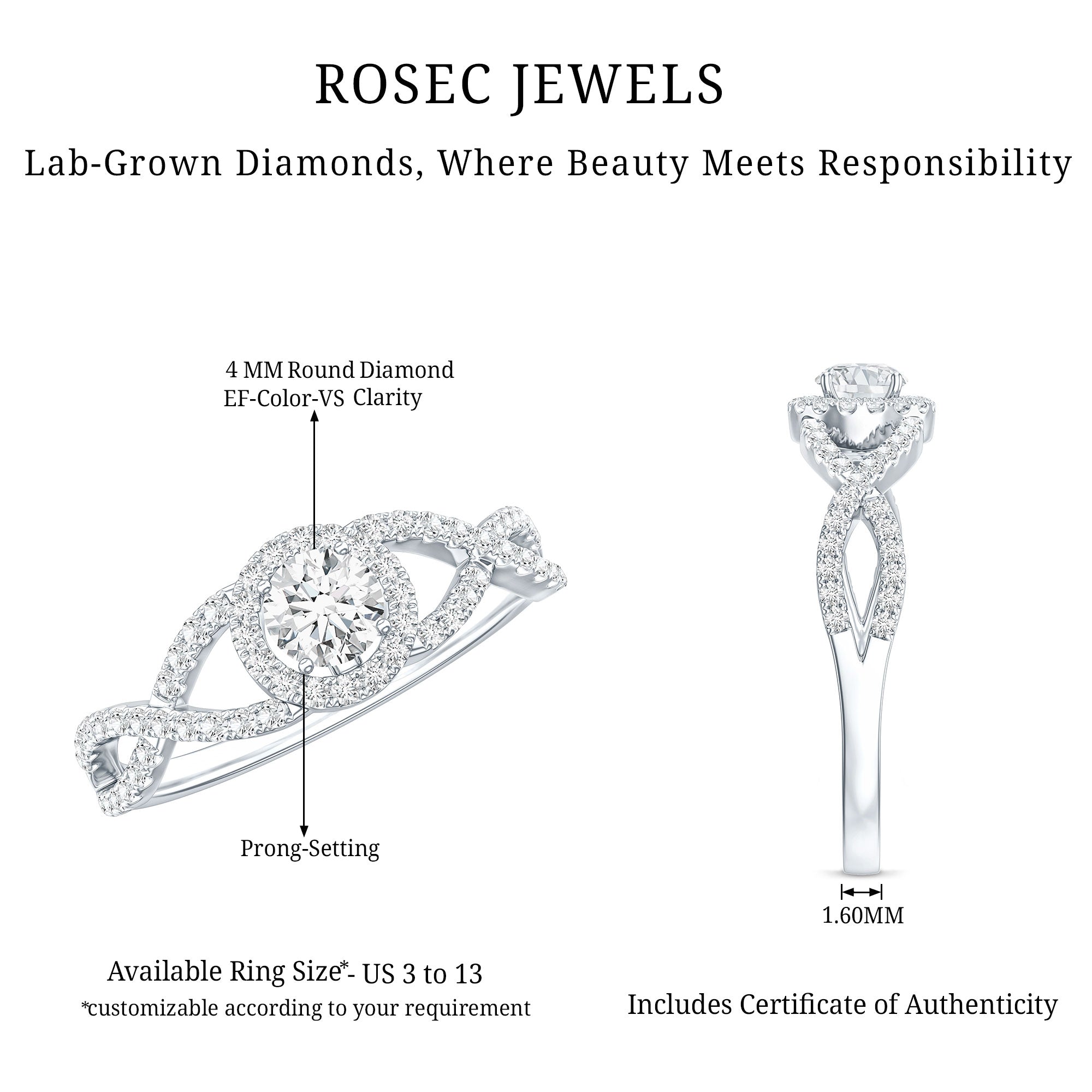 This stunning Criss Cross Engagement Ring is a masterpiece of elegance and brilliance, designed to add sparkle to her special day. At the center of the Halo Ring is a dazzling round-shaped Ef-Vs quality diamond, securely held in prong setting. Surrounding the center stone is a halo of sparkling gemstones, framing it like a radiant shield. The diamond-studded crossover shank gives this Round Engagement Ring a modern touch, symbolizing the intertwining of two lives. This piece is an affordable option for those looking for an exquisite April Birthstone Ring. The Lab Grown Diamond Ring is available in various metal color options to match your style and comes in different sizes to ensure the perfect fit.