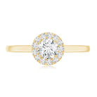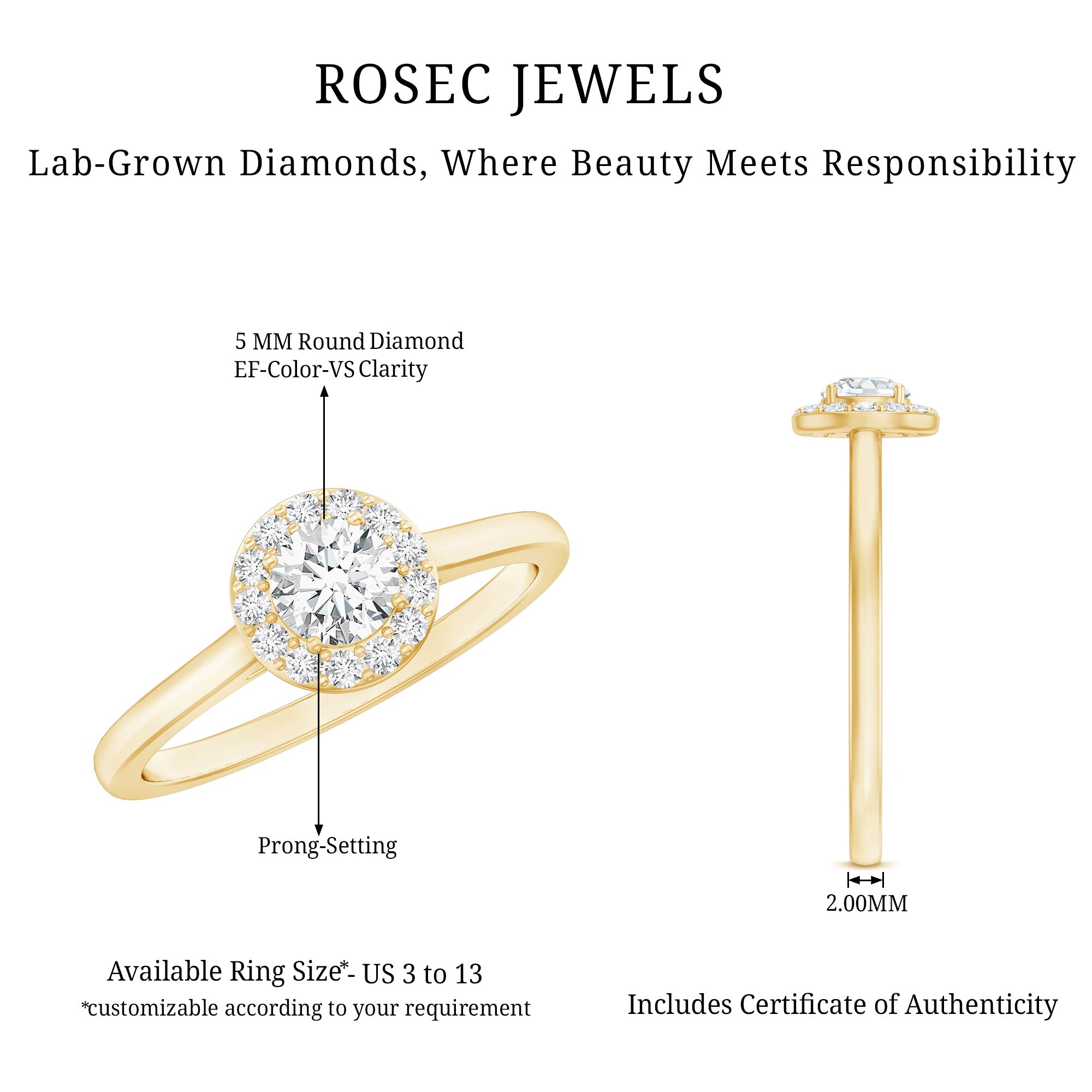 Big moments deserve big sparkle - this Diamond Engagement Ring is here to seal the deal with a flash of unmatched brilliance. This Promise Ring features a 5 MM round cut lab grown diamond set in the center in a secure prong setting encircled by a dazzling halo of dainty round cut stones. The sleek plain metal band of this Halo Engagement Ring allows the EF-VS quality diamonds to shine without distraction, embodying simplicity and sophistication in one. Whether you are planning a proposal or celebrating a milestone, this timeless beauty is designed to make the moment unforgettable. Get your hands on this April Birthstone Ring now and make your forever shine even brighter.