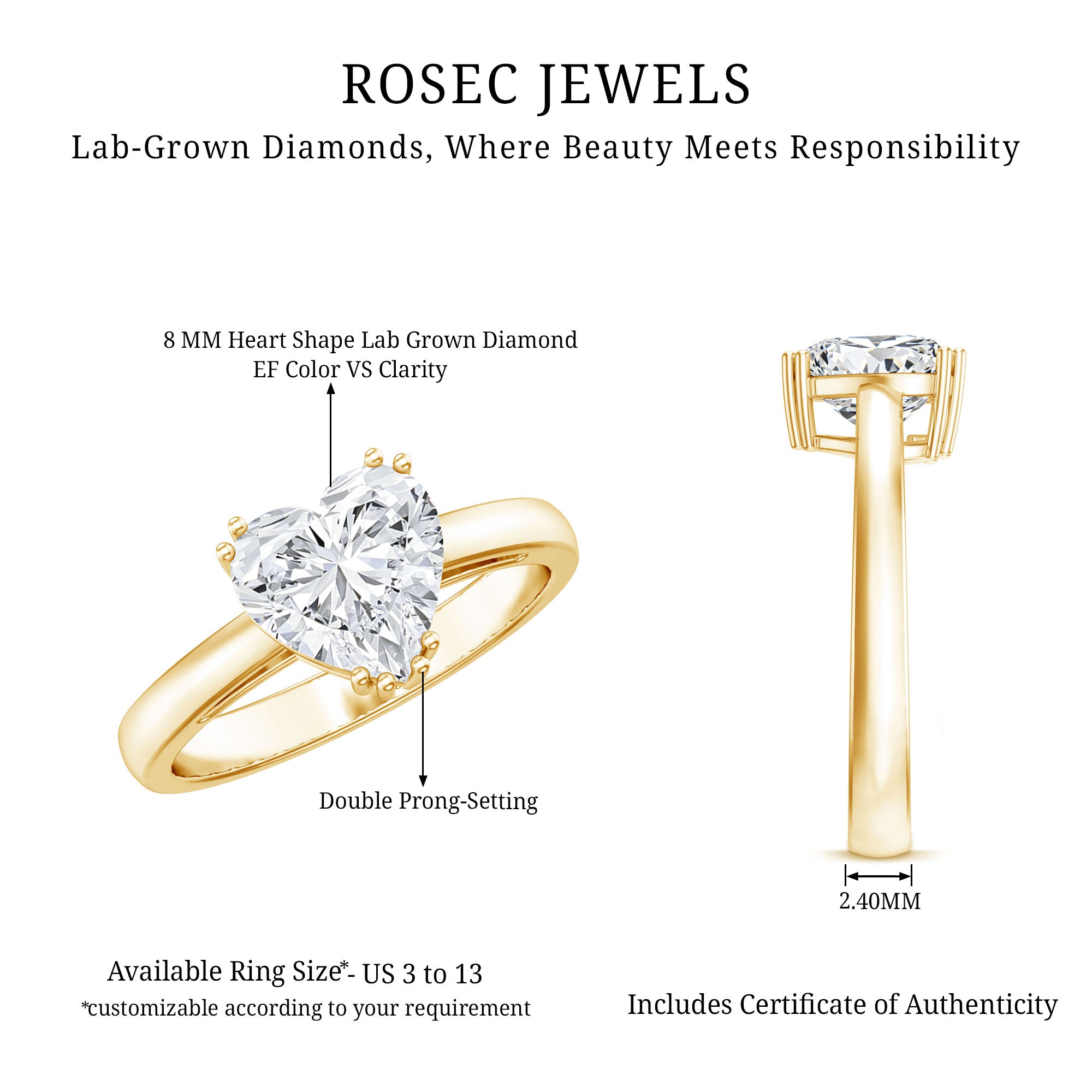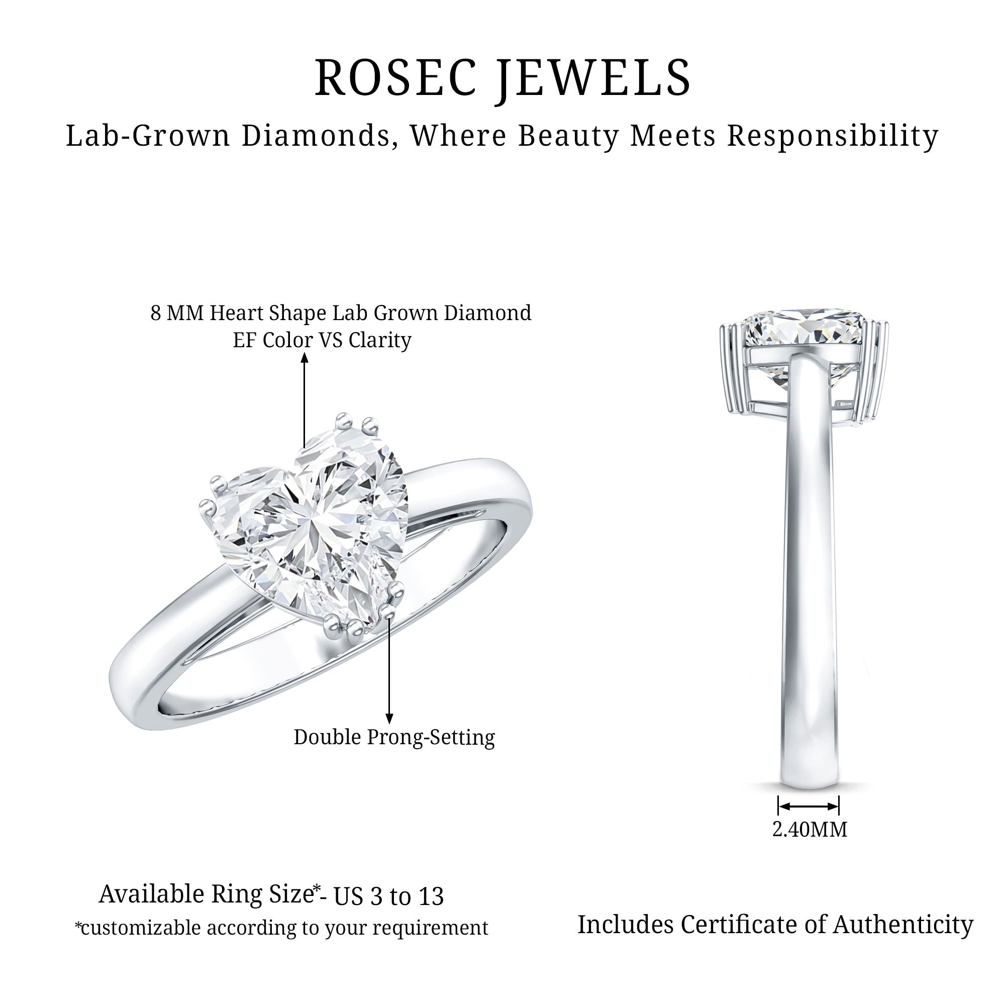 Surprise her by presenting this mesmerizing Heart Shape Engagement Ring and make her feel truly special. Crafted with perfection by Rosec Jewels, this Solitaire Ring features an 8 MM heart shape diamond of EF color and VS clarity, set in a secure double prong setting.