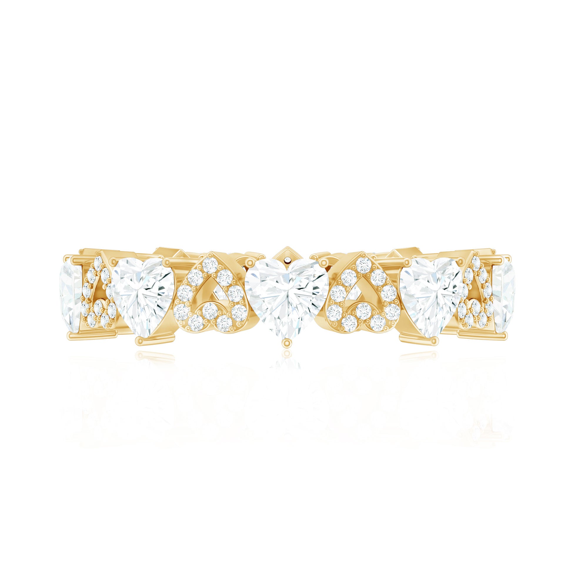 This Diamond Eternity Band Ring is curated to symbolize eternal love, where every heart and gemstone tells a story of forever. The design features heart shaped lab made diamonds and open heart shaped motifs adorned with small round cut diamonds, both the elements are set in an alternating pattern which adds a unique contrast of sparkle and elegance. This Full Eternity Ring ensures a seamless circle of beauty, making it a timeless treasure that radiates grace from every angle. This Heart Wedding band is a versatile statement piece that can be worn solo for a sophisticated and elegant look or stacked with another ring to create a personalized and stylish stack.