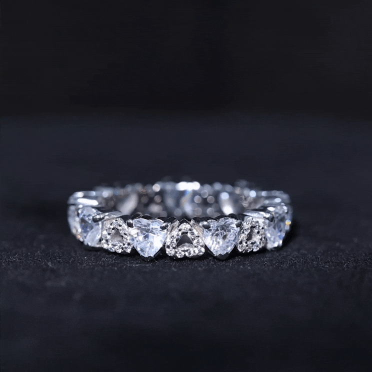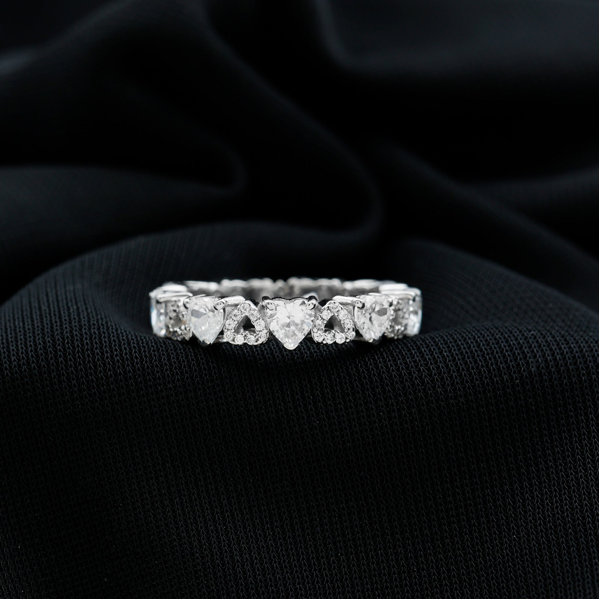 This Diamond Eternity Band Ring is curated to symbolize eternal love, where every heart and gemstone tells a story of forever. The design features heart shaped lab made diamonds and open heart shaped motifs adorned with small round cut diamonds, both the elements are set in an alternating pattern which adds a unique contrast of sparkle and elegance. This Full Eternity Ring ensures a seamless circle of beauty, making it a timeless treasure that radiates grace from every angle. This Heart Wedding band is a versatile statement piece that can be worn solo for a sophisticated and elegant look or stacked with another ring to create a personalized and stylish stack.