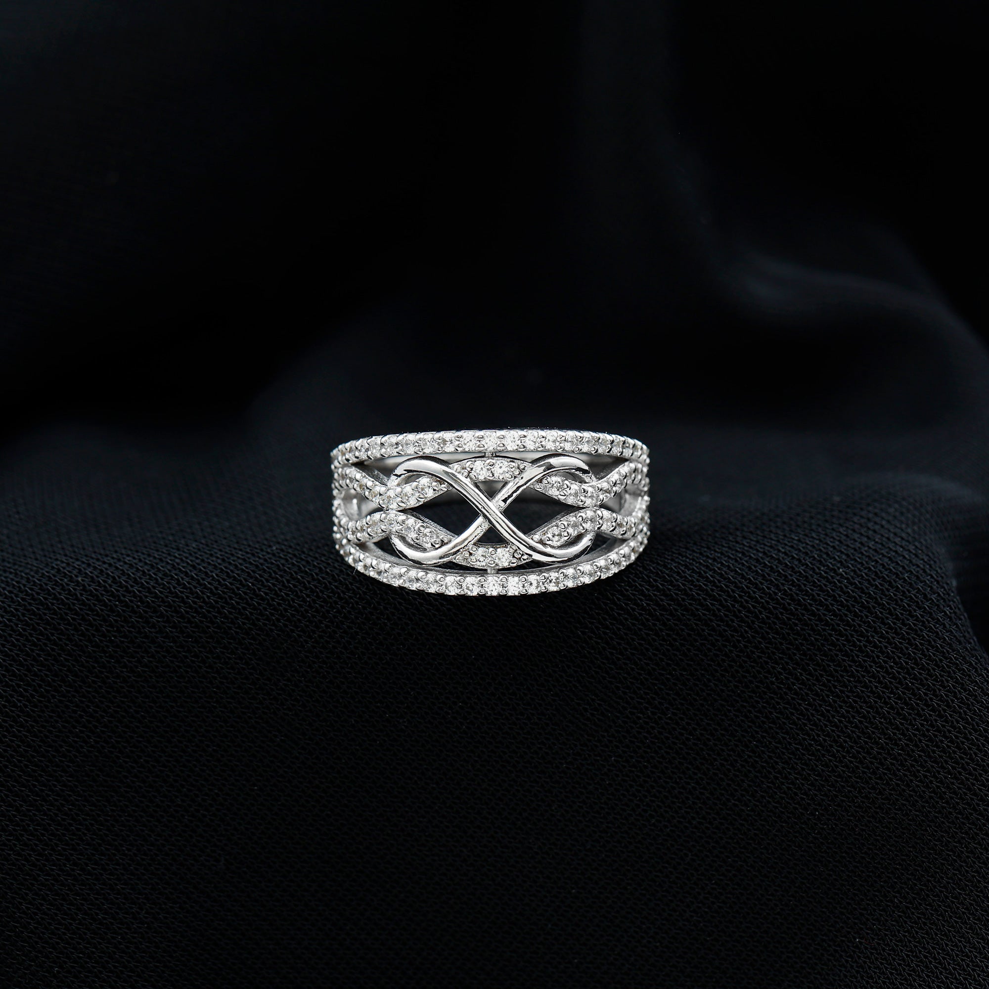 The infinity pattern is carefully formed to create a fluid, uninterrupted silhouette. Lab grown diamonds are set within the design to enhance light reflection while maintaining clean lines. The structure is crafted to sit comfortably along the finger, supporting daily wear without compromising elegance.