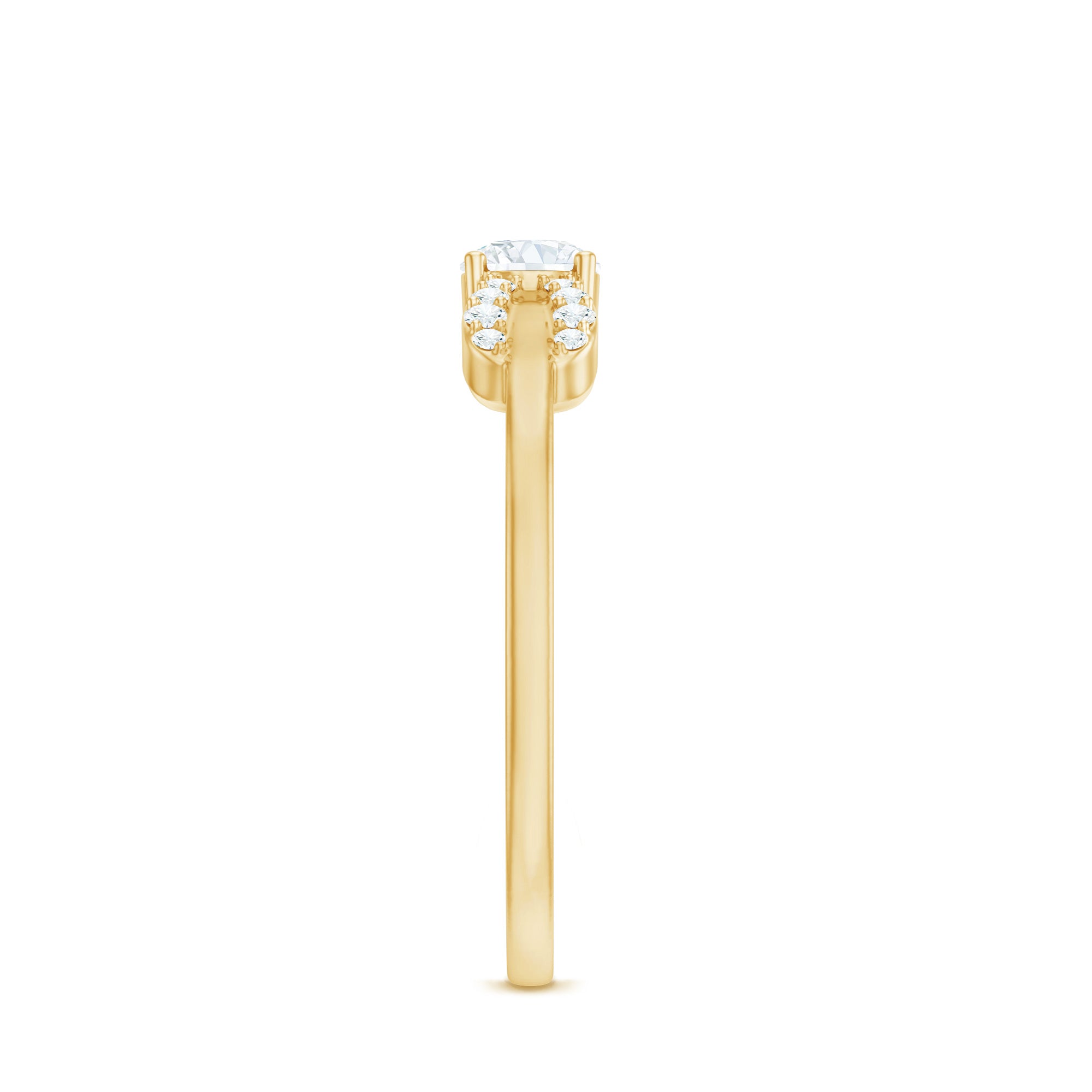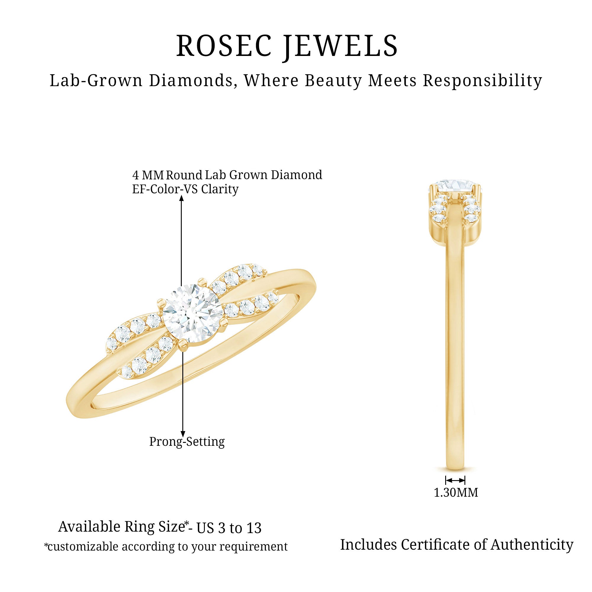 Take her heart away with the stunning details of this Promise Engagement Ring featuring a stunning 4 MM round shaped lab grown diamond gemstone of EF-VS quality set as a centerpiece in prong setting. On either side, shimmering smaller diamonds are arranged perfectly, creating a bow like pattern. This Diamond Promise Ring will surely be the right choice for her, something she will always keep close to her heart. Meticulously created by Rosec Jewels, this Round Diamond Ring blends modern innovation with classic beauty, ensuring a unique and ethically sourced symbol of your everlasting love.