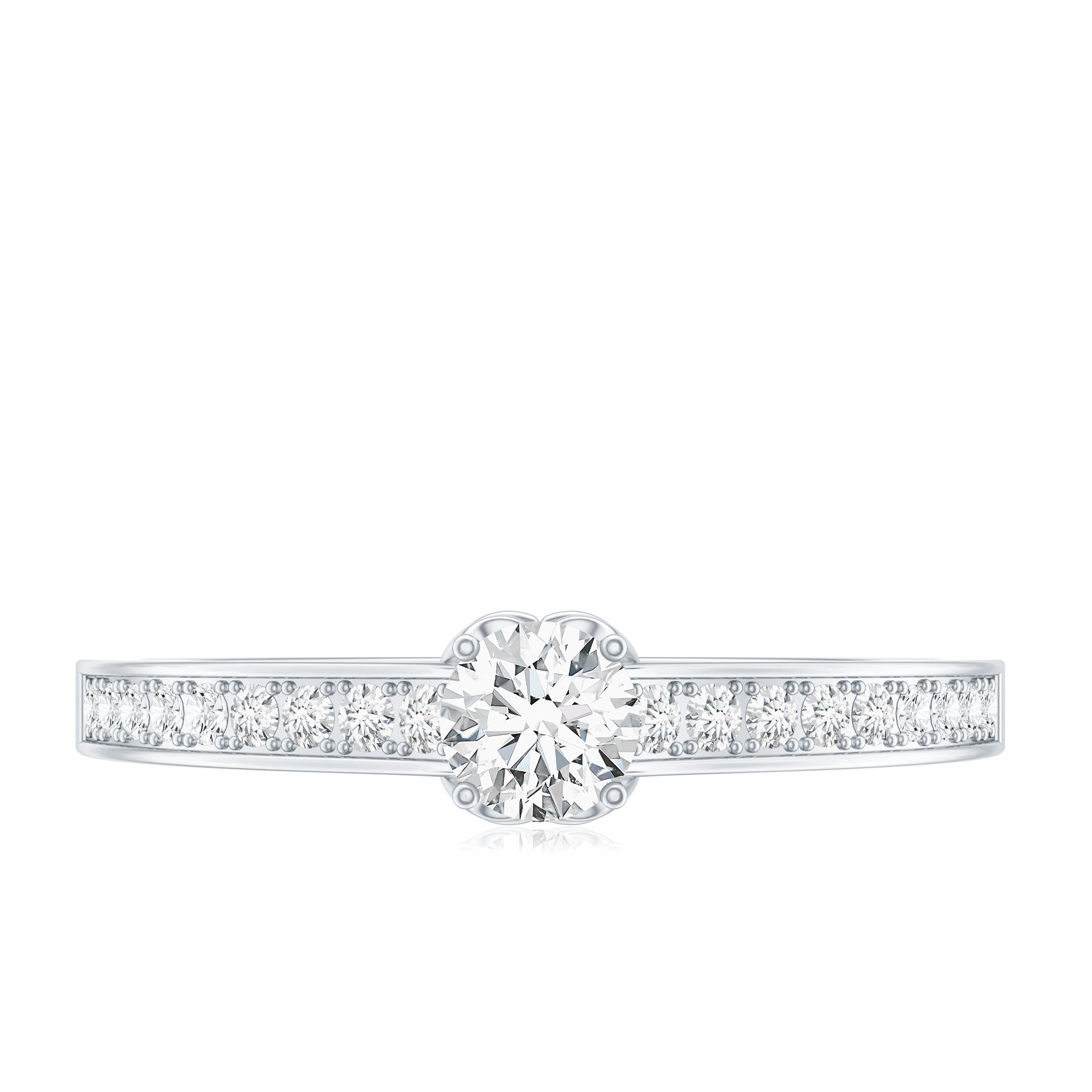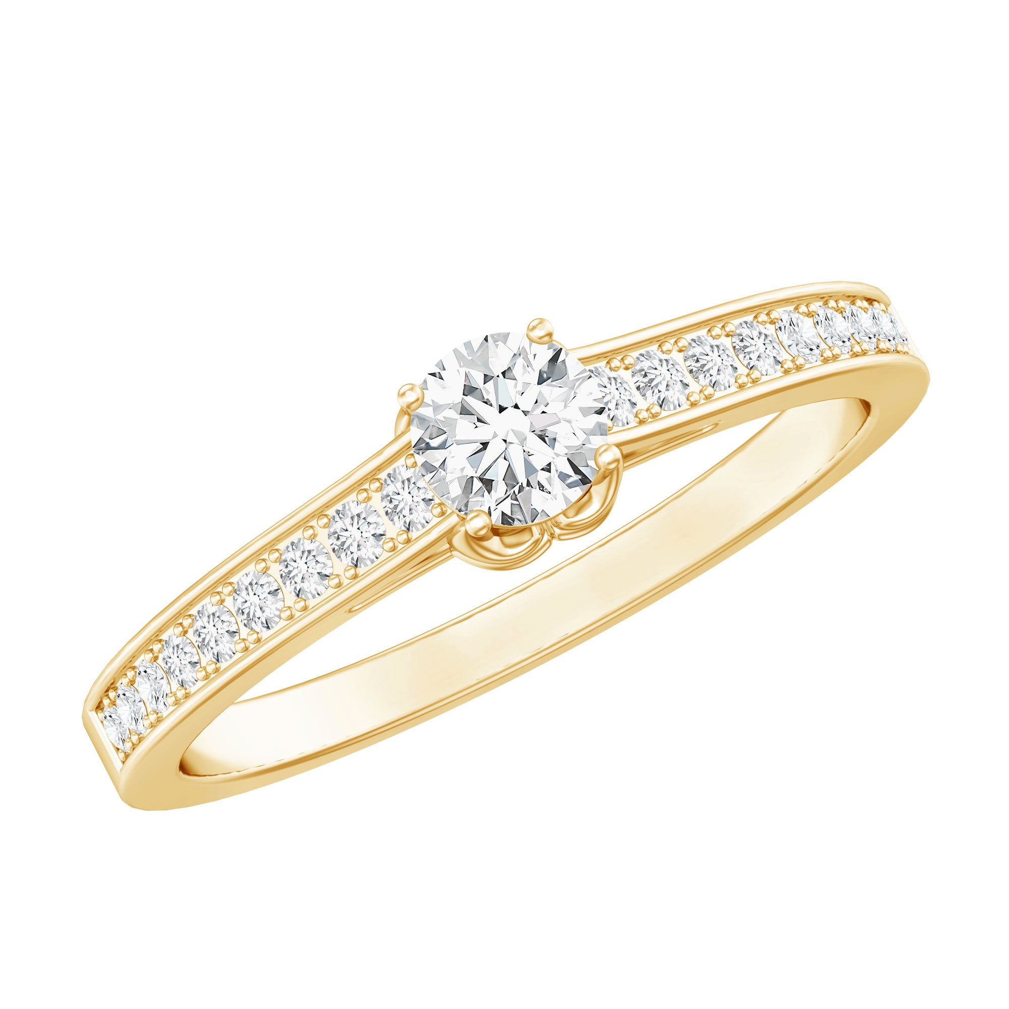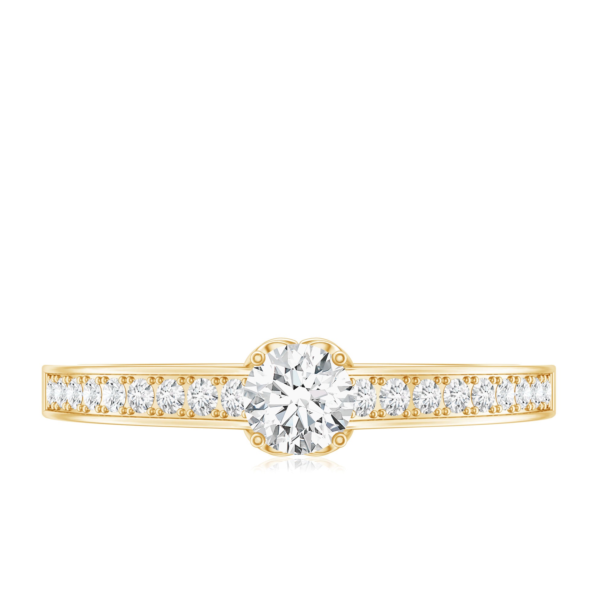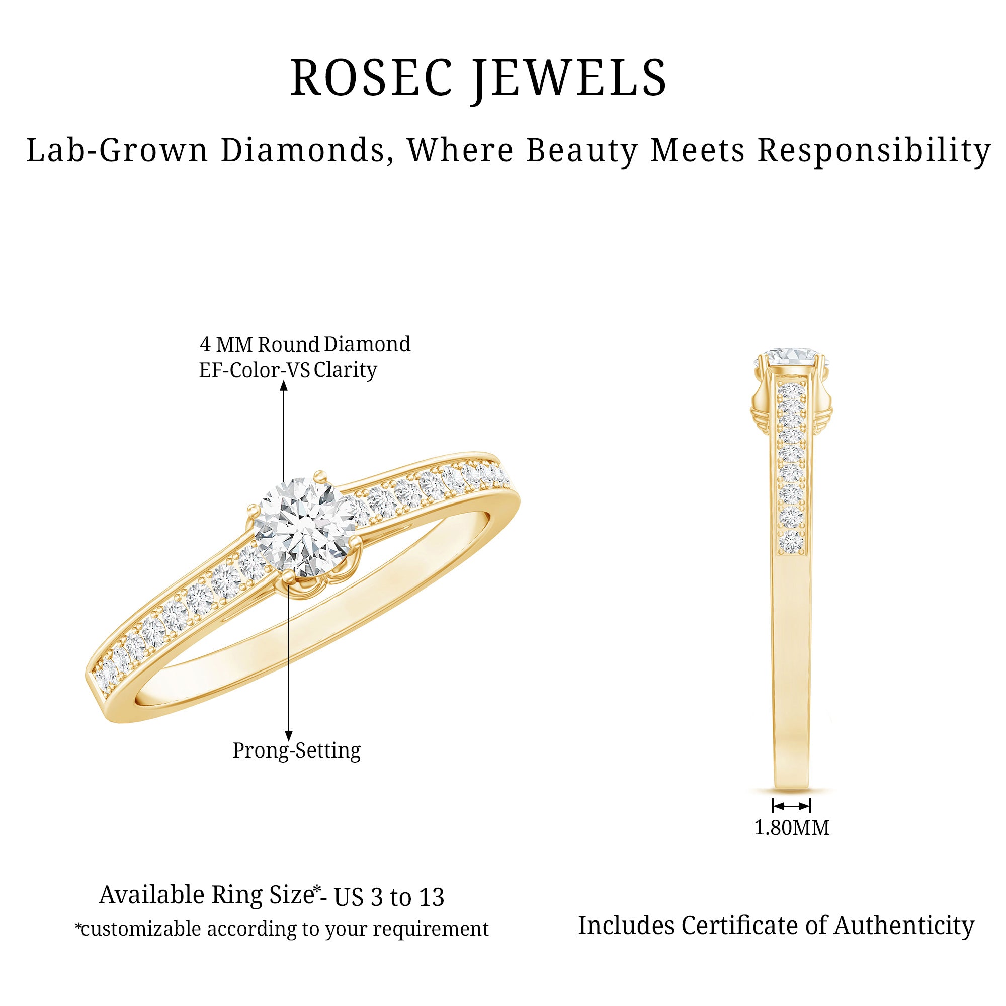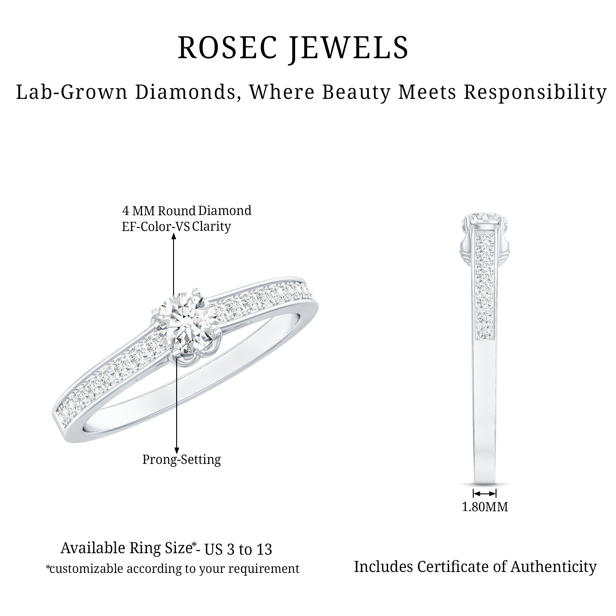 Simple in style this Lab Grown Diamond Ring embodies elegance with its timeless design. Featuring a 4 MM Round Shaped Lab Grown Diamond in Prong Setting with the round petite diamond decorated as side stones. Breathtakingly beautiful this Minimal Diamond Ring lets you keep in the spotlight exuding a subtle beauty. Perfect for those who appreciate minimalist style, this Diamond Promise Ring showcases the brilliance and radiance of an EF-VS Quality Lab Grown Diamond, symbolizing the pure, enduring love between two people. people. Its elegant simplicity makes it an ideal choice for brides who prefer a delicate, timeless piece of jewelry.