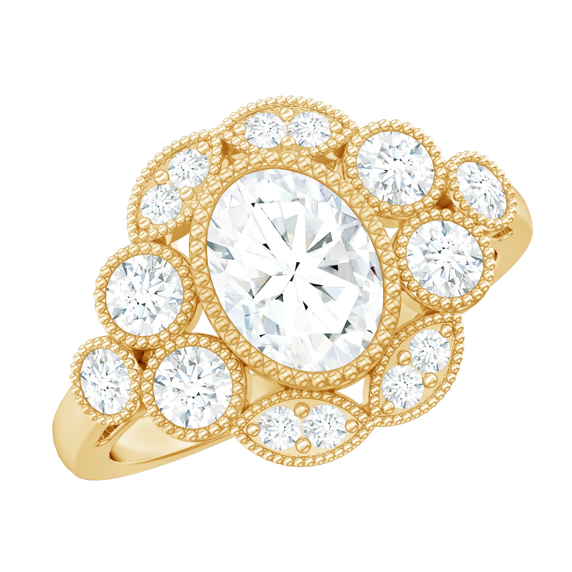 Capture the heart of your beautiful lady love with this exquisite Vintage Style Engagement Ring. Its charm knows no bounds, featuring a stunning 6X8 MM Oval Cut Diamond (lab created) nestled in a beaded bezel setting at the center. The Statement Engagement Ring is further adorned with a halo of Round Diamond stones and beaded detailing surrounding each stone. If you are looking for a piece of jewelry that is affordable and ethically made then this Oval Diamond Engagement Ring is ideal. Whether your women is a vintage charmer or a romantic soul who wants a piece of jewelry that compliments every moment of you two, then this Halo Ring will surely add a unique touch to her style.