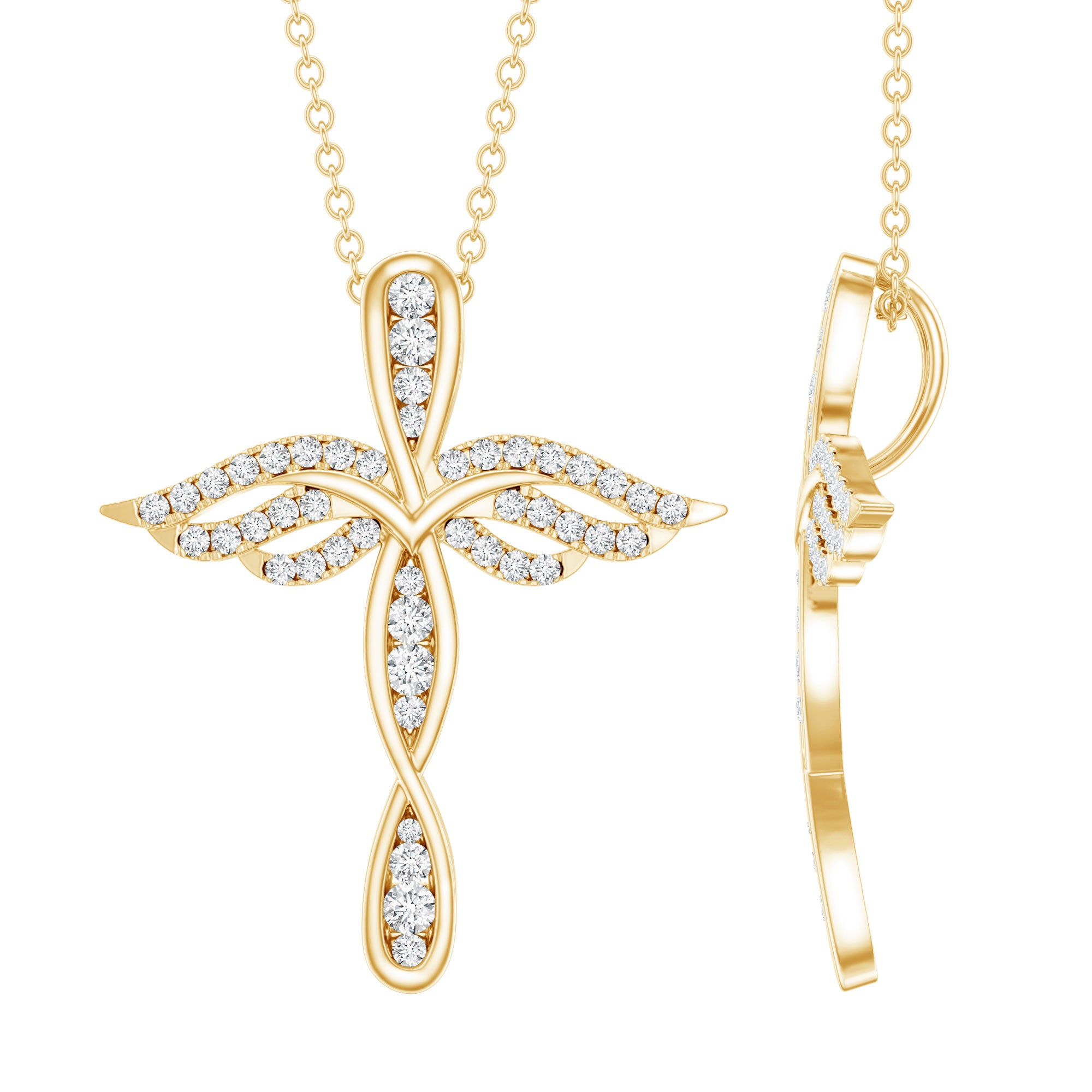 This gorgeous Cross Pendant is more than just a piece of jewelry, it is a powerful symbol of love and faith. Inspired by the graceful wings of an angel, the strength of the cross, and the endless flow of the infinity symbol, this design brings deep meaning with stunning sparkle. The Diamond Pendant Necklace features a cross shaped structure, with each arm shaped like delicate feathers, and the center is graced with an infinity loop. This Cross Infinity Necklace is covered in brilliant round cut lab made diamonds in pave setting, making it shine beautifully from every angle. A hidden bail allows the Meaningful Necklace to look like it is floating effortlessly. Whether you wear it solo or stack it with another necklace, this definitely turns every head.