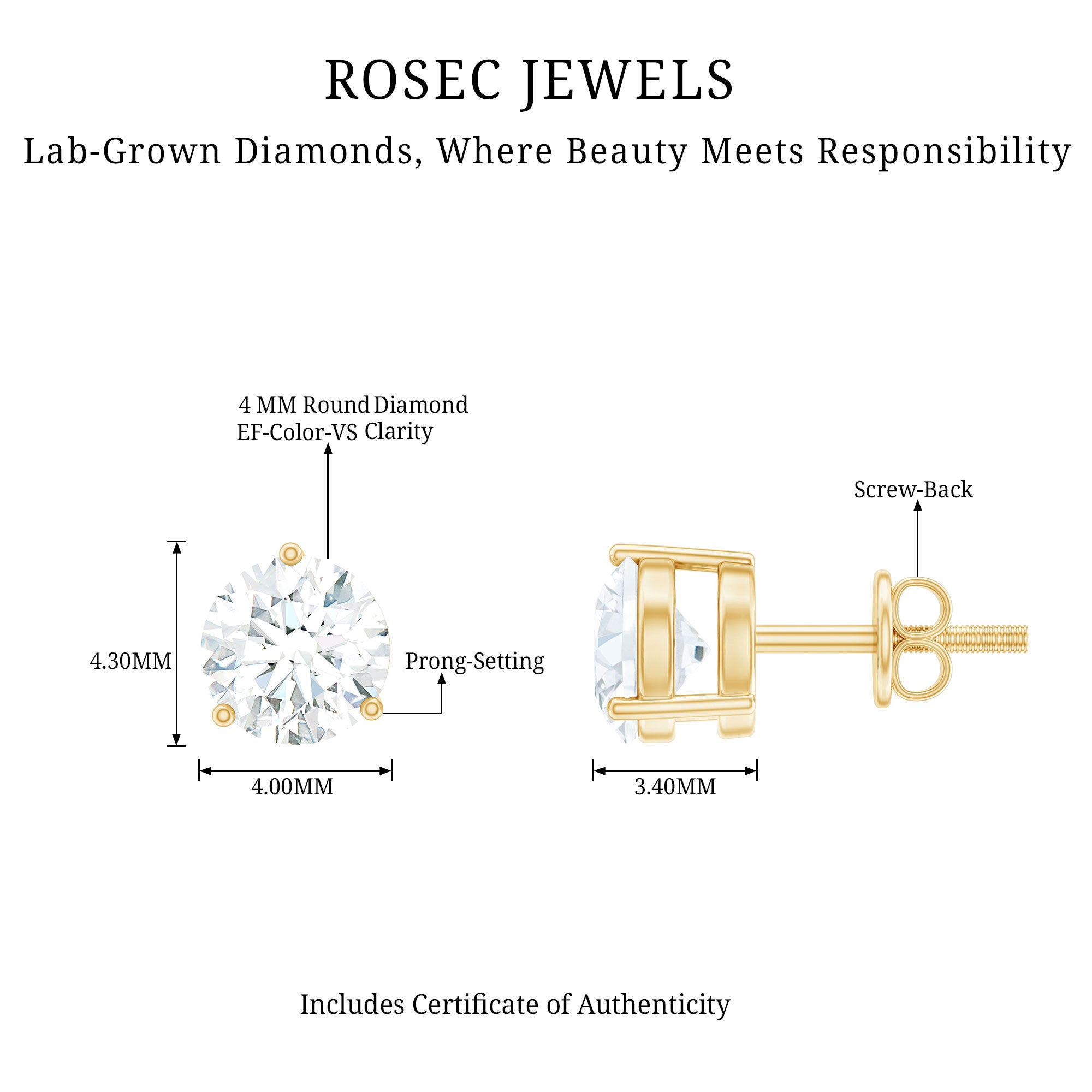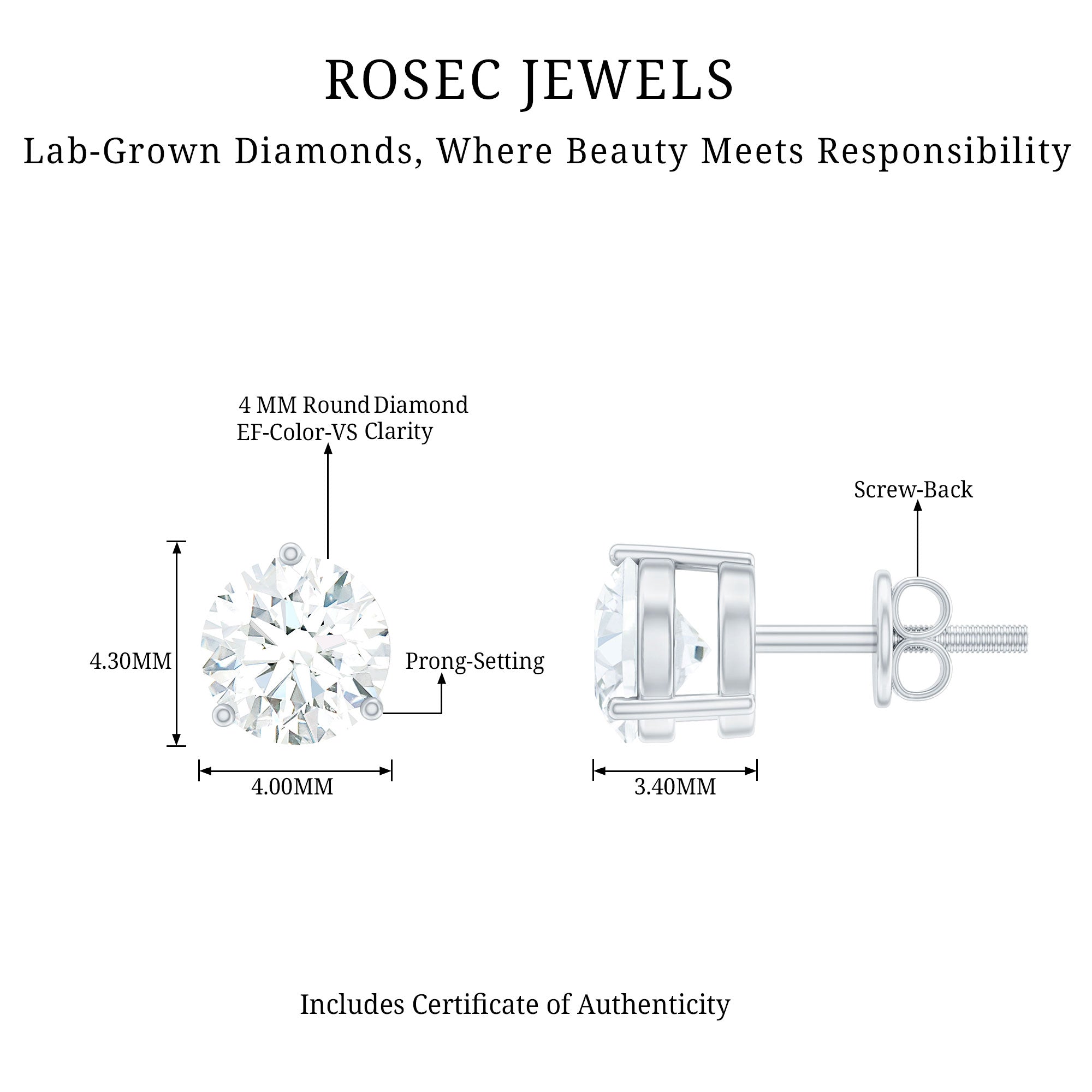 Appreciate her existence in your life with these Diamond Studs, featuring a 4 mm Round Shape Lab Grown Diamond in 3 Prong Setting. This Solitaire stud will leave her astonished with the shine of EF-VS quality diamonds. These Round Studs will stay in place throughout the time they are being adorned with the safe and secured Screw Back Closure. These Diamond Stud Earrings are dainty yet eye catchy which will make her the center of attention.