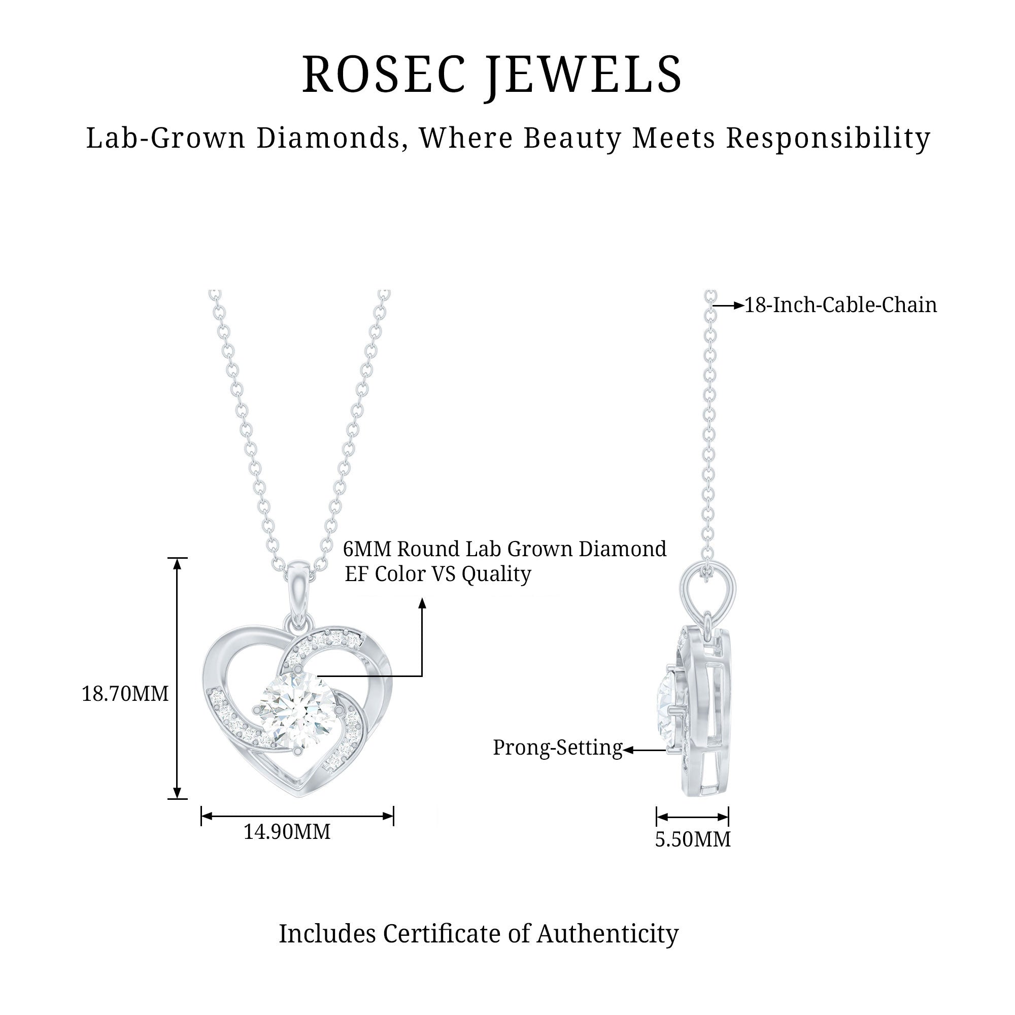 Surprise her with elegance embodied in this unique Lab Grown Diamond Necklace. This Heart Pendant features a 6 MM Round Shape Diamond (Lab Grown) as a centerpiece set in a prong setting, the open heart shape is accentuated by delicate gemstones. This EF-VS quality Diamond Heart Necklace reflects timeless beauty while aligning with Rosec Jewels commitment to environmental responsibility. It comes packaged in a premium storage box, making it ideal for gifting on special occasions like anniversaries, birthdays, Mothers Day, or Valentines Day. A gift as unique and radiant as your loved one.